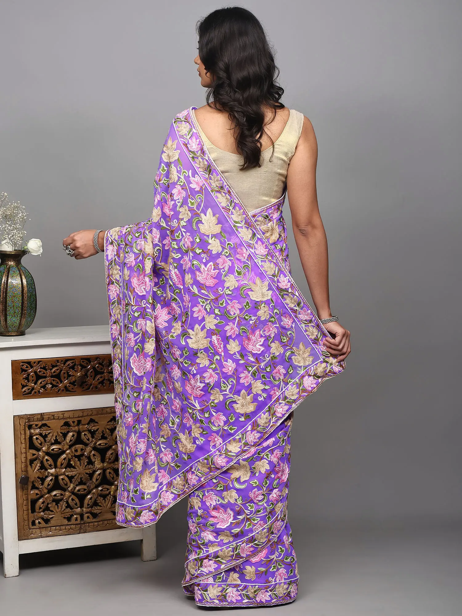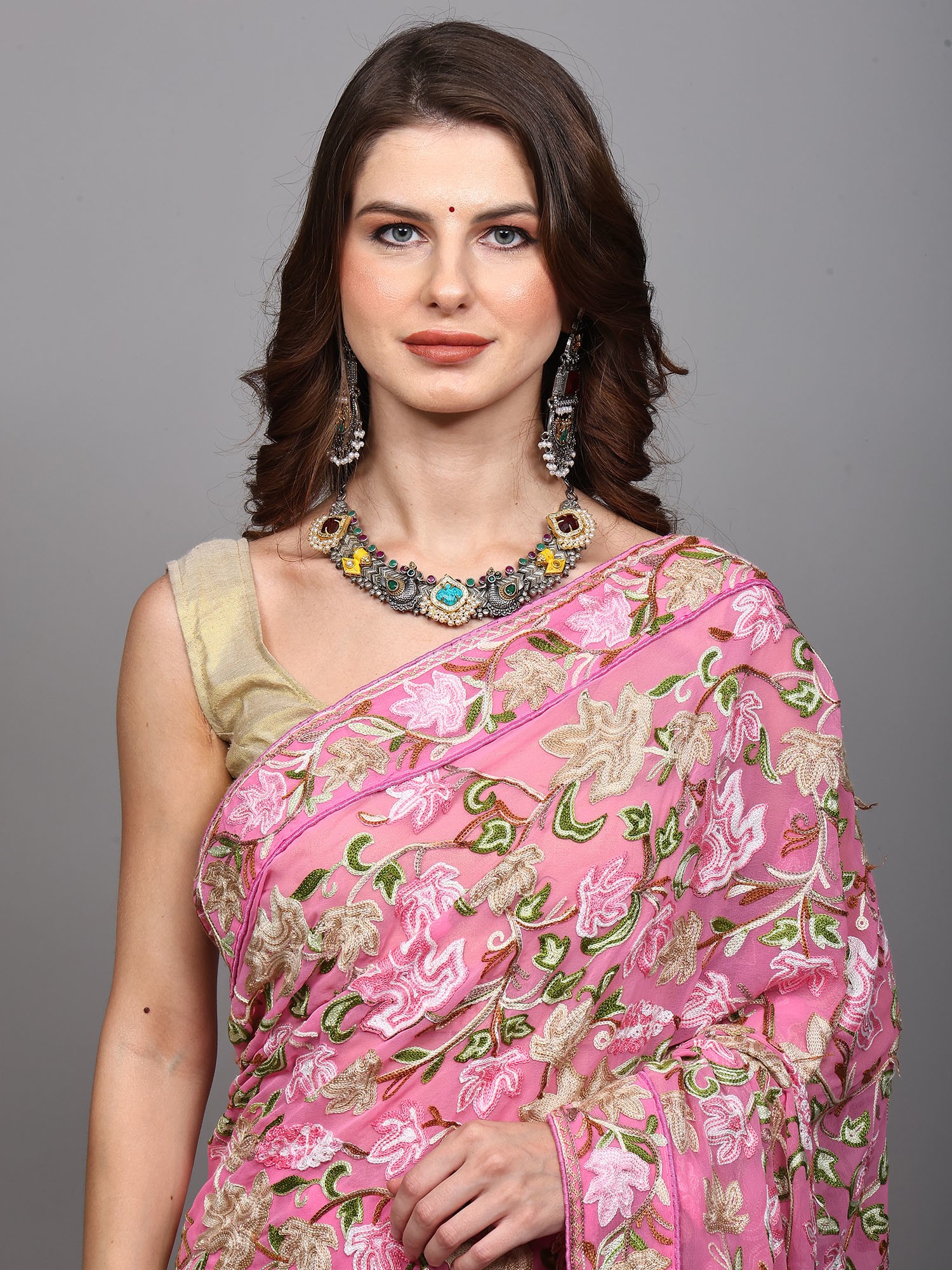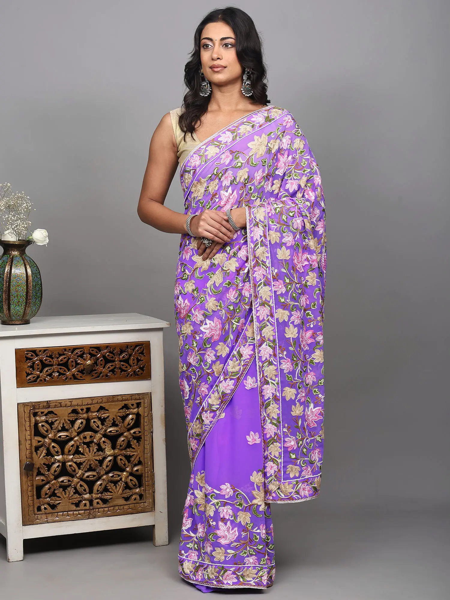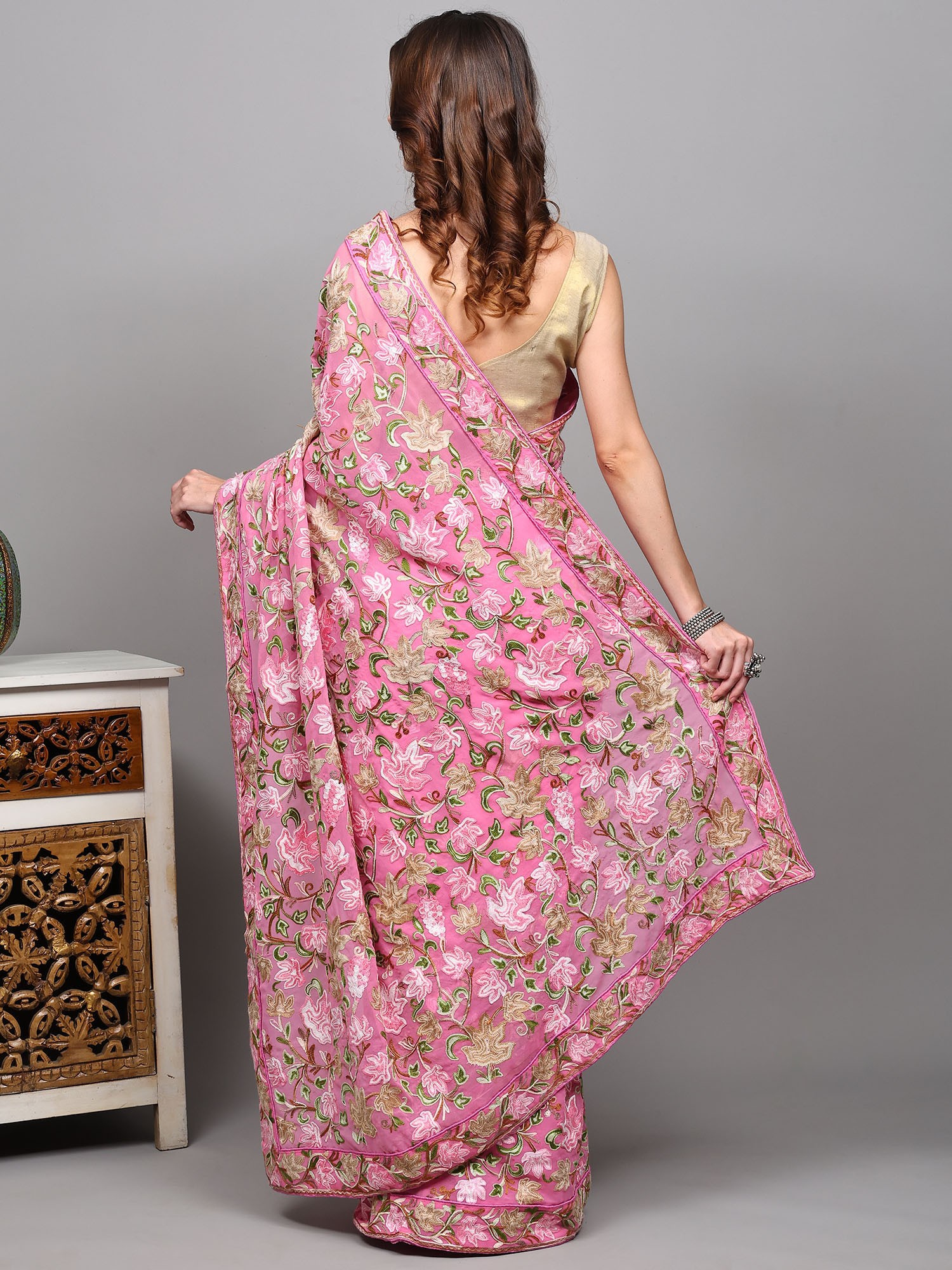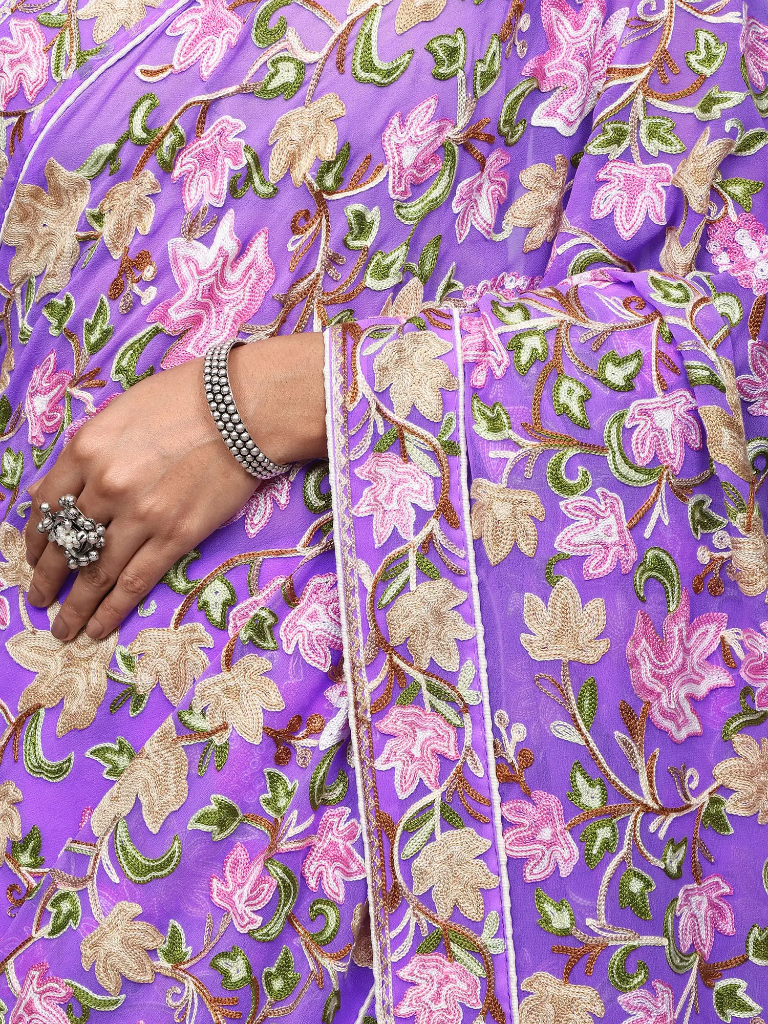 Spectra-Green Georgette Saree from Kashmir with Aari Embroidered Floral Motifs