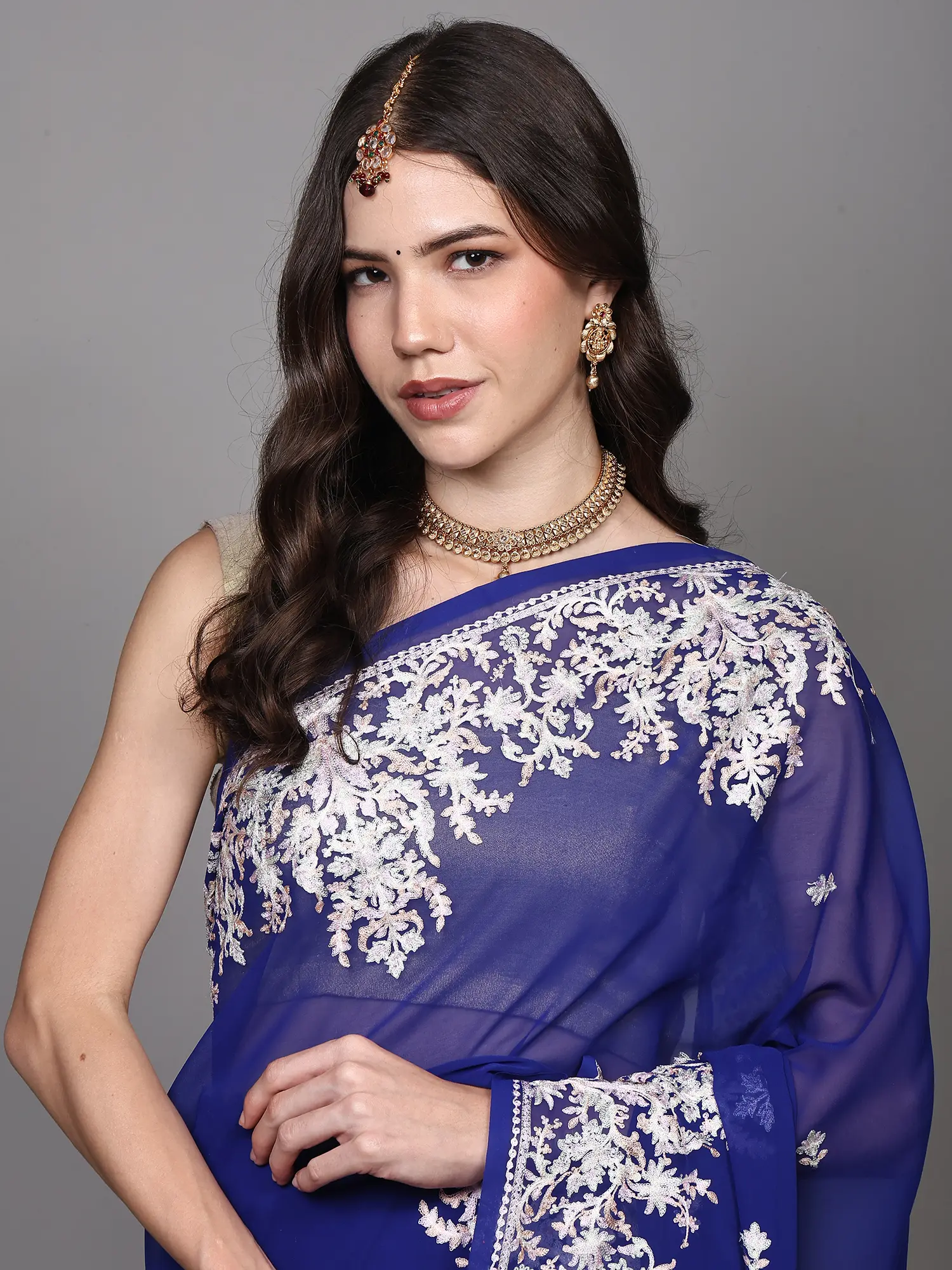 Royal-Purple Georgette Saree with Parsi Embroidered Roses on Border
