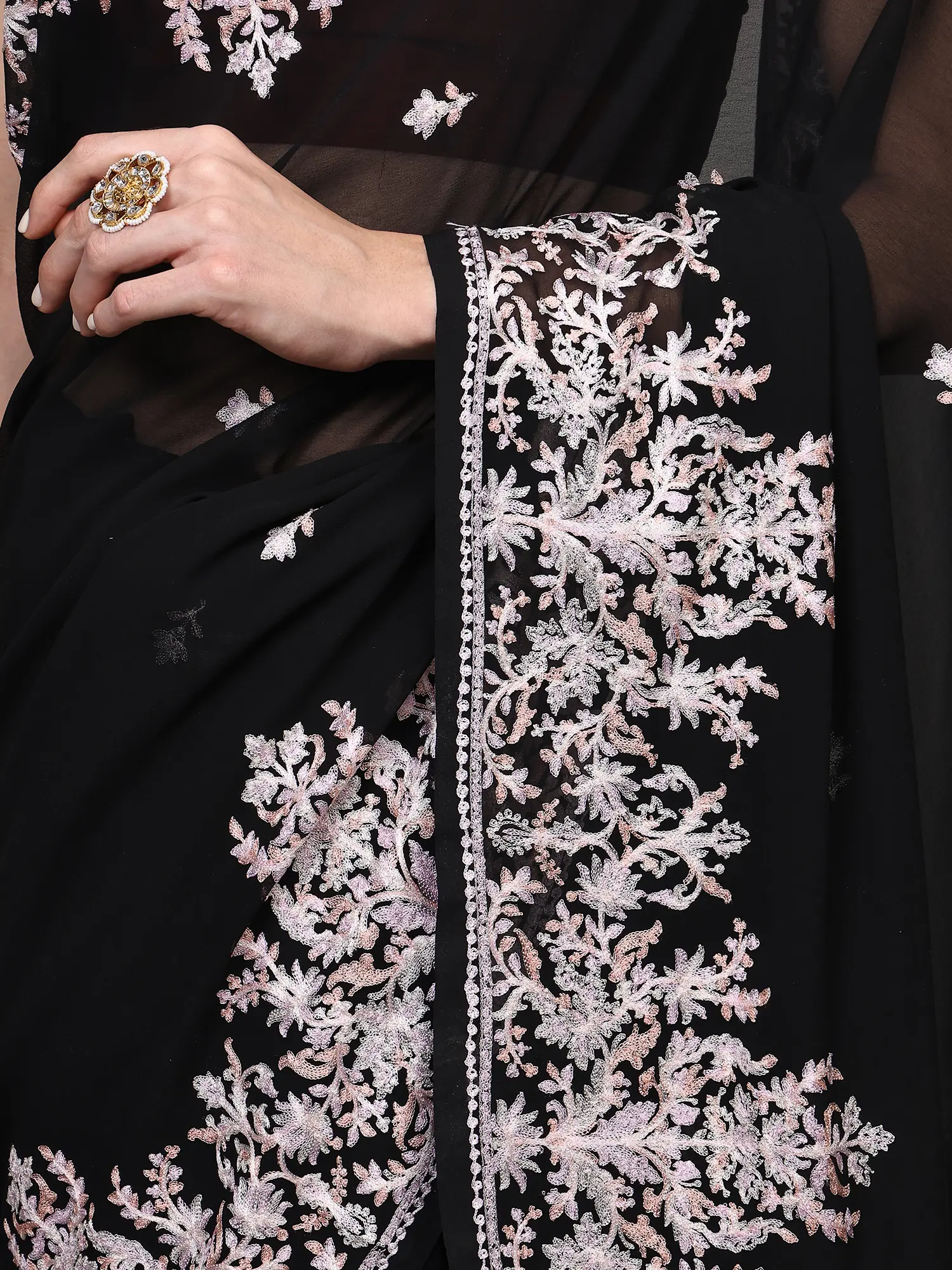 The defining feature of this georgette saree is its captivating floral border, meticulously crafted using the traditional chain stitch Aari embroidery technique. Originating from the valleys of Kashmir, this art form is renowned for its delicate yet detailed work. The skilled artisans have brought to life a mesmerizing floral motif that flows gracefully along the edges of the saree, creating a visual symphony of texture and design. The fine threads are expertly woven to create a slightly raised, three-dimensional effect, adding depth and dimension to the floral patterns. Each stitch is a testament to the patience and precision of the craftsperson, resulting in a piece that is both luxurious and a wearable work of art.