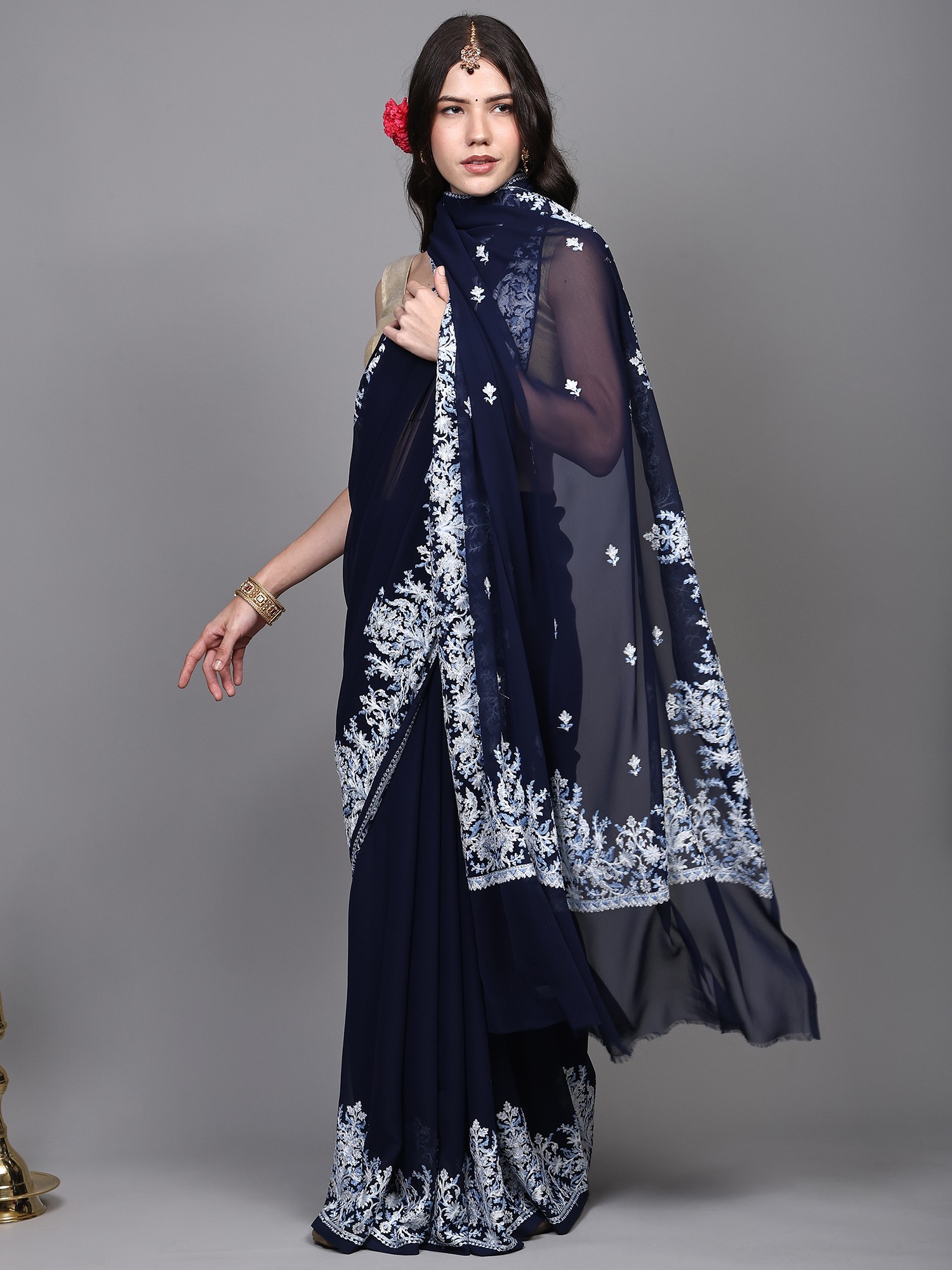 Georgette Saree with Aari Embroidered Flowers and Paisleys Jaal from Kashmir