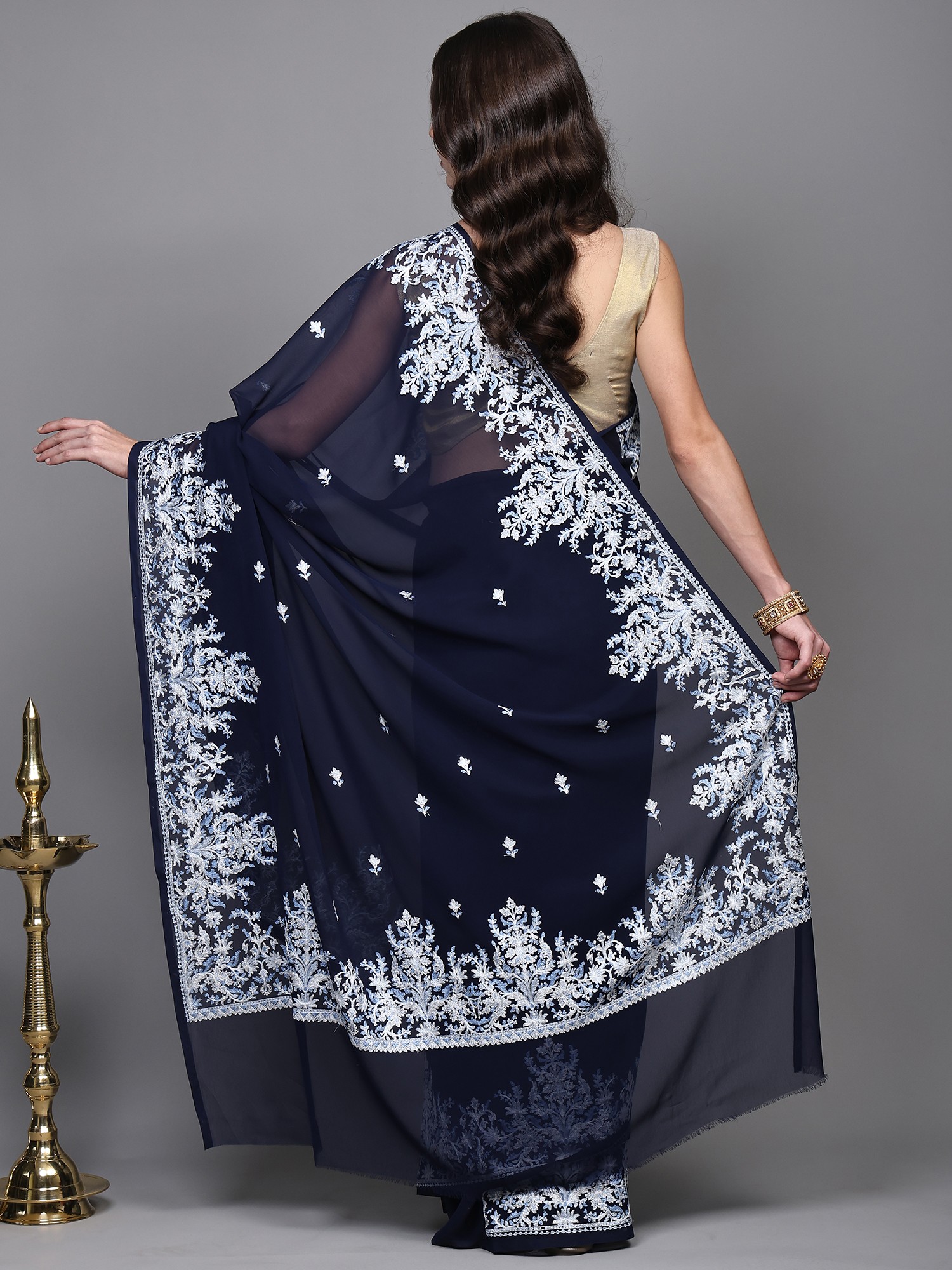 Lucent-White Georgette Saree with Aari Embroidered Floral Motifs from Kashmir