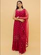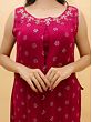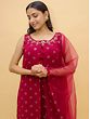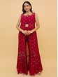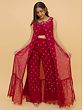 Make festivities an affair to remember with this designer georgette sharara suit set. The monochrome ensemble becomes beautiful with the vivid color, adorned with a sophisticated floral element on the neckline and beautiful floral motifs all over. The matching jacket adds a layer of style to the look, making this a stylish fusion of modern and classic Indian elements.