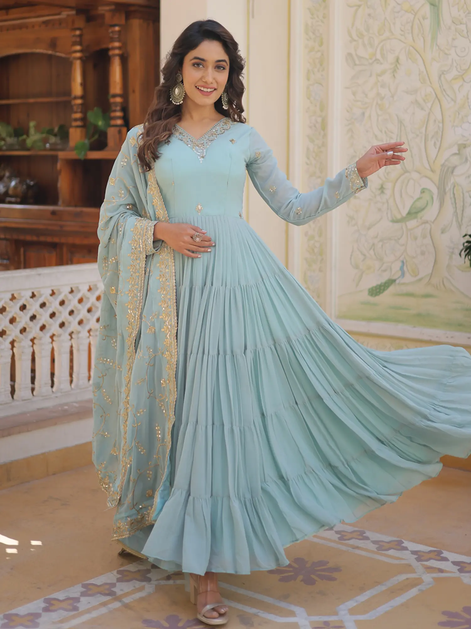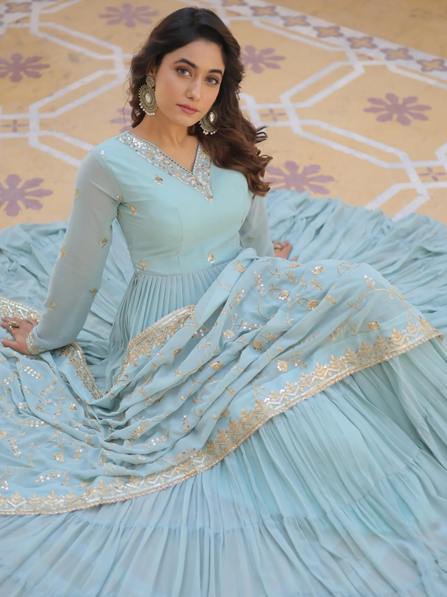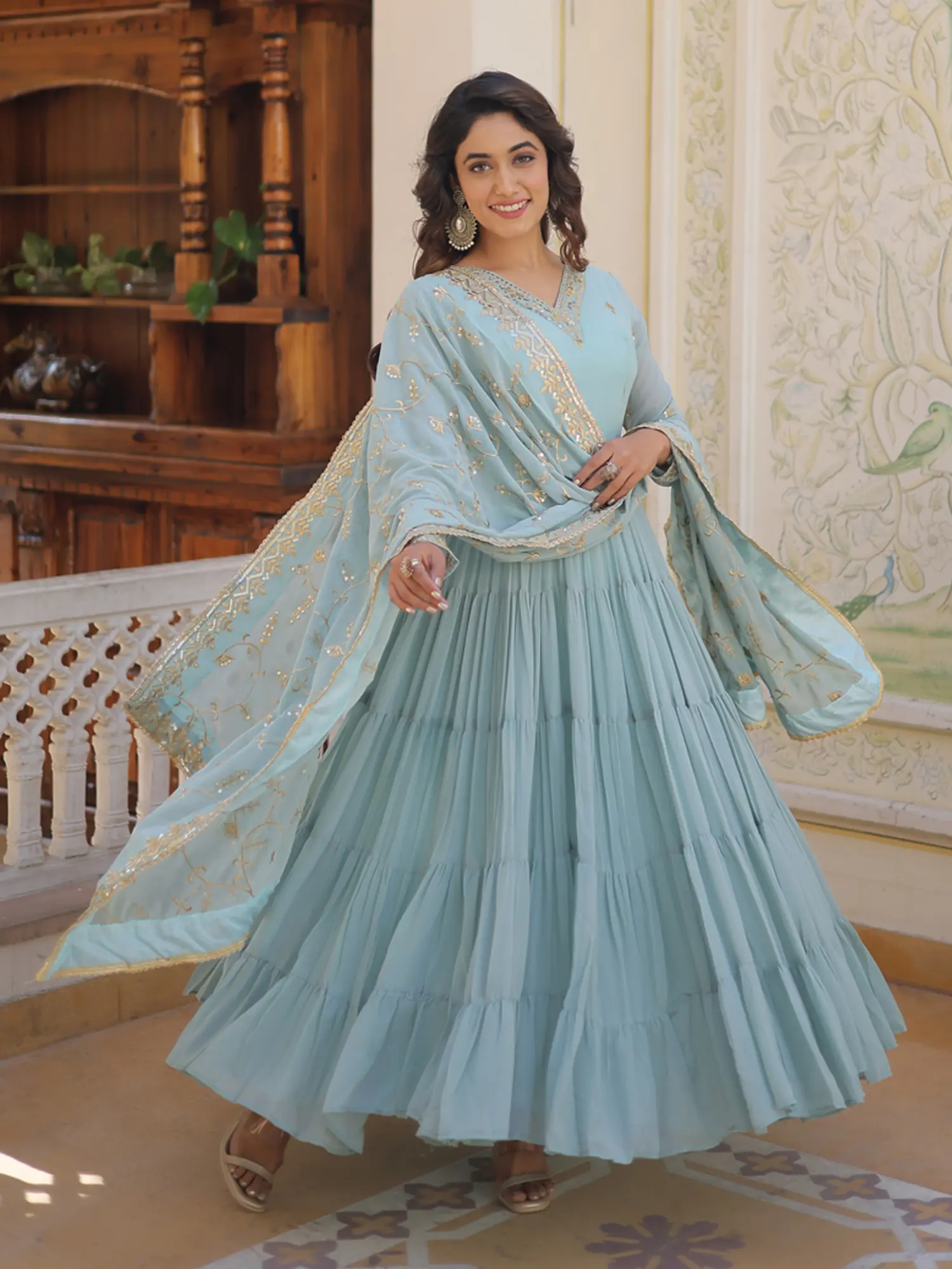 Step into a realm of captivating elegance with this exquisite georgette gown ensemble. Designed to make you feel like royalty, this outfit is a harmonious blend of flowing fabric, intricate embellishments, and a timeless silhouette. The delicate sky blue hue evokes a sense of serenity and grace, making it a perfect choice for a variety of celebratory occasions, from festive gatherings to formal events. The gown itself is crafted from luxurious faux blooming georgette, a material renowned for its soft drape and ethereal quality. This fabric creates beautiful movement with every step, enhancing the gown's inherent charm. The design features a flattering tiered skirt, with each layer meticulously gathered to create a voluminous and graceful sweep. This tiered construction adds a touch of modern flair while maintaining a classic, flowing aesthetic. The full-length sleeves offer a refined touch, adorned with subtle yet striking embroidered work near the cuffs, mirroring the detailing on the neckline.
