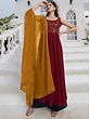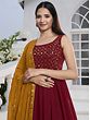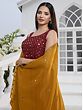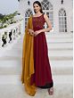 A classic festive ethnic wear, this georgette embroidered salwar kameez offers you an effortless queenly appeal. The deep red kurta flows charmingly, adorned with embroidery, sequins, and mirrorwork on the torso, complemented by the yellow dupatta where mirrors and sequins create ethnic patterns. Paired with palazzo-style pants that add a breathable and classic charm to the attire, this festive wear is a must-have for lovers of the timeless appeal of ethnic clothing.