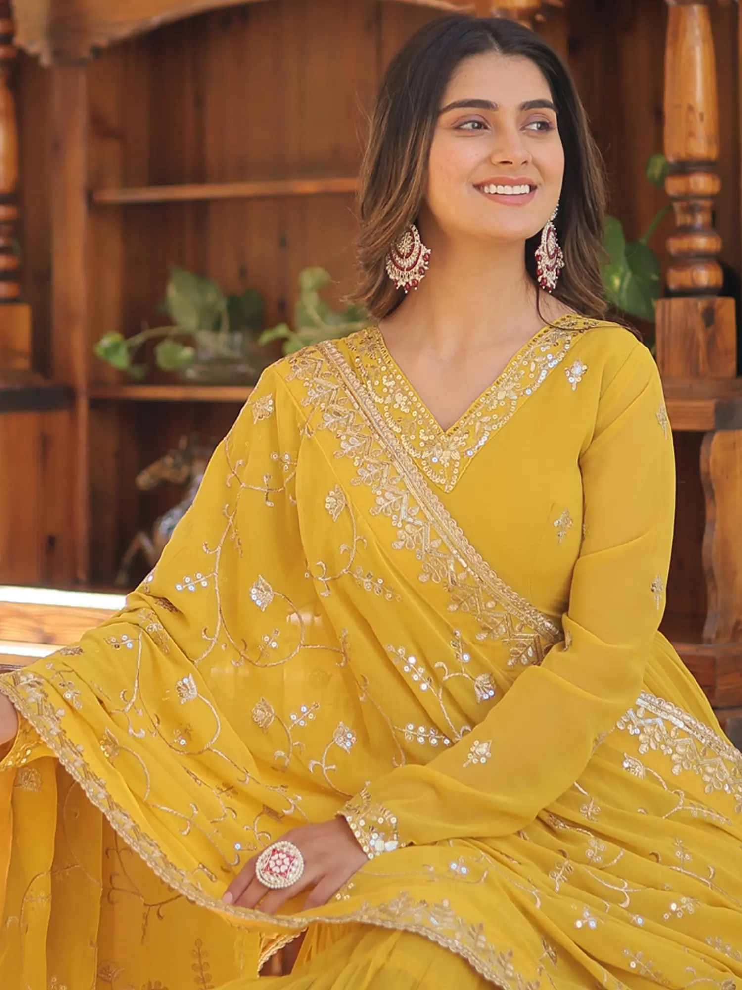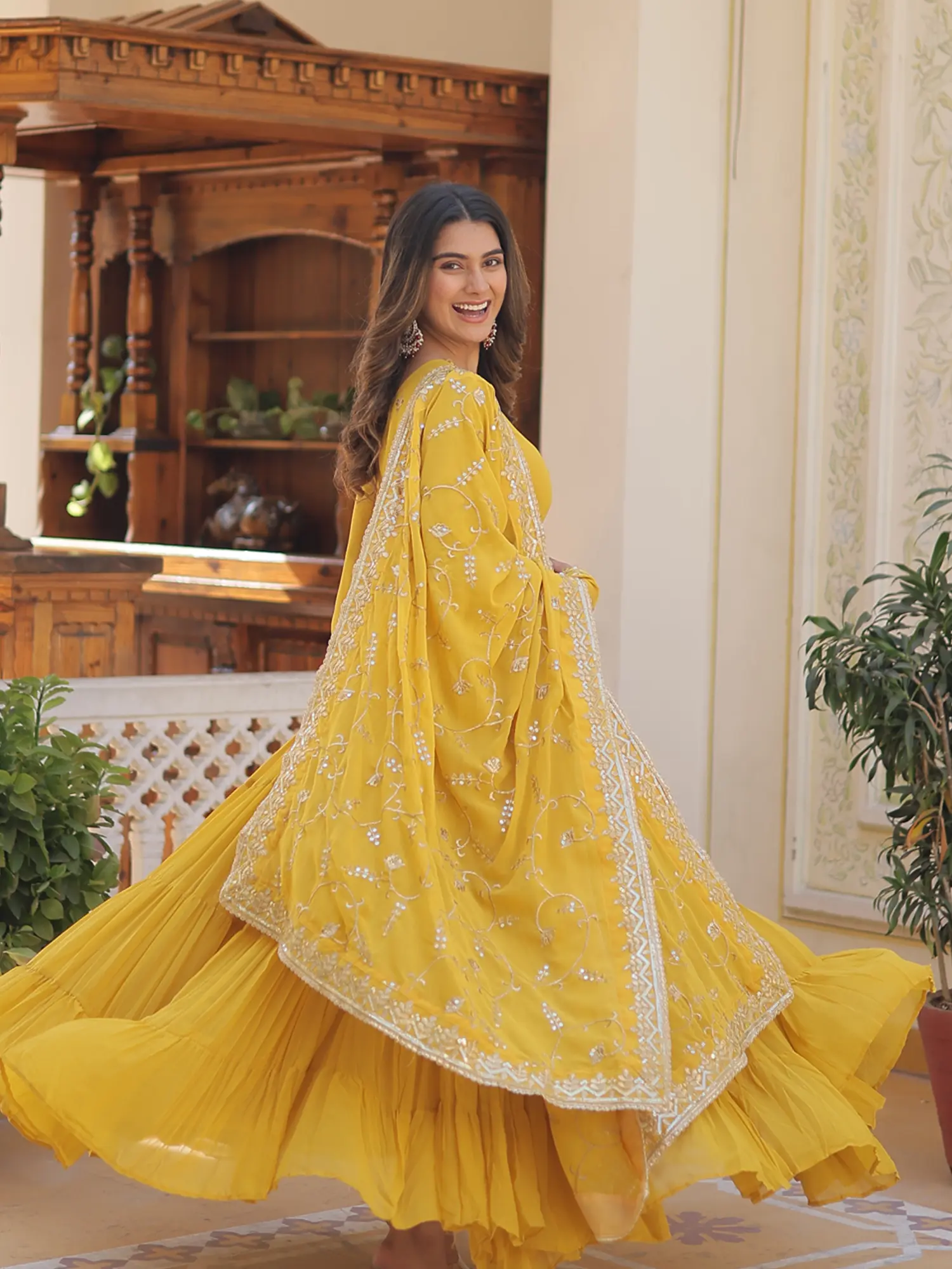 Experience the happiness of the color yellow with this georgette yellow gown. Crafted in the style of classic Anarkali suits, the dress has a stylish volume, decorated with ethnic patterns and a classy neckline. The dupatta is adorned with shimmering golden details, that infuse a celebratory appeal to the look