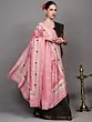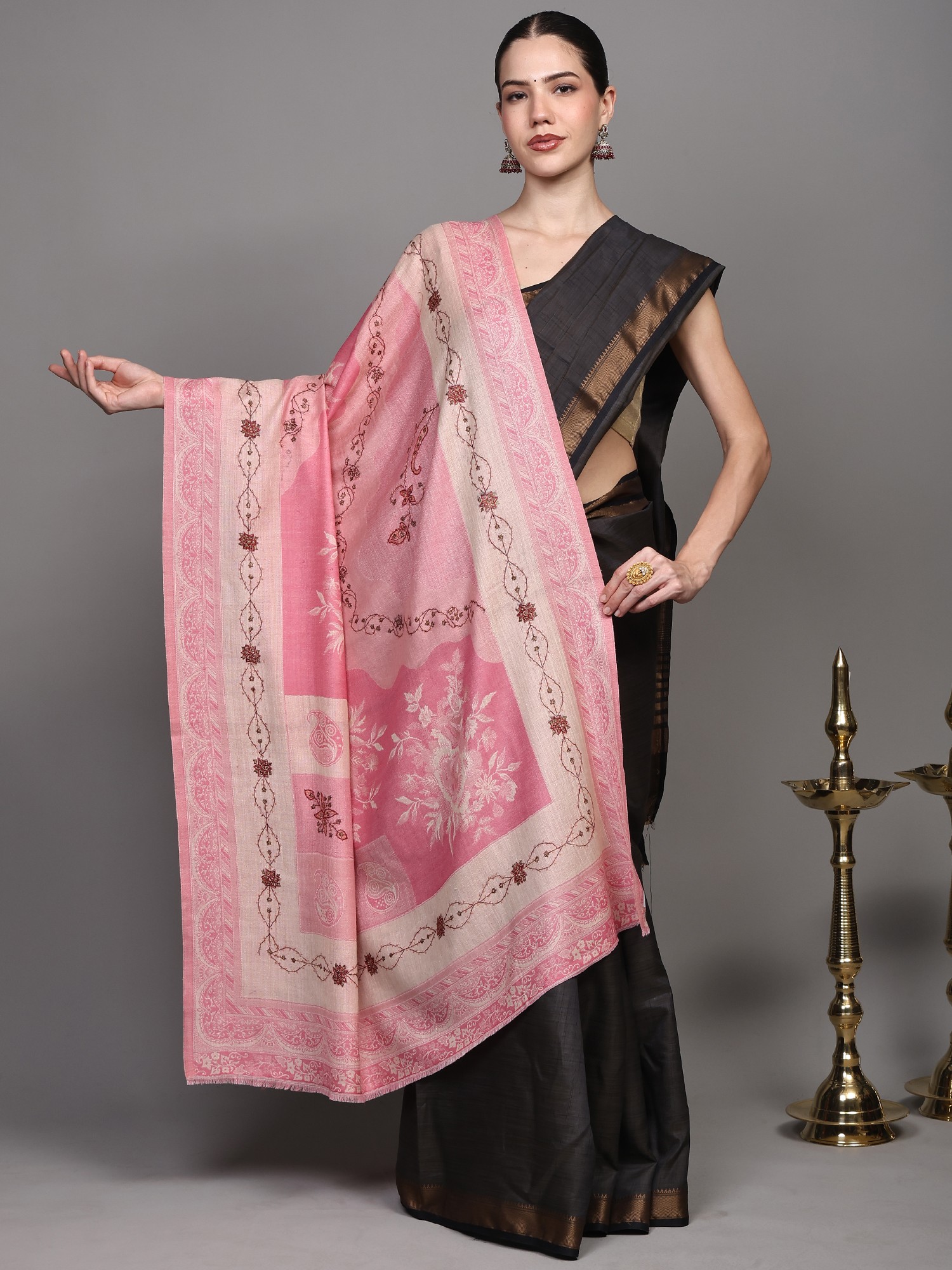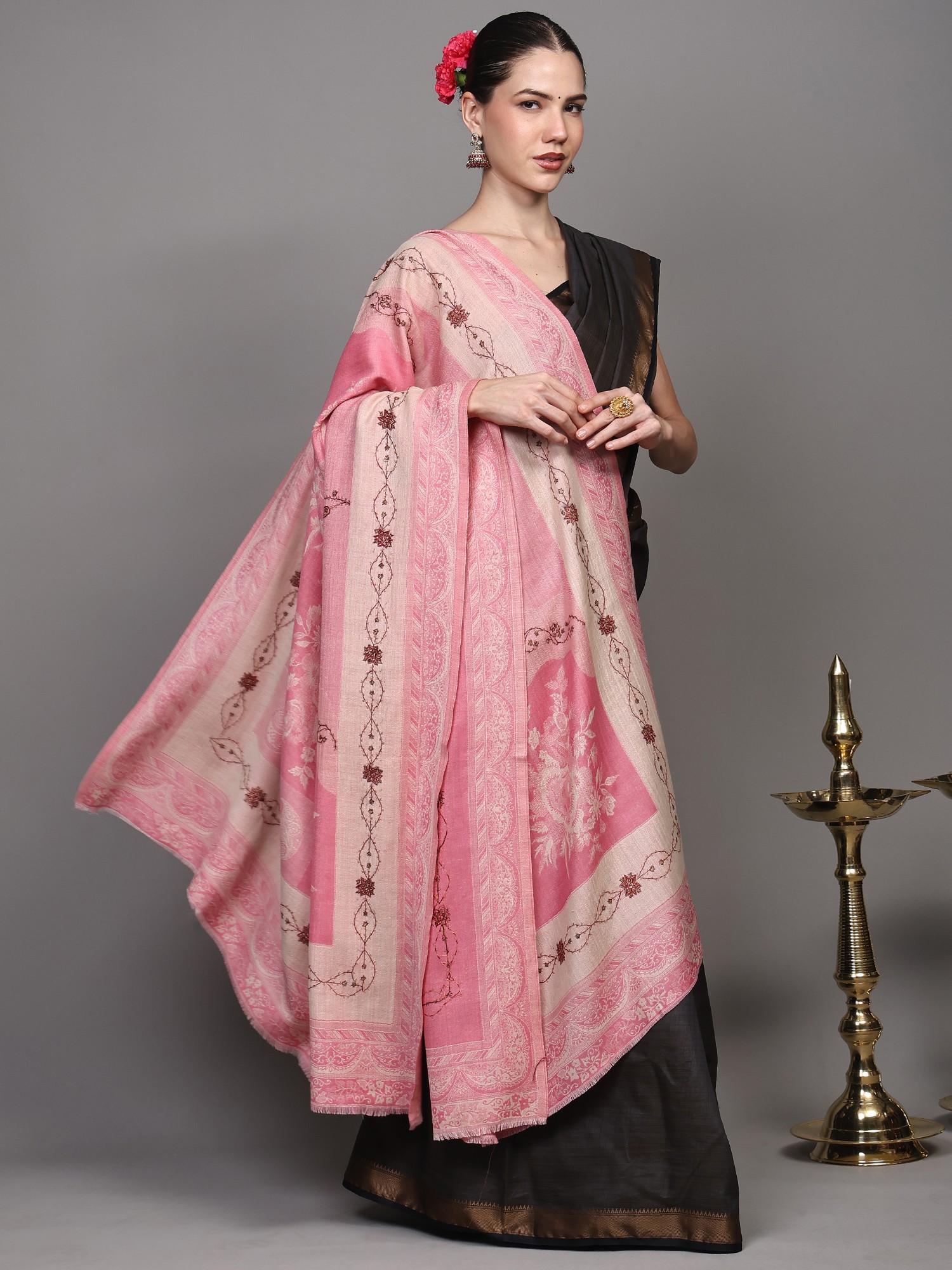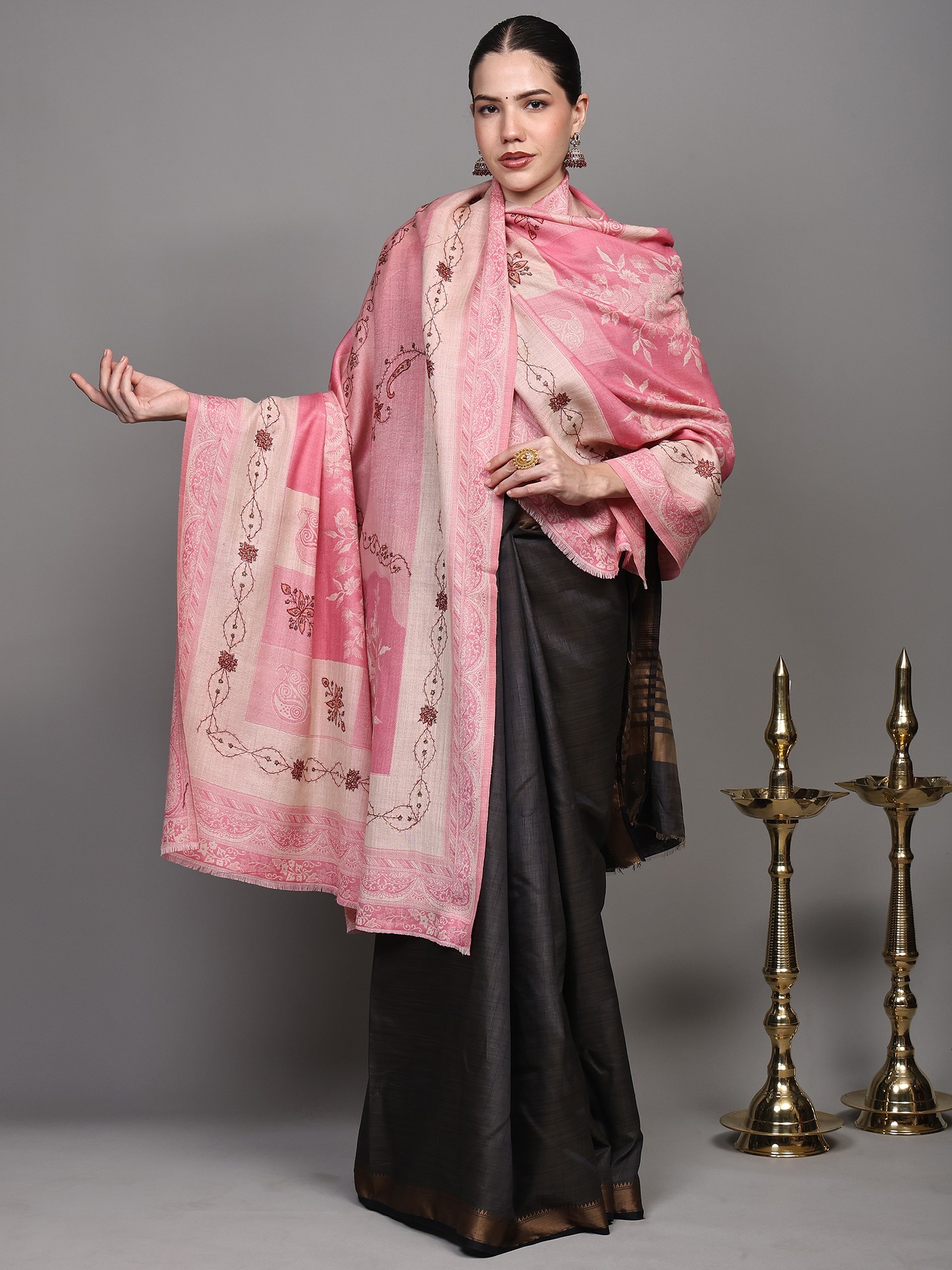 Slightly-Pink Sozni Embroidered Wool Shawl with Woven Giant Paisleys-Flowers