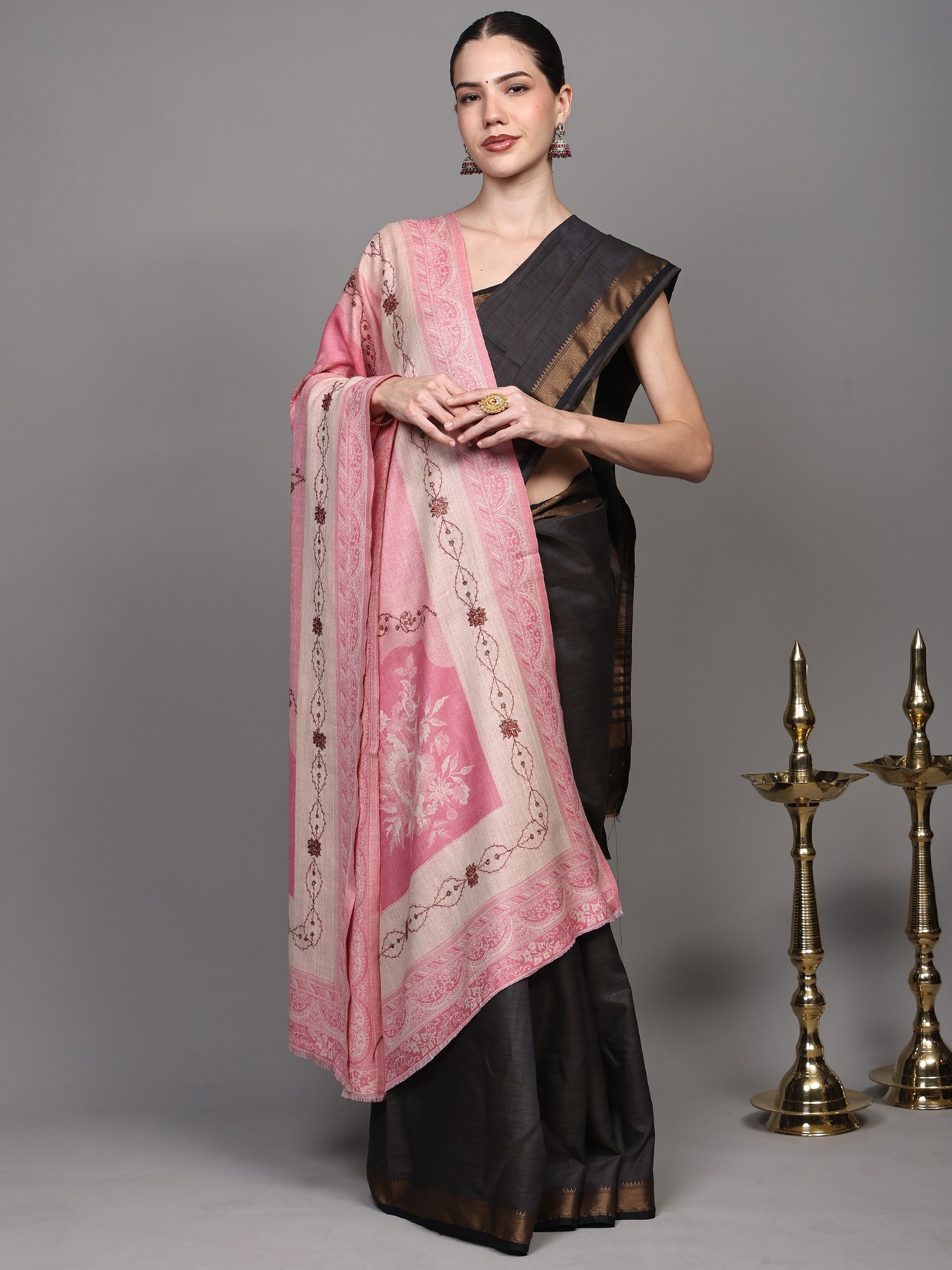Black-Sand Wool Shawl with Sozni Embroidered Flowers and Paisleys