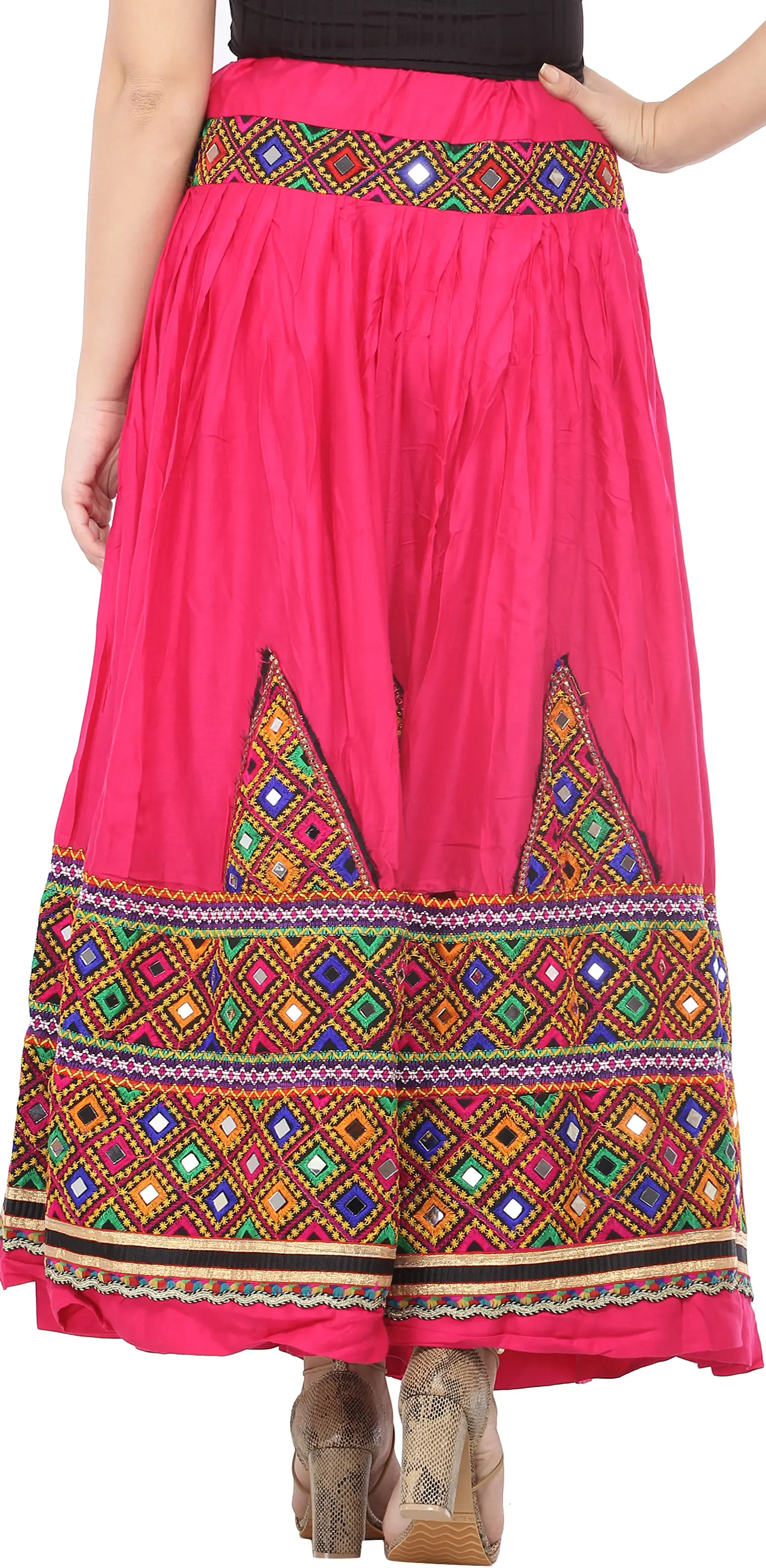 Introducing the colorful beauty of Gujarati culture, this cotton long skirt has everything that will enhance your elegance and ethnic fashion style. It is a typical Kutch ghagra or long skirt woven on bright pastel colored cotton fabric. The weaver has given it a voluminous style, controlled beautifully by multiple pleats starting slightly below the belt and continues till the end. It is designed with multicolored thread embroidery at the waist and at the bottom forming thick rectangular strips and a temple design above it. This embroidery is channelled in beautiful diamond shaped patterns having mirrors studded in-between. The first glance to this skirt takes us through the Gujarati fashion art and the expert weavers weaving such masterpieces.