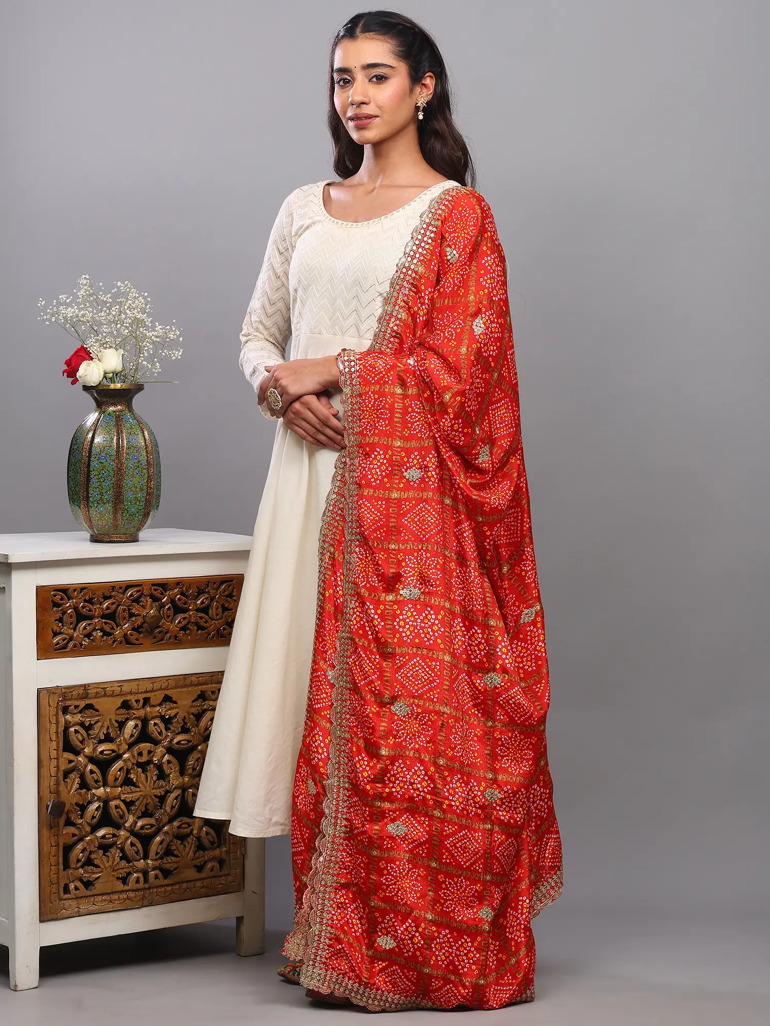 Framing this vibrant canvas is a beautifully crafted scalloped border. This intricate edge treatment adds a refined and finished look, preventing any fraying and enhancing the overall aesthetic. The scalloped design, often rendered with subtle embroidery or metallic thread, lends a graceful, flowing silhouette to the dupatta, ensuring it drapes beautifully and adds a touch of sophistication to any outfit. It's the perfect detail to tie together the traditional artistry of the Bandhani and the modern shimmer of the embellishments.