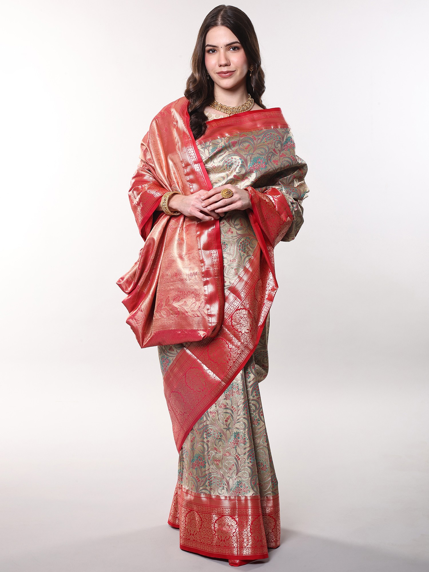 Overland-Trek Zari Woven Bootis Pure Silk Saree from Bangalore with Temple Border and Contrast Rich Pallu