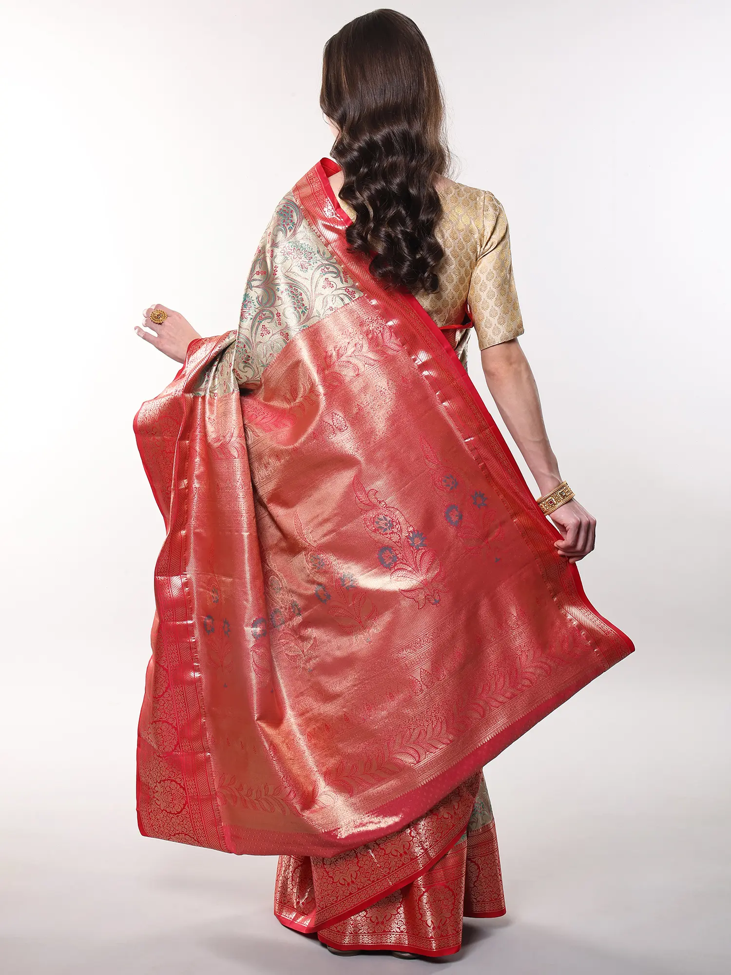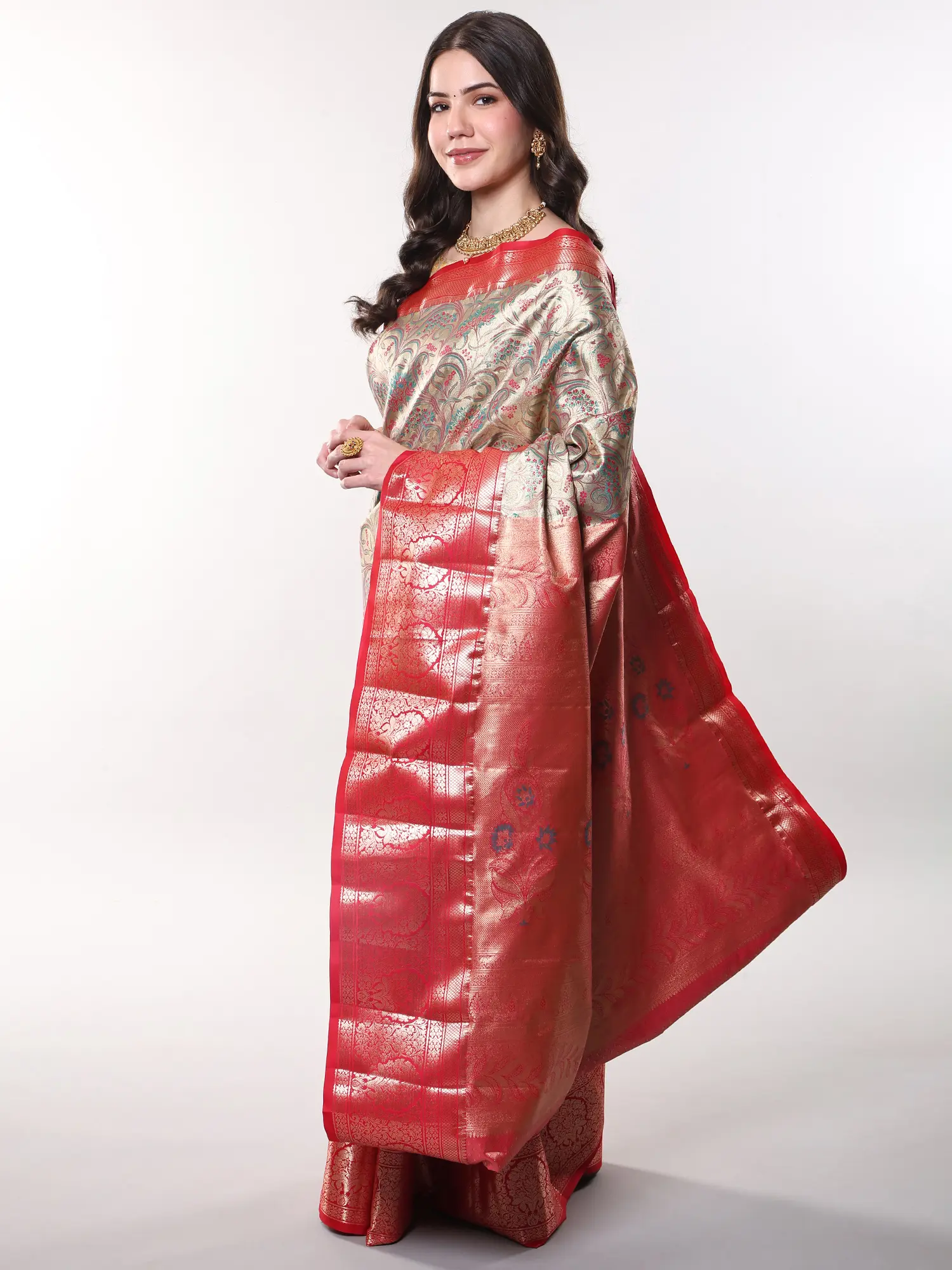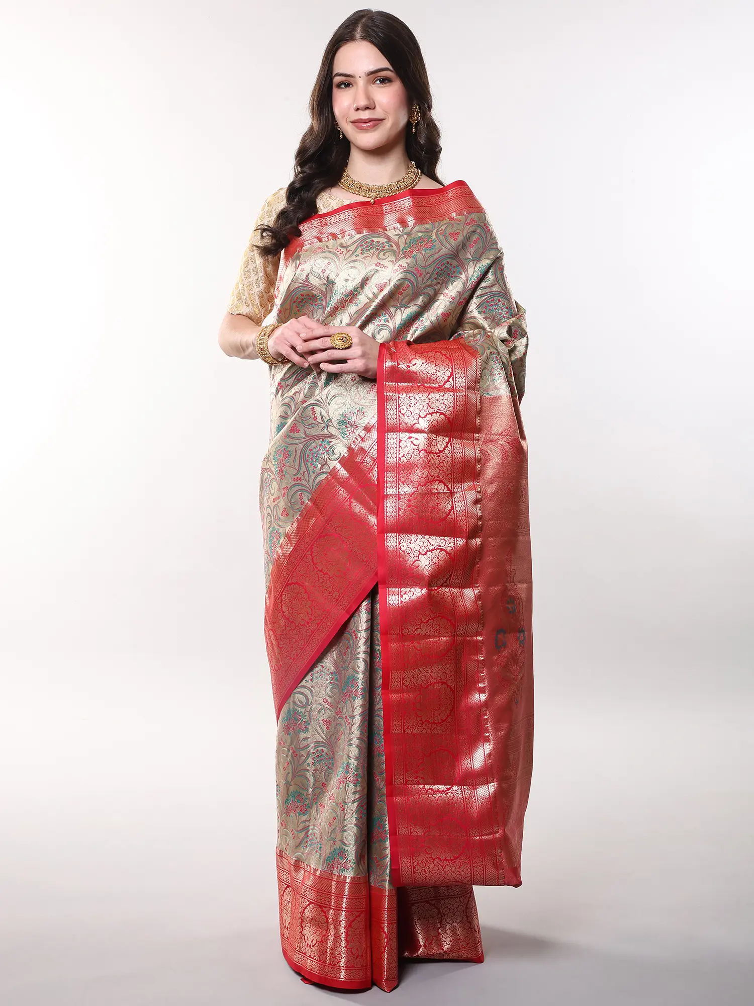 The rich, gilded-beige hue serves as a sublime canvas for the vibrant floral patterns that adorn its expanse. A striking wide border, in a contrasting bold red, frames the ensemble with a flourish of traditional artistry, further enhanced by complementary Zari work. You'll appreciate the way the art silk drapes effortlessly, offering both a luxurious feel against your skin and a statuesque silhouette that celebrates your form. The accompanying blouse and underskirt are tailored to your exact measurements, ensuring a flawless and comfortable fit.