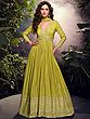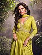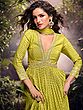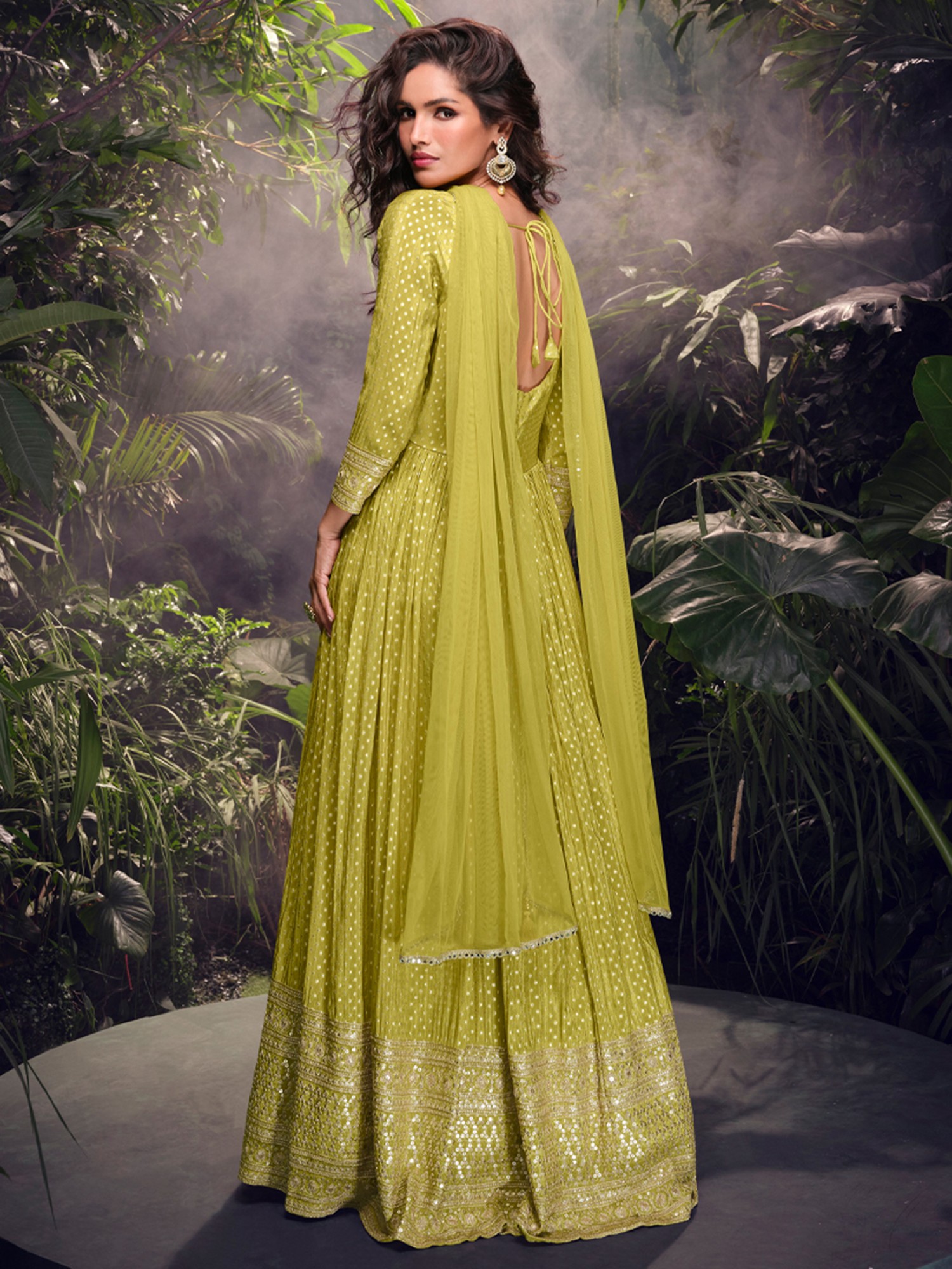 The luminous lime hue of the silk is further enhanced by a subtle, all-over dot pattern that catches the light with every movement. A deep V-neckline elegantly frames the décolletage, while the fitted bodice accentuates your form before cascading into a voluminous, floor-sweeping anarkali. Intricate embroidery encircles the waistline and forms a grand border along the hem, adding a breathtaking flourish. This piece, tailored in a size 38 (Medium), offers a flattering and graceful drape.