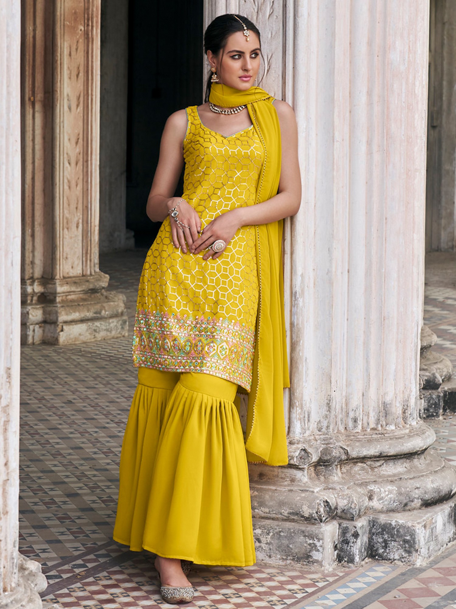 Floral Digital Print And Sequins Work Georgette Attractive Kurti Sharara Set With Chiffon Dupatta