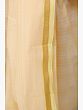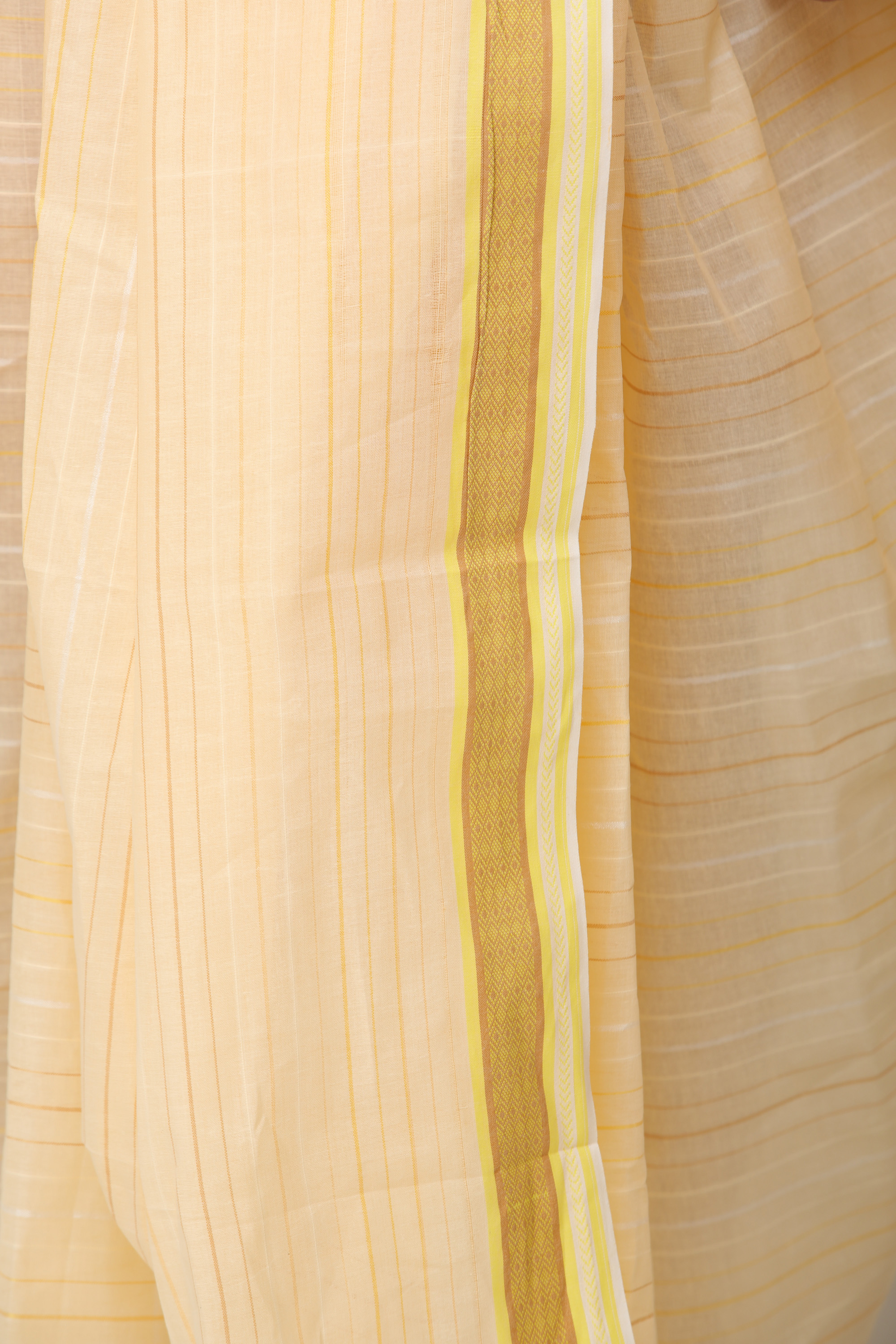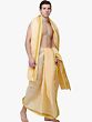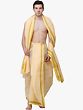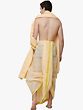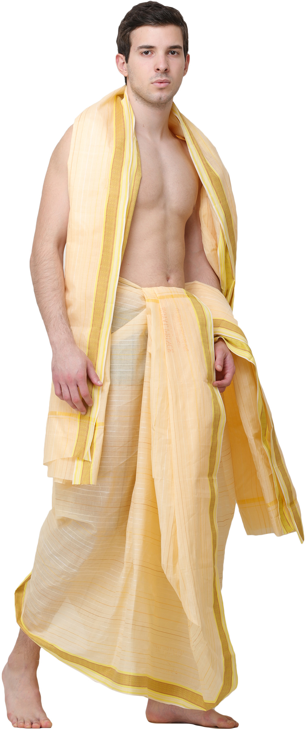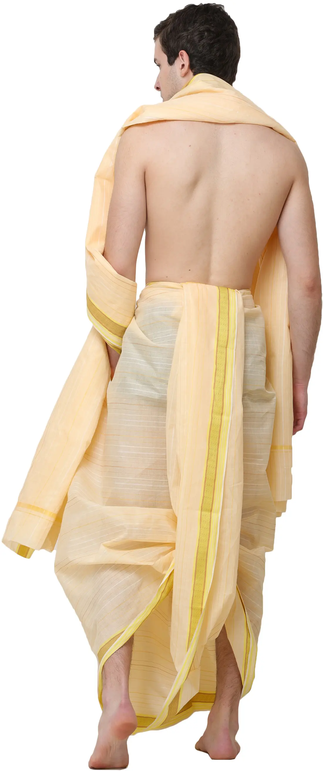 This dhoti and angavastram set is more than just clothing; it's a piece of art that celebrates traditional Indian textile craftsmanship. Each thread is meticulously woven to create a fabric that is both durable and aesthetically pleasing. The precision in the application of the woven stripes and borders speaks volumes about the skill and dedication of the artisans who brought this garment to life. Owning this set means cherishing a piece of cultural legacy, beautifully rendered in comfortable and elegant pure cotton.