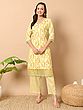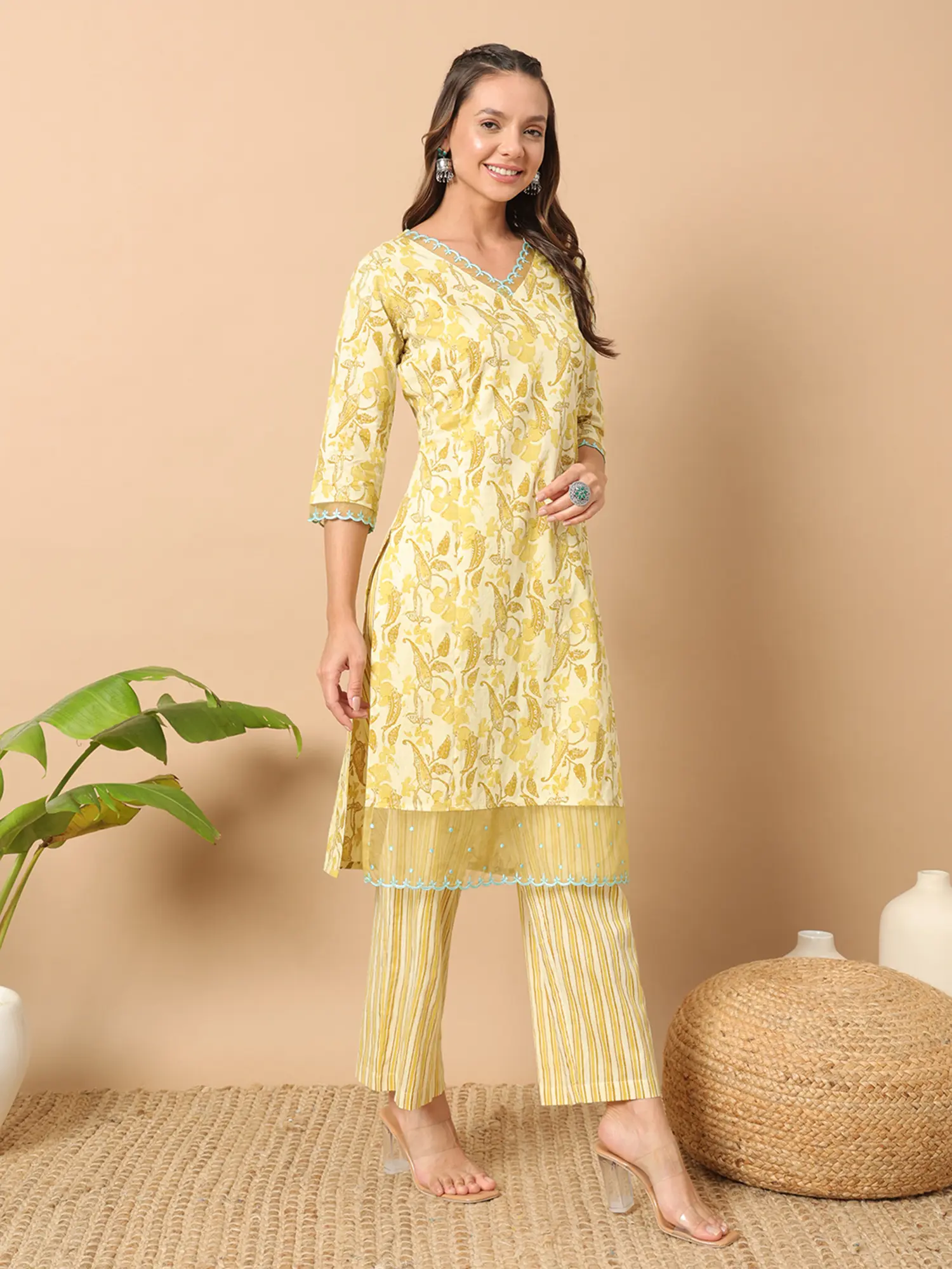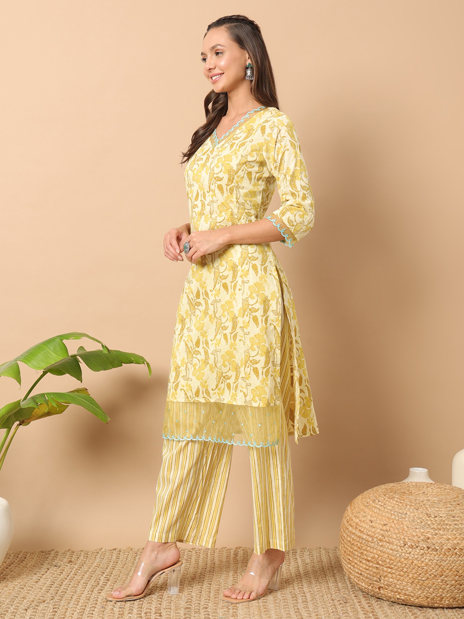 Elevate your everyday wardrobe with this beautifully designed kurti set. The delicate floral print, rendered in soft shades of yellow and golden-sand, creates a look that’s both fresh and sophisticated. Crafted from breathable cotton, this outfit ensures all-day comfort, making it perfect for running errands, meeting friends for lunch, or simply relaxing at home. The flattering V-neckline adds a touch of elegance, while the three-quarter sleeves offer the ideal balance of coverage and style. This set is designed for the modern woman who values both comfort and effortless style.