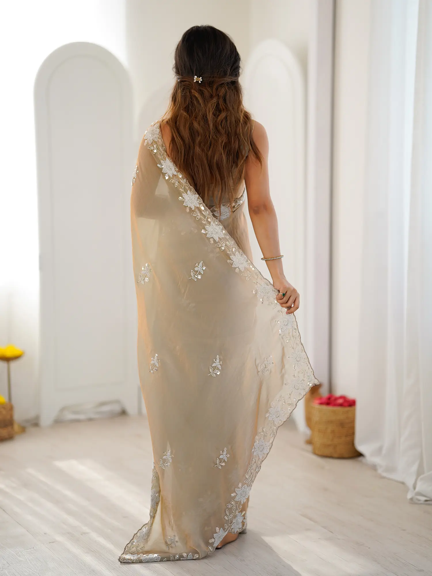 The rich, understated hue of the Fendy Satin provides the perfect canvas for the opulent embellishments. You'll notice the delicate floral motifs that cascade along the borders and scatter across the drape, each one painstakingly detailed to catch the light. The accompanying blouse and underskirt are tailor-made to complement your individual silhouette, ensuring a perfect fit and a seamless look that enhances your natural grace.