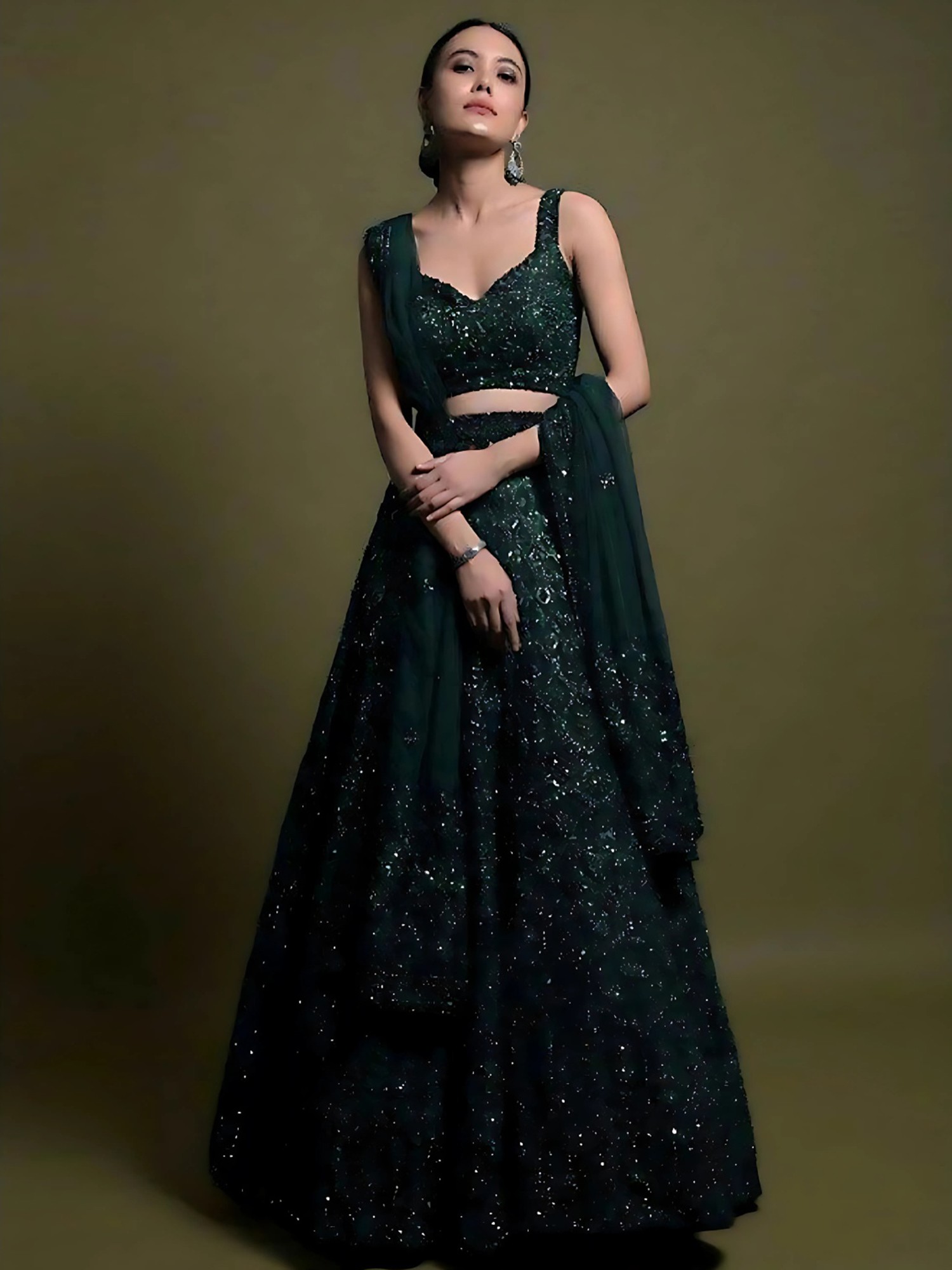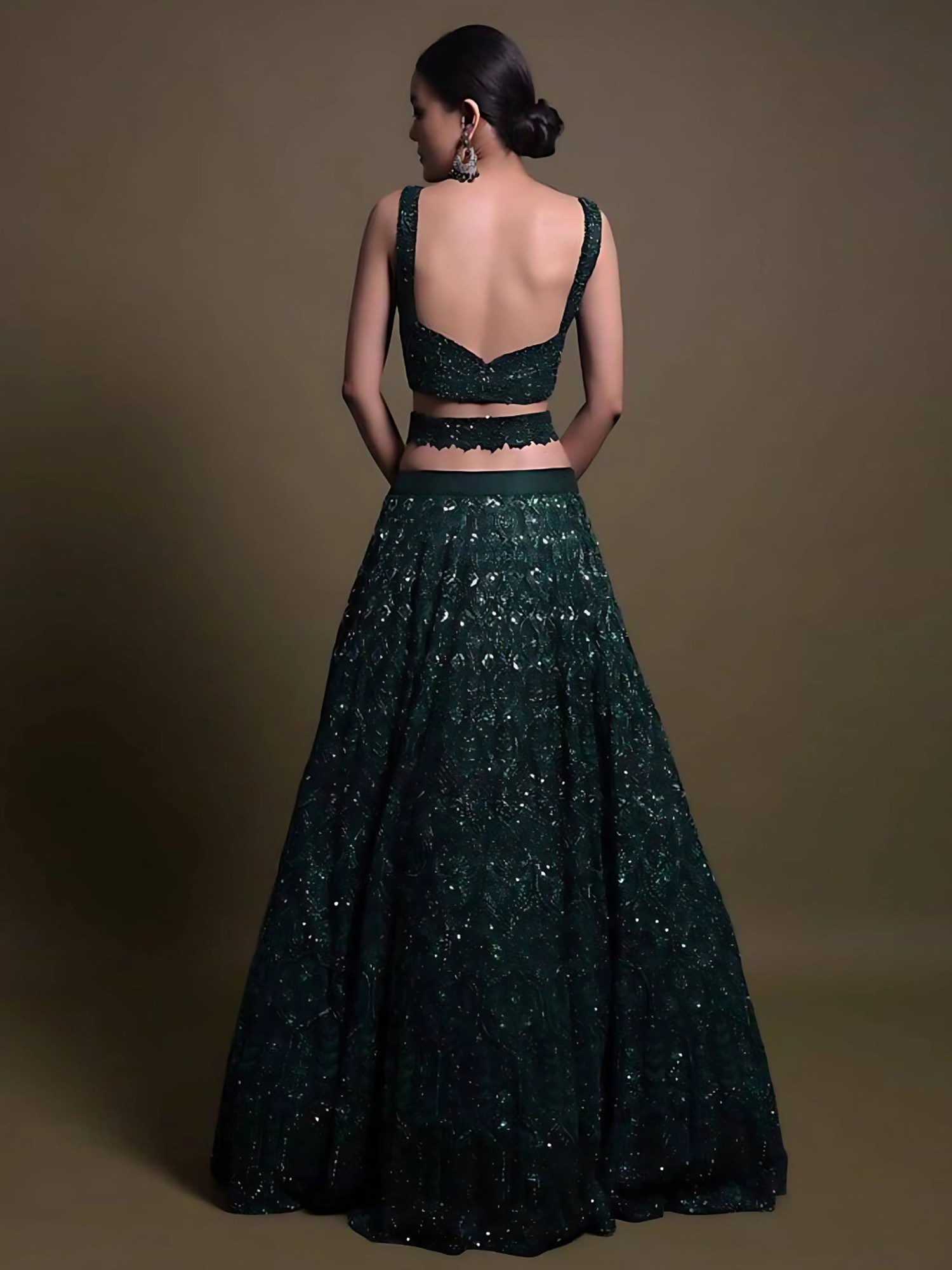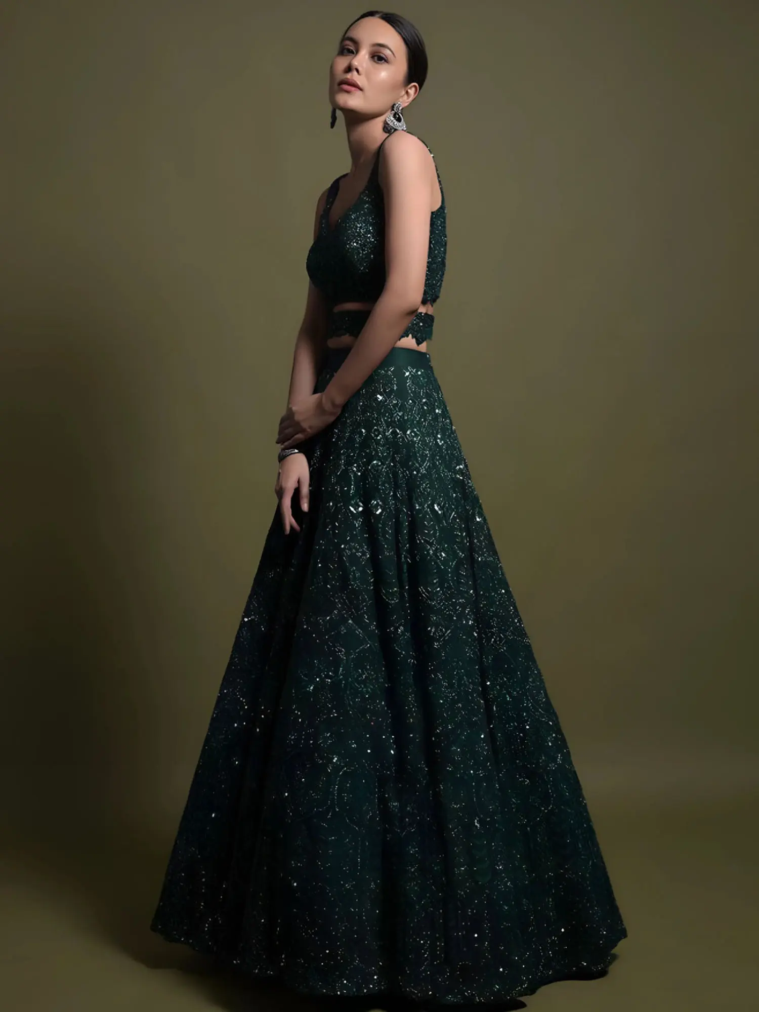 Bottle-Green Net Beads and Golden Thread Embroidery Lehenga Choli with Cutwork Dupatta