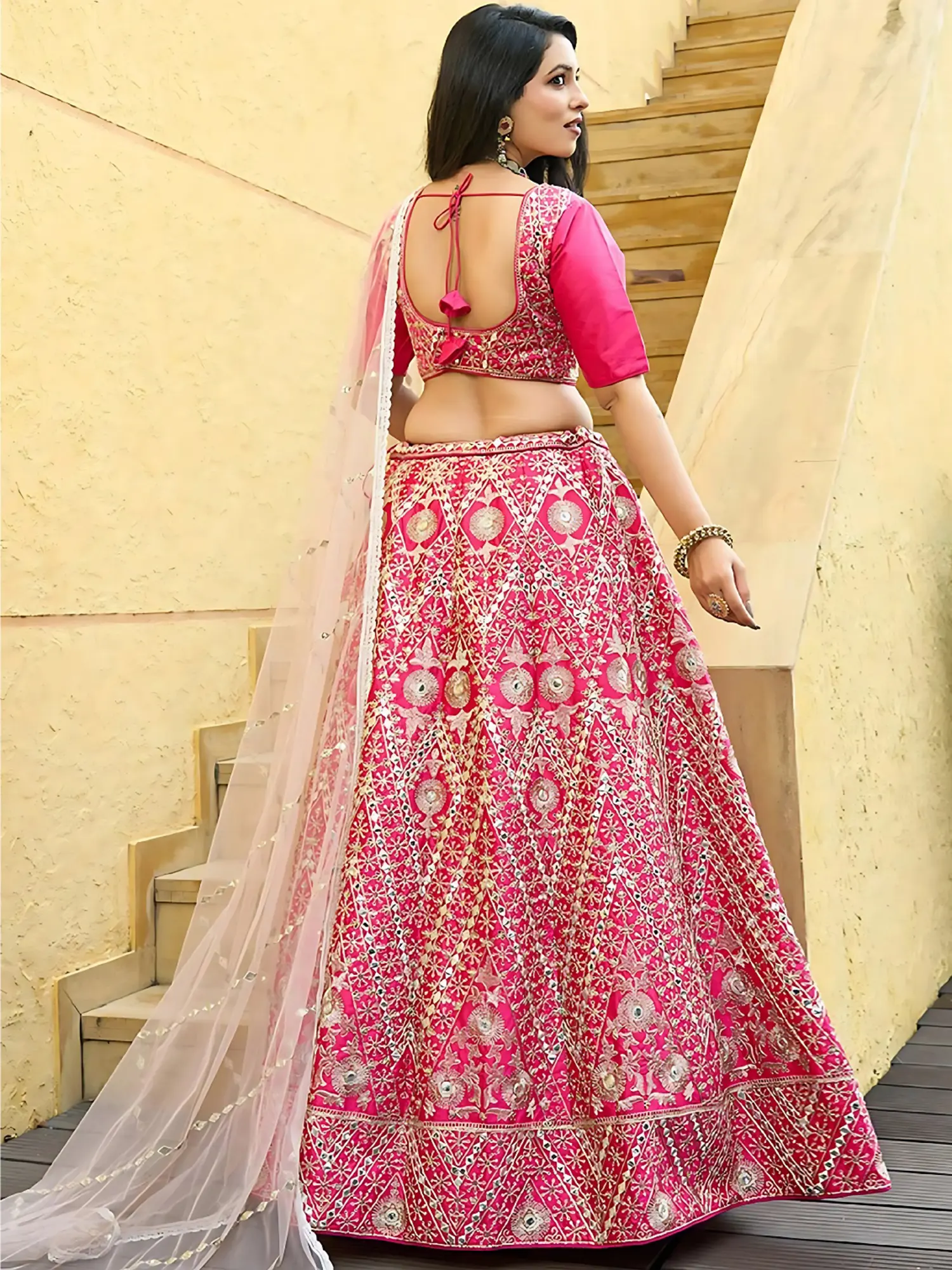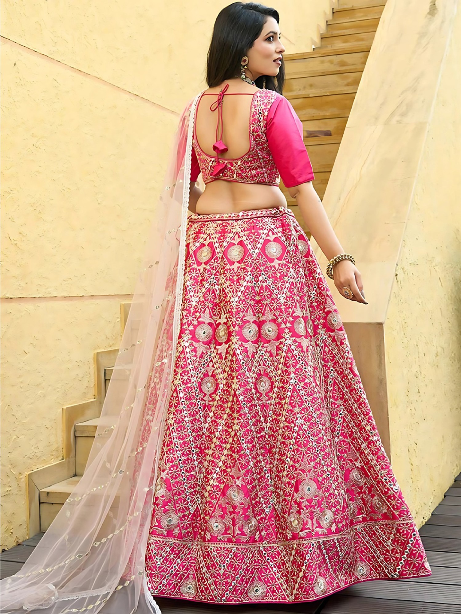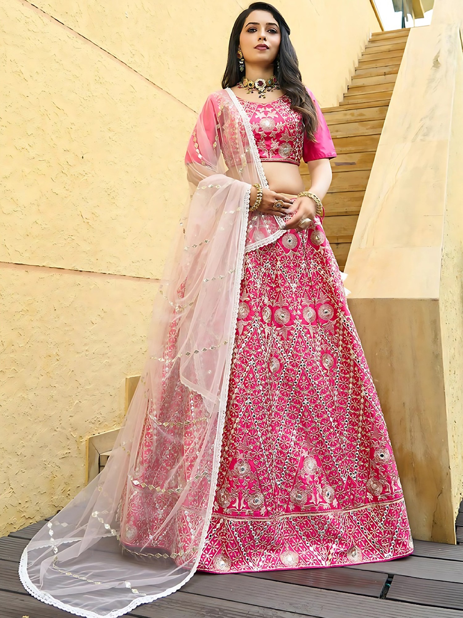 Paradise-Pink Soft Net All Over Thread Work Embroidered Lehenga Choli with Scalloped Dupatta