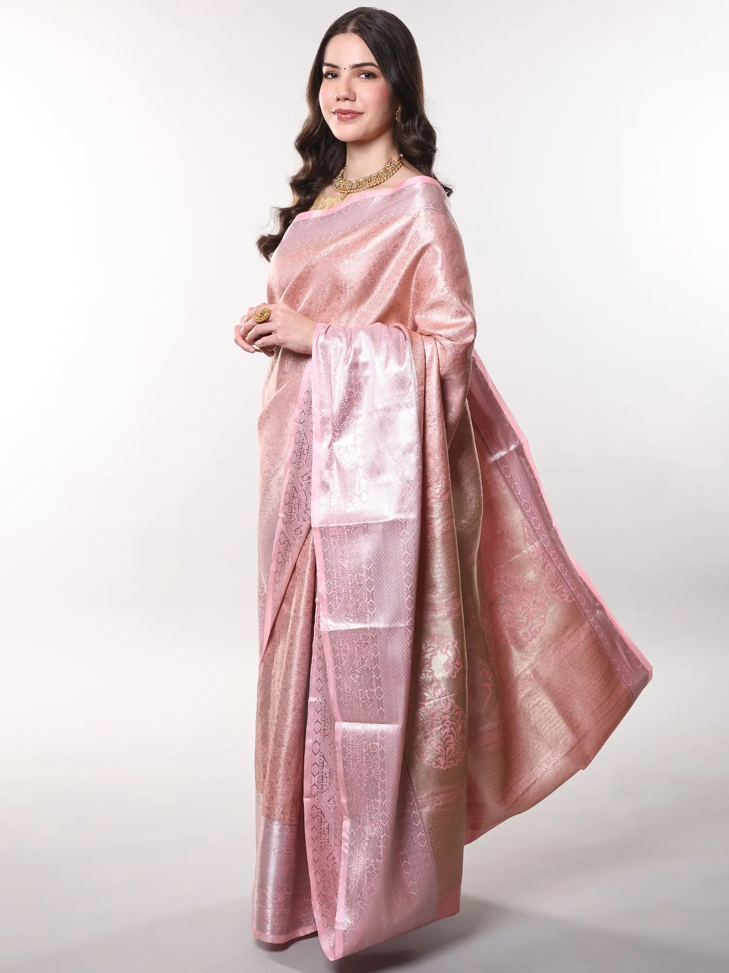 Shimmering Zari threads create a captivating sparkle with every movement.