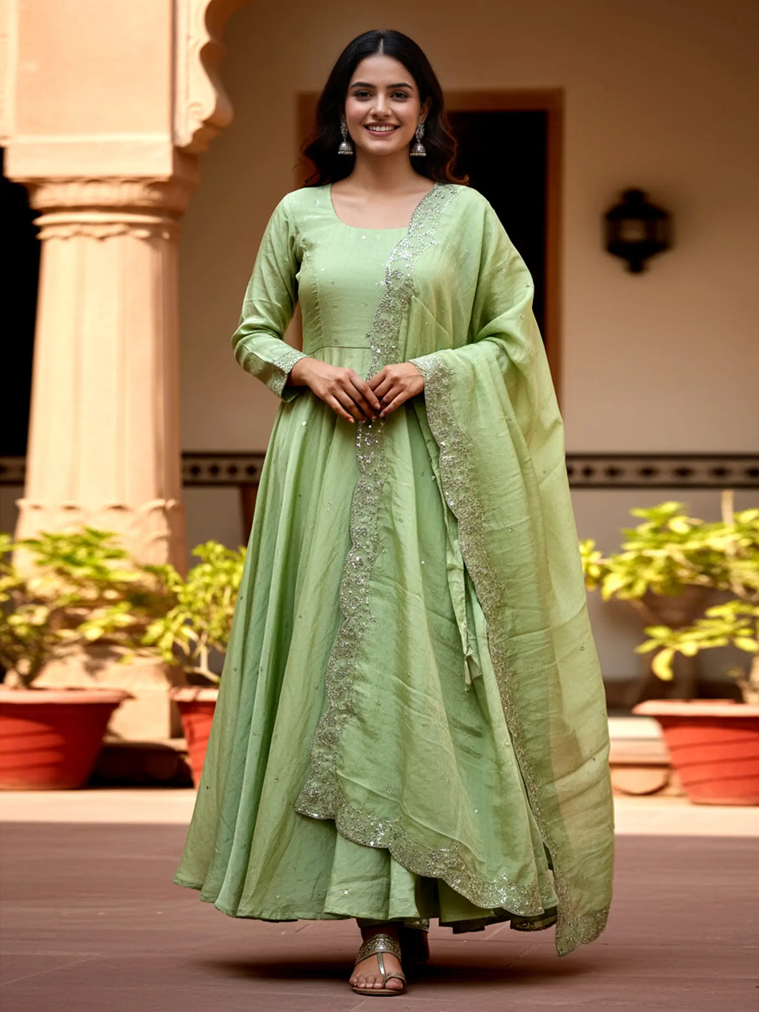 Mint-Green Designer Flowy Gown with Embroidered Flowers