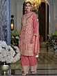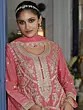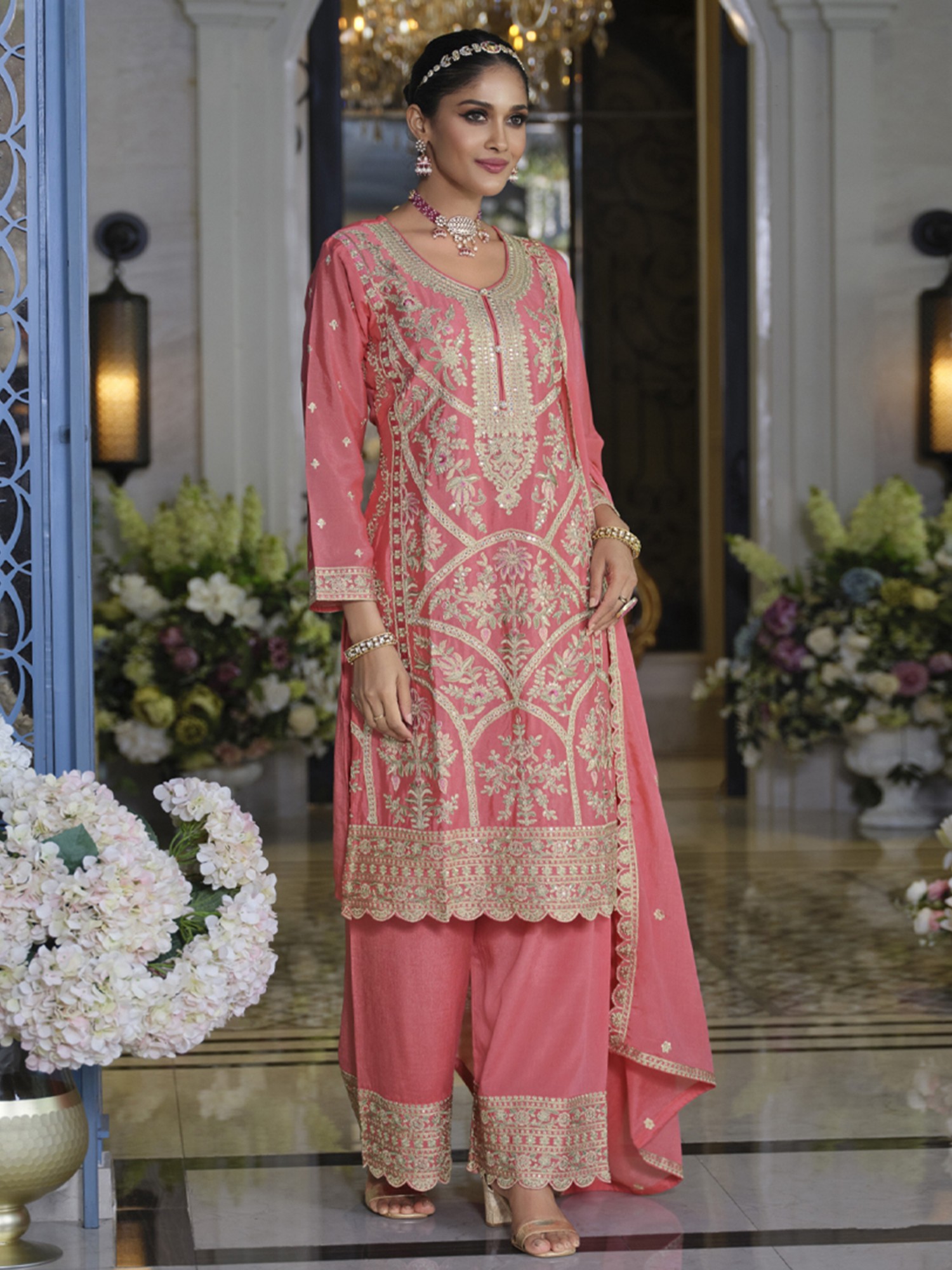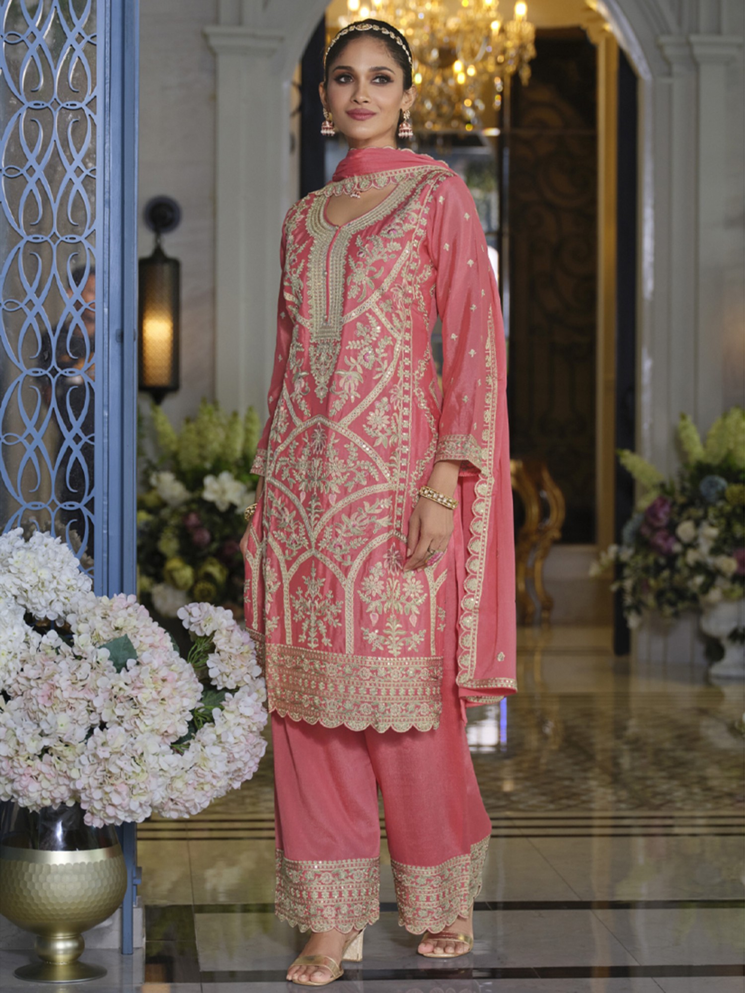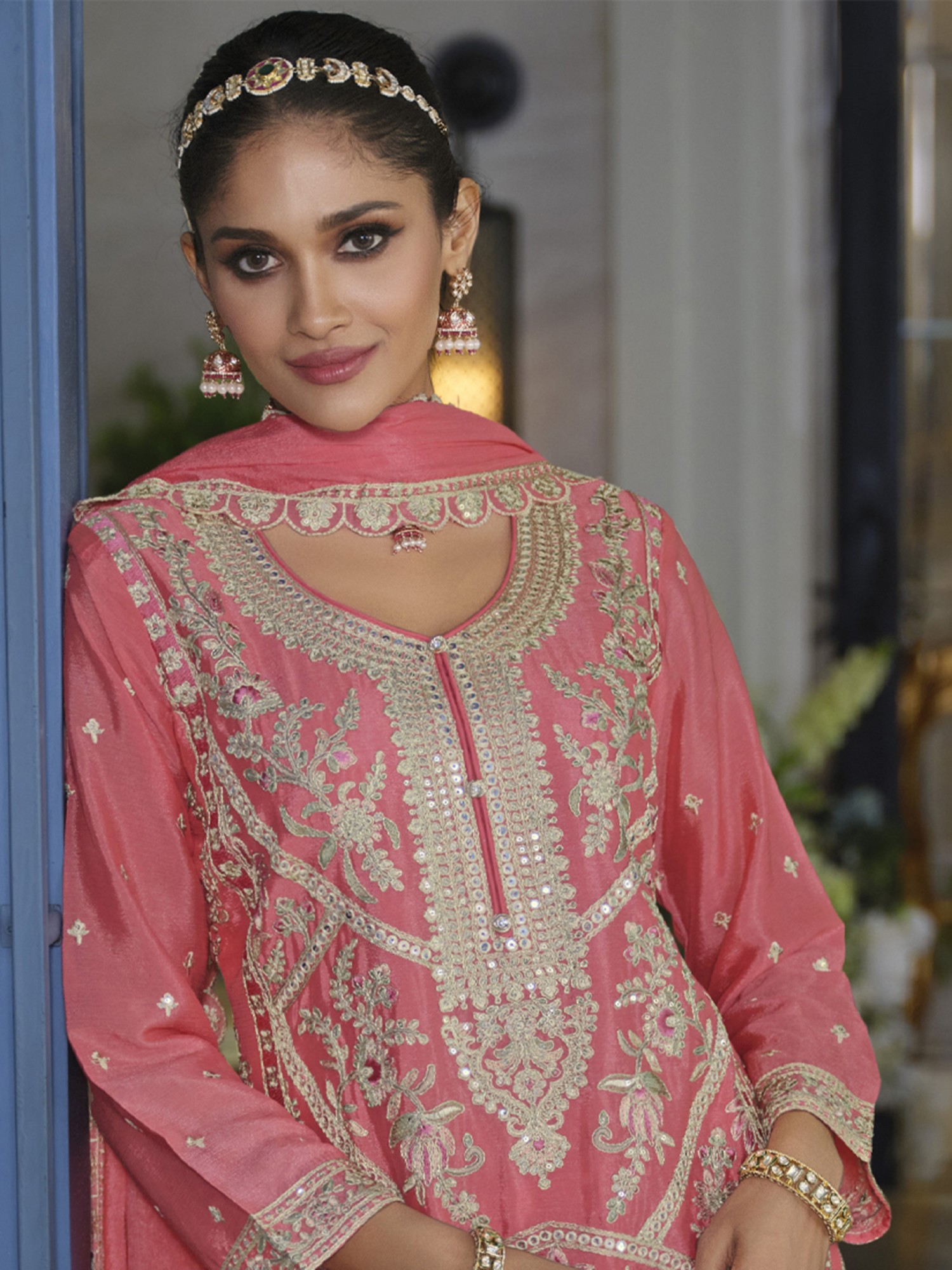 Discover unparalleled elegance with this stunning ensemble, meticulously crafted to adorn you for your most cherished festive occasions. The graceful chinon fabric drapes beautifully, offering a soft, flowing silhouette that embodies sophistication. The vibrant hue, reminiscent of a blooming coral, is both captivating and universally flattering, making it a perfect choice for celebrations, weddings, or any event where you wish to make a memorable statement. The long, straight cut of the kameez offers a timeless and flattering silhouette. Adorning the front of the kameez, you'll find an intricate tapestry of thread embroidery, enhanced with shimmering sequins and delicate dori work. This exquisite detailing creates a mesmerizing pattern that draws the eye, showcasing exceptional craftsmanship. The neckline and hemline are further embellished, adding a touch of regal charm to the overall design. The full sleeves also feature subtle embroidery, ensuring a cohesive and polished look.