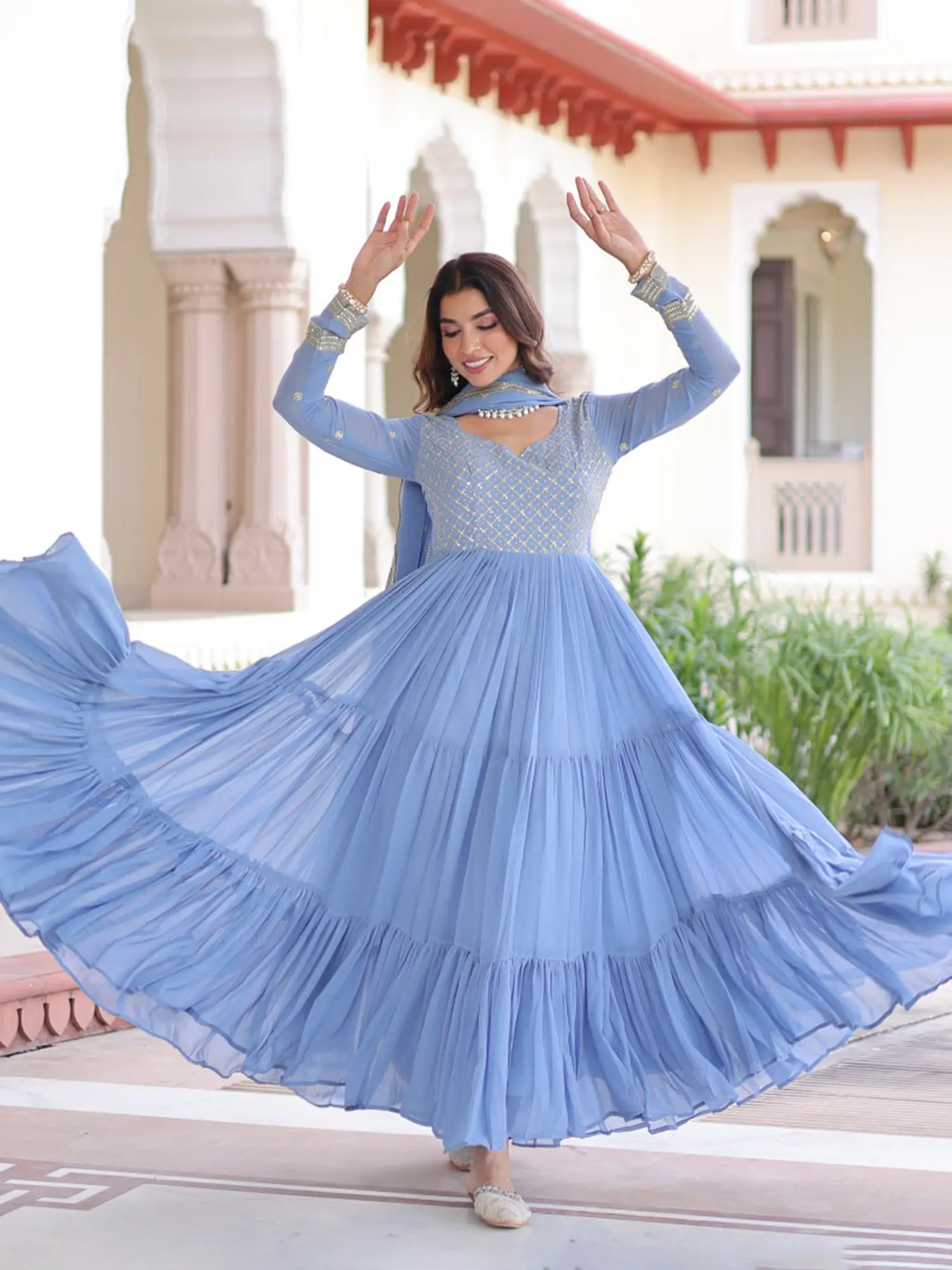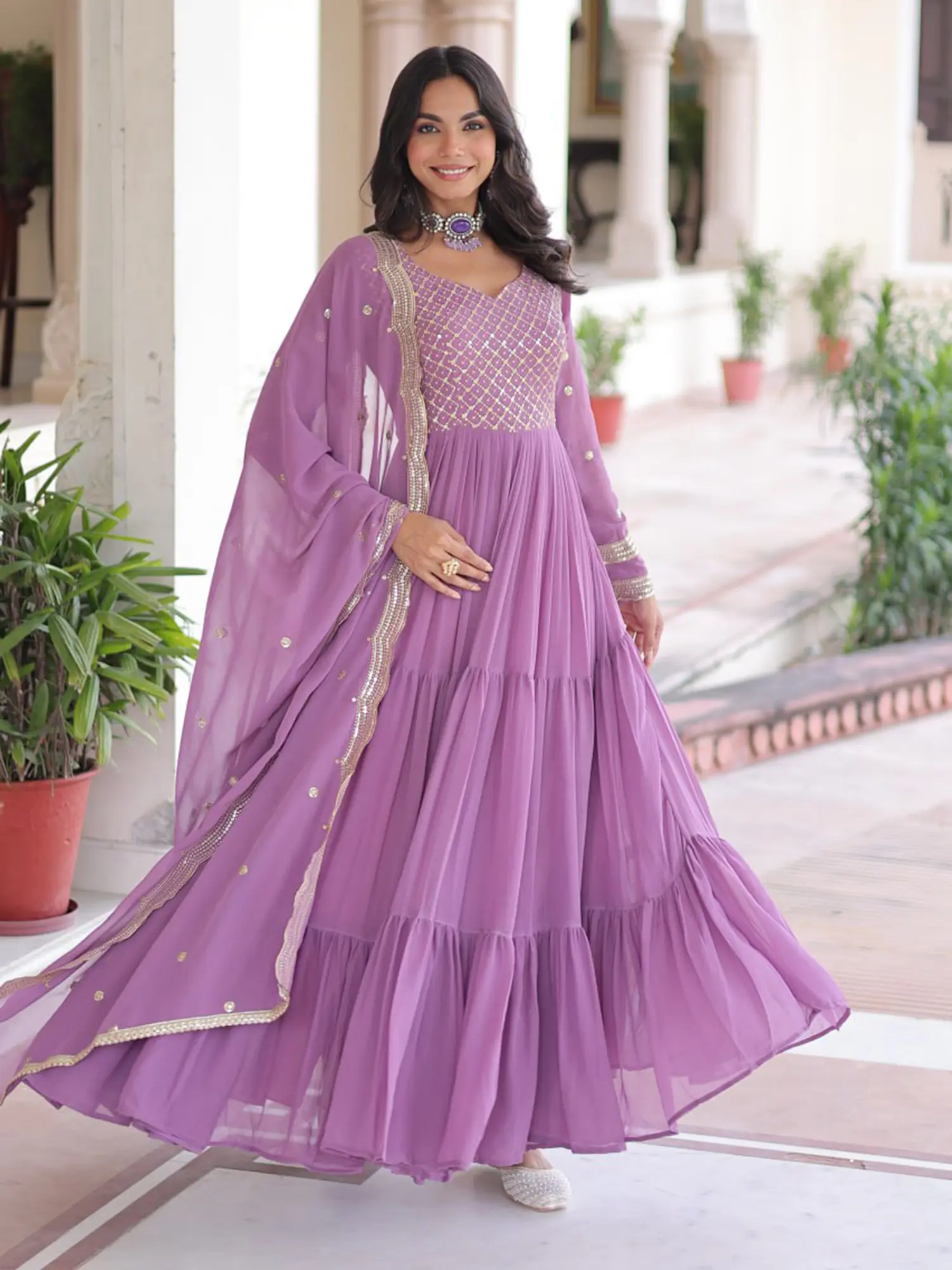 Crafted from the finest faux georgette, this piece is a testament to meticulous artistry. Each layer and pleat is carefully constructed to ensure a fluid drape and a flattering silhouette. The fabric itself whispers tales of quality, promising a luxurious feel against your skin that only artisanal craftsmanship can deliver.