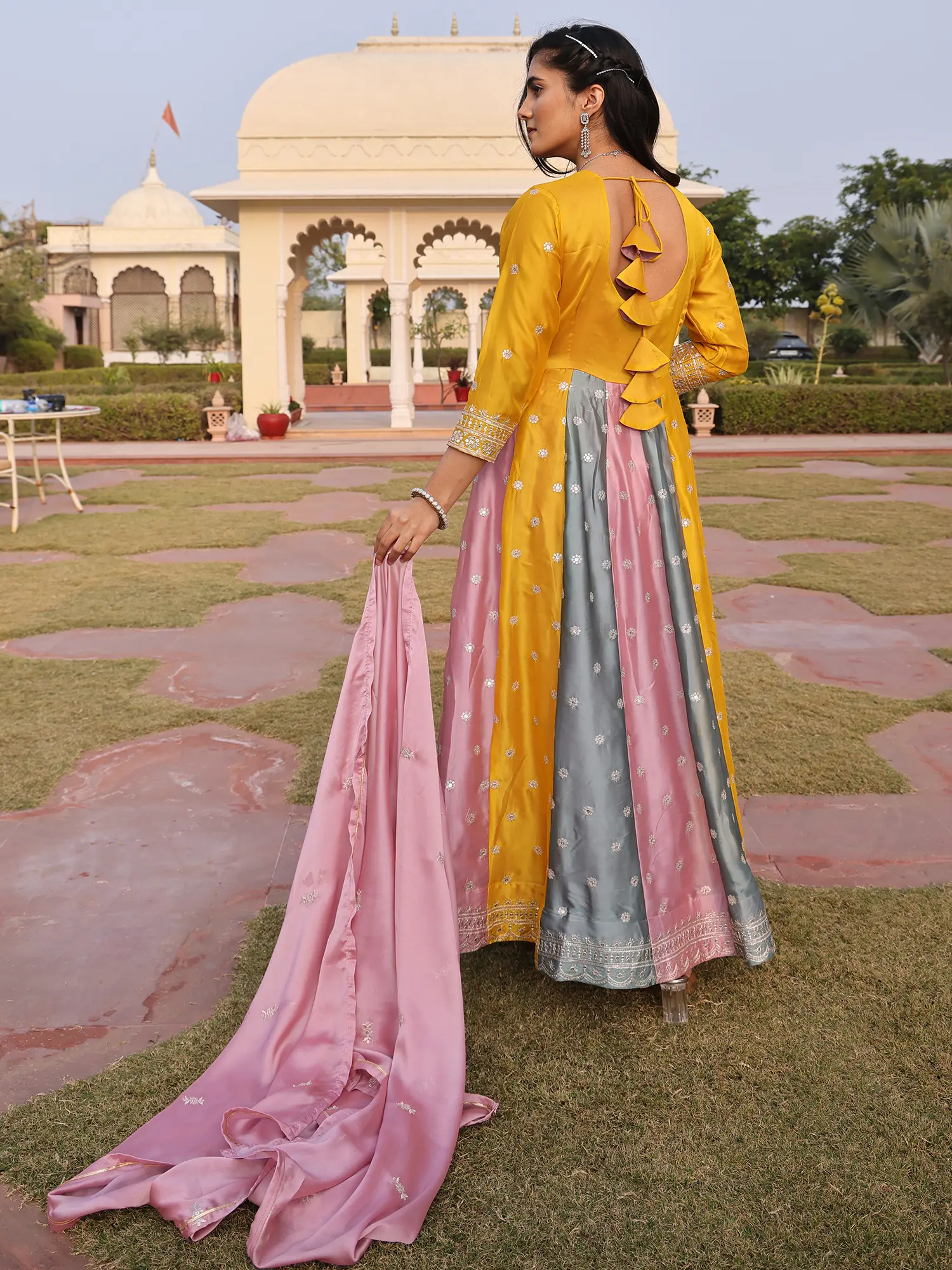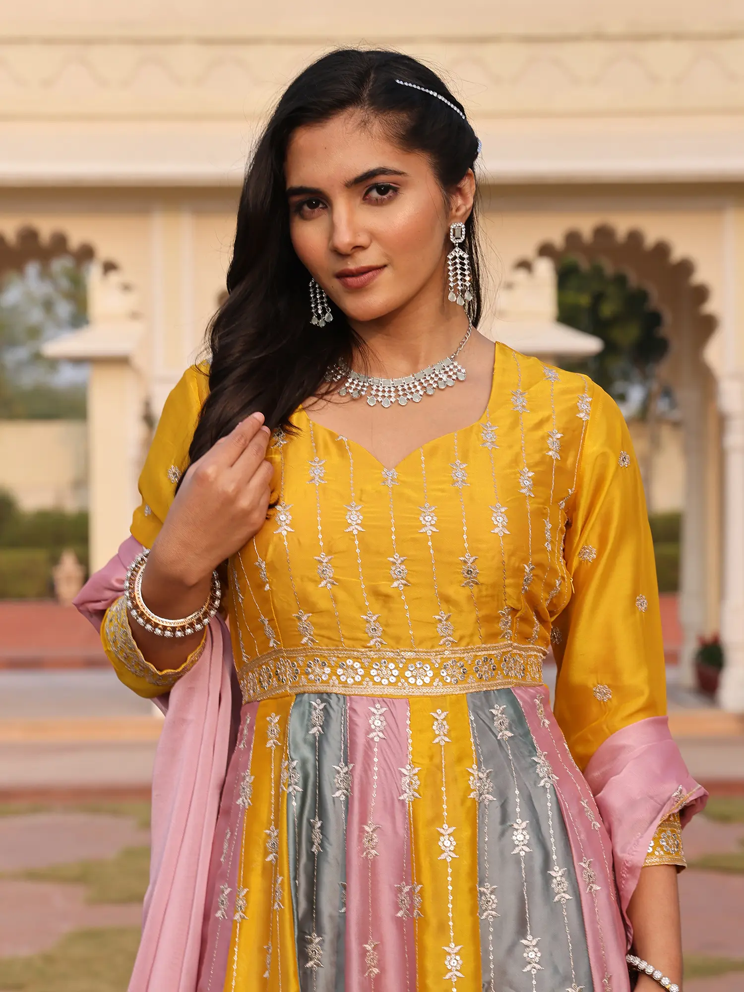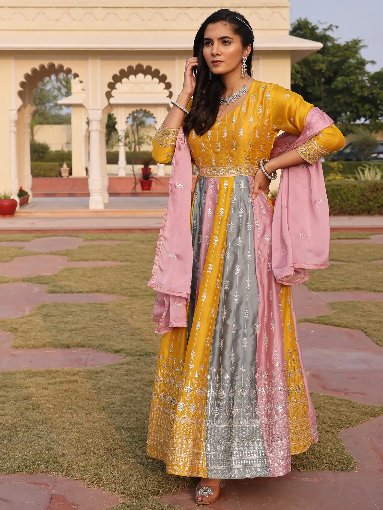 The design showcases a captivating interplay of colors, with panels of vibrant yellow, soft grey, and delicate pink flowing together seamlessly. This harmonious blend is further elevated by the elaborate sequence and embroidery that adorns the hem and bodice, creating a mesmerizing visual effect. The accompanying crepe bottom offers a complementary foundation, while the soft, flowing dupatta, also embellished, adds the perfect finishing touch, ensuring you feel as regal as you look. This particular piece is expertly tailored for a size #36 (SMALL), designed to flatter and accentuate your form.