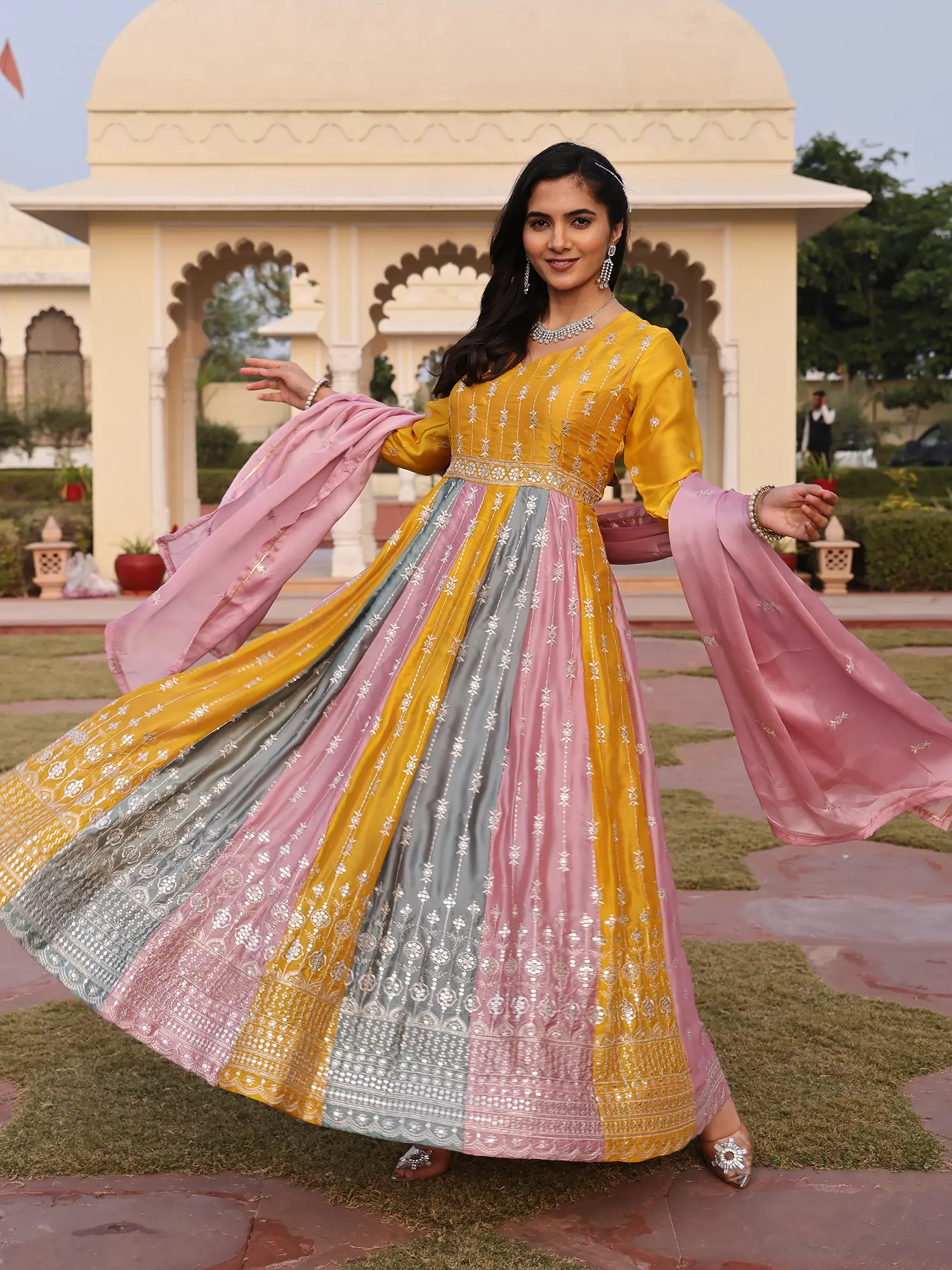 This Anarkali suit draws inspiration from the rich tapestry of Indian celebratory wear, evoking the spirit of traditional festivities and the grandeur of royal courts. It is a modern interpretation of timeless silhouettes, designed for the discerning individual who appreciates cultural depth and exquisite artistry. Wearing this ensemble connects you to a heritage of elegance that has been celebrated for generations.