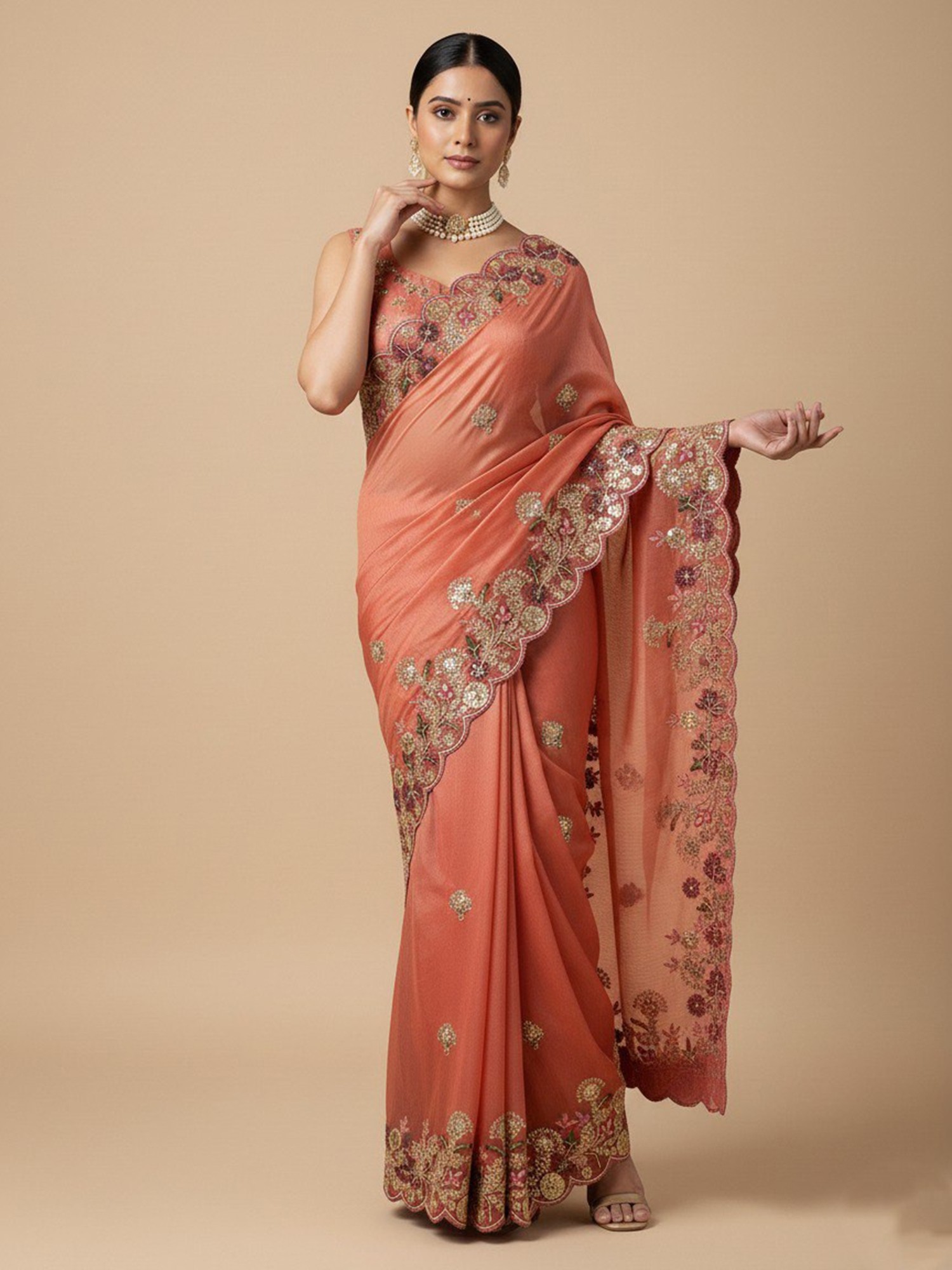 Regal Soft Fendy Chiffon Saree Featuring Rich Embroidery Cutwork Aarco Border With Mono Banglori Blouse For Bridal