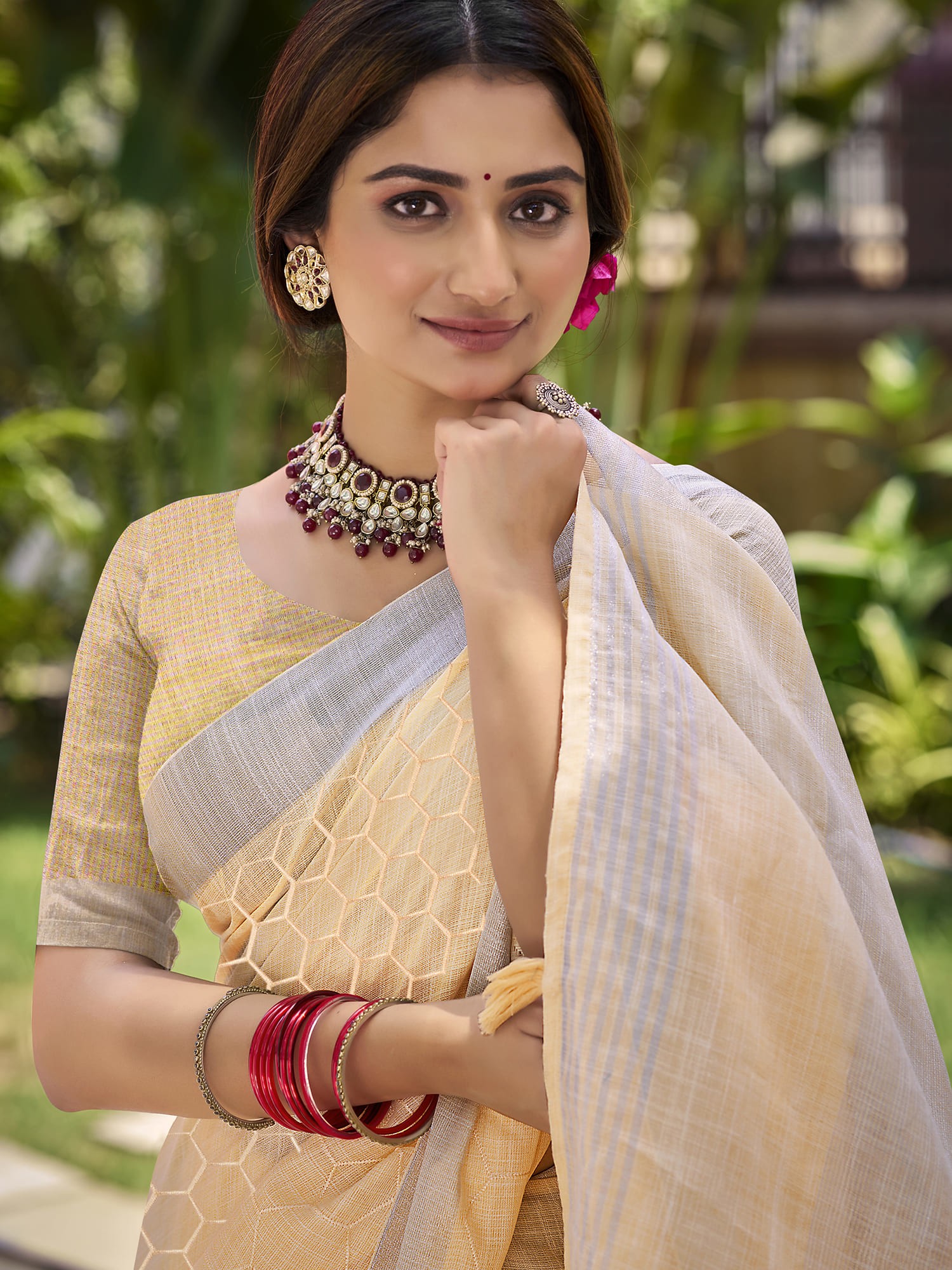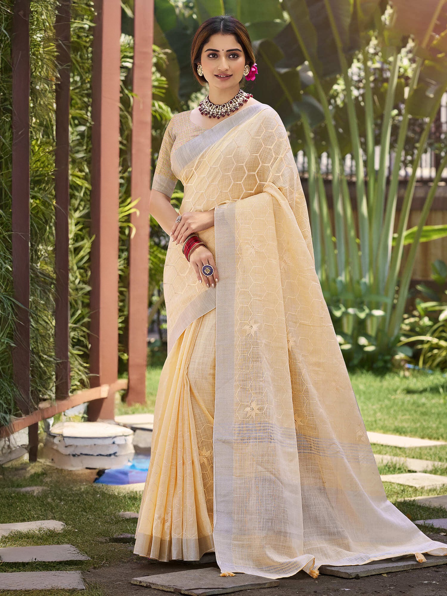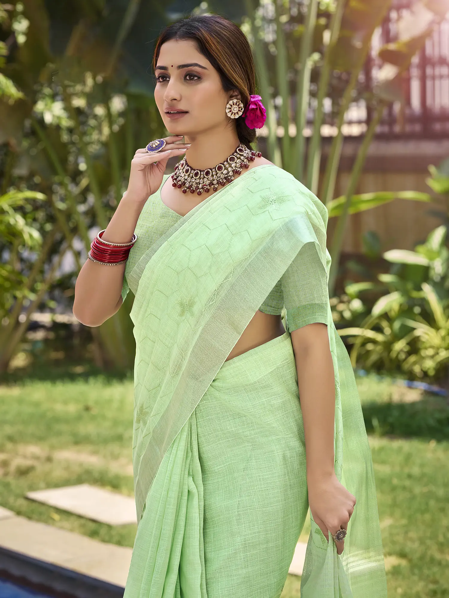 Women's Leaf Motif Linen Saree With Subtle Woven Design Perfect For Office Festive Gatherings And Everyday Wear
