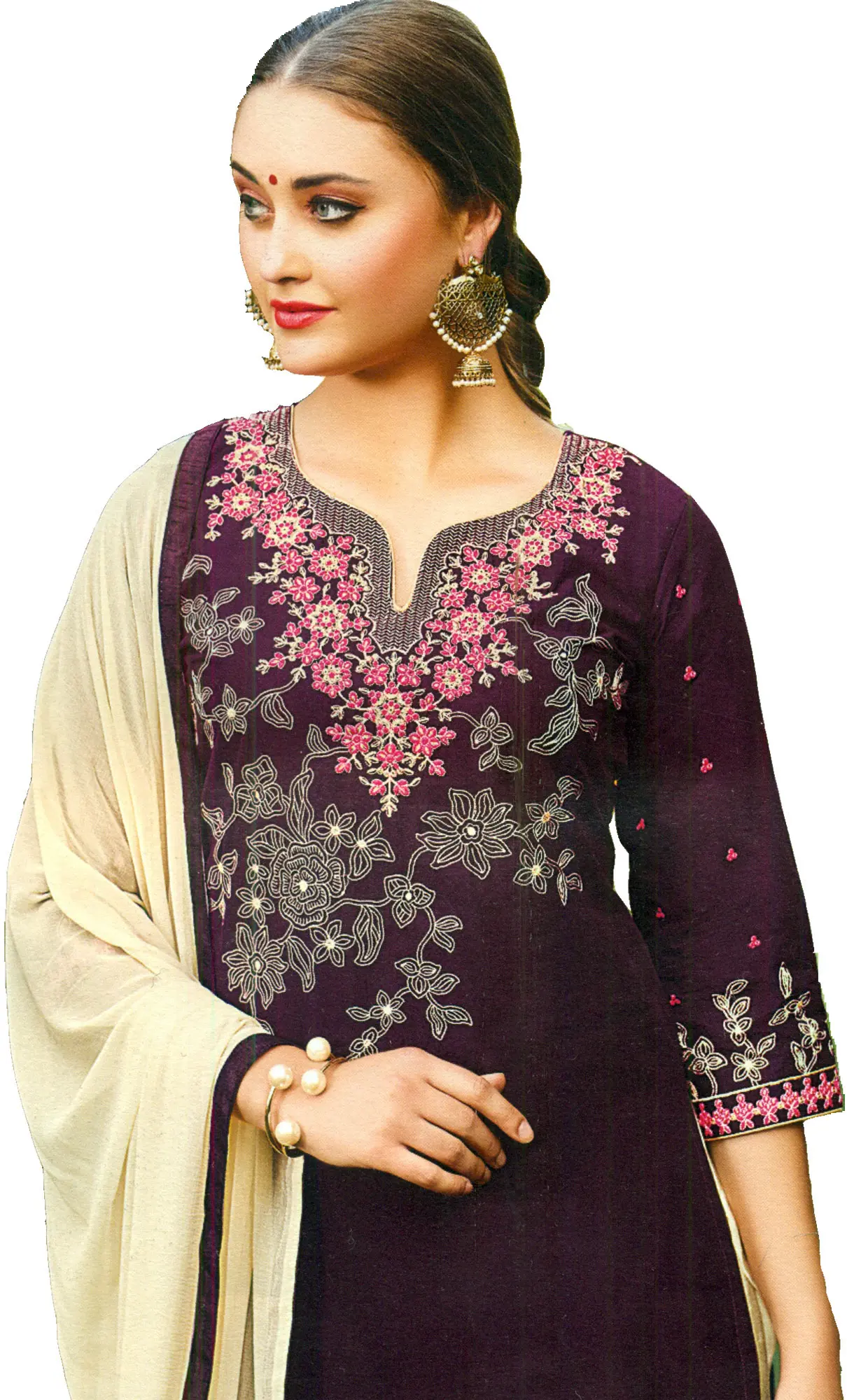 Complementing the exquisitely embroidered kameez are the classic beige Patiala salwar. The signature pleats and voluminous drape of the Patiala style offer a comfortable and flattering fit, embodying a timeless Indian silhouette. Small, scattered pink bootis are subtly woven into the fabric of the salwar, adding a hint of playful detail that harmonizes with the kameez. This traditional yet stylish bottom wear ensures freedom of movement and a distinctive ethnic flair. Completing this elegant ensemble is a flowing dupatta in a complementary light cream or beige shade. The dupatta features a rich, contrasting border that mirrors the intricate embroidery found on the kameez, tying the entire outfit together with finesse. This beautifully coordinated suit is ideal for festive gatherings, cultural events, or even semi-formal occasions where you wish to make a sophisticated statement. The pure cotton fabric ensures comfort throughout the day, allowing you to embrace the festivities with grace and confidence. This Grape Wine Patiala Salwar Kameez is more than just an outfit; it's an embodiment of traditional artistry and modern elegance.