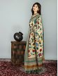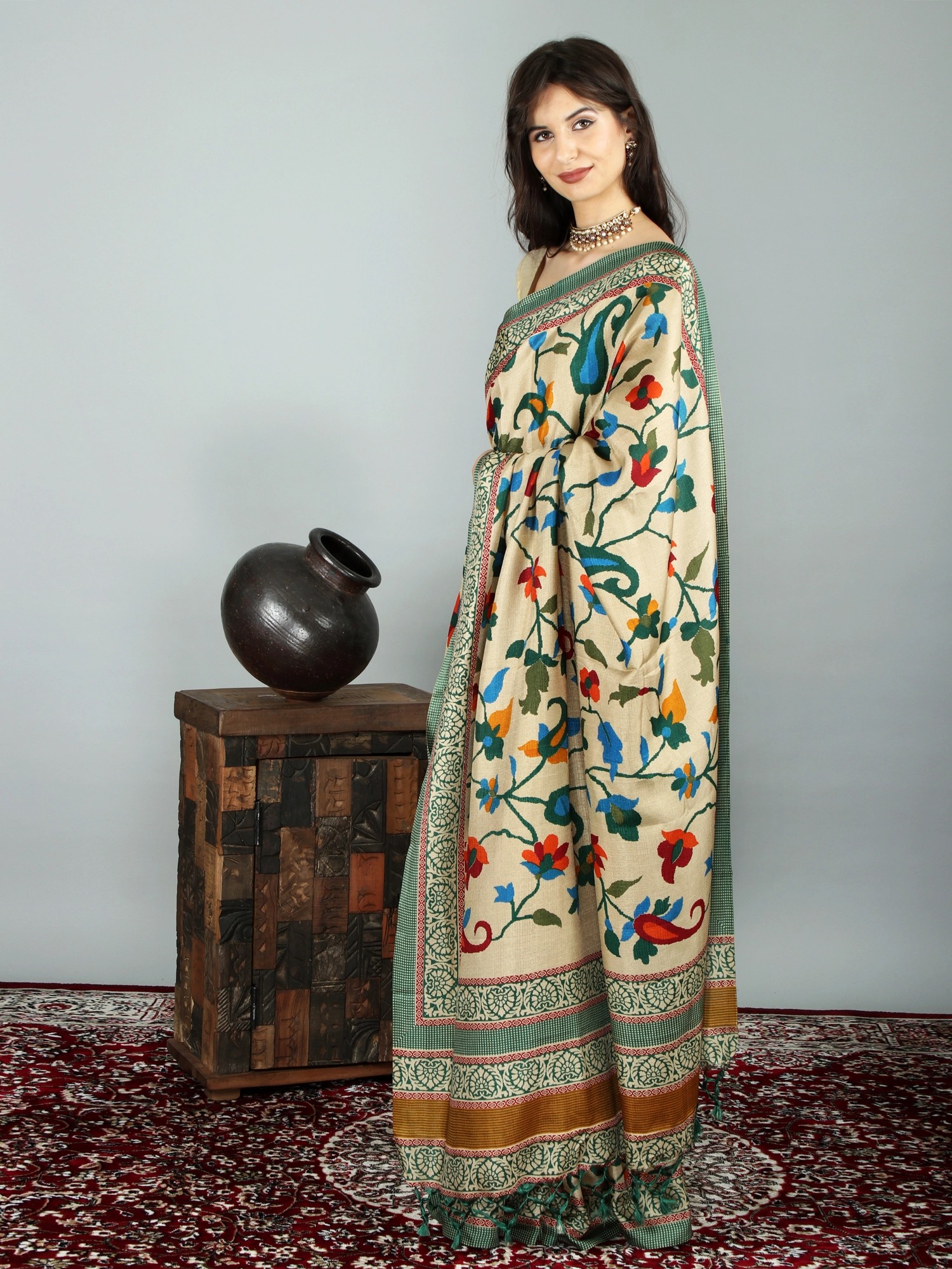 Spring has arrived! And not just in the blossoming flowers around you, it has arrived majestically seated on the fine fabric of this gorgeous digital printed saree. The designer has ideally used beautiful floral vines all over the saree, on a beige background, against which the vibrant flowers are in full bloom. The geometric border has completed the artwork that is this saree. Fashionable and easy to style, this saree is the best choice if you are looking for an everlasting impression with your taste in everyday Indian wear.