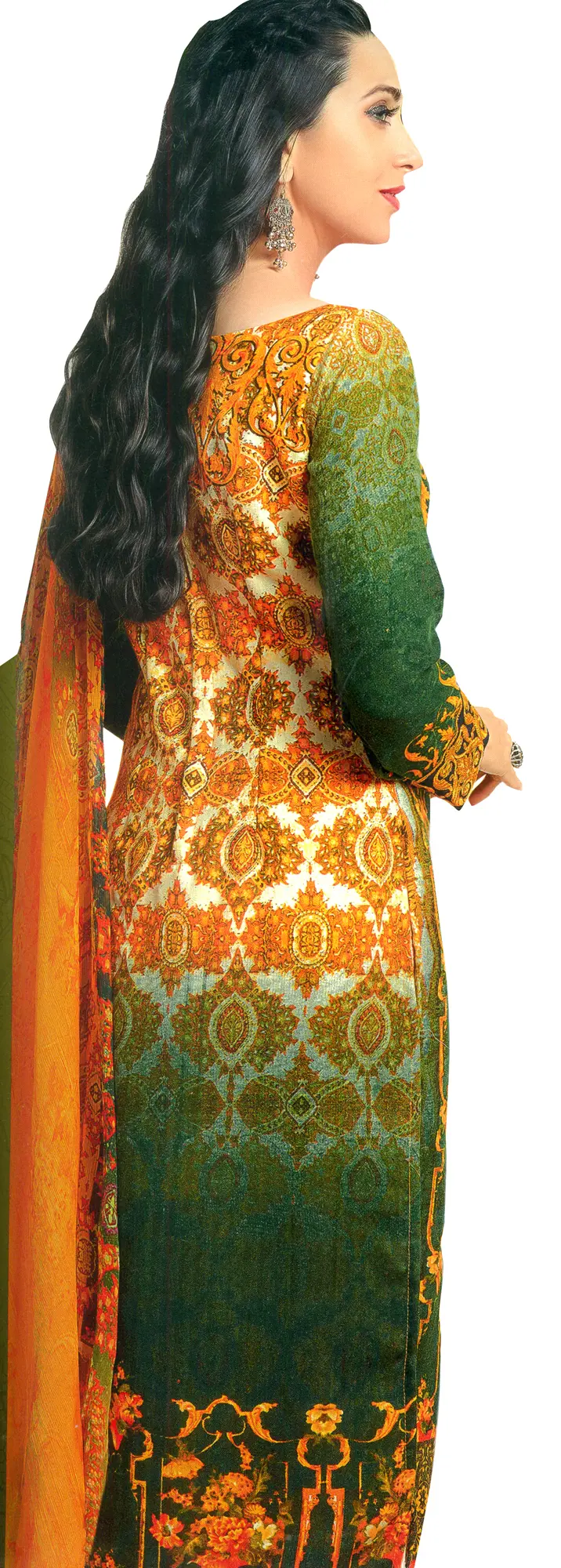 Immerse yourself in the vibrant beauty of this exquisite salwar kameez set, a true masterpiece of digital print artistry. The deep, rich green of the kameez serves as a canvas for an intricate and captivating pattern in striking amber and golden hues. This design evokes a sense of timeless elegance, with motifs that are both traditional and refreshingly modern. The placement of the print creates a visually dynamic flow, drawing the eye across the garment with its delicate details and bold statements.