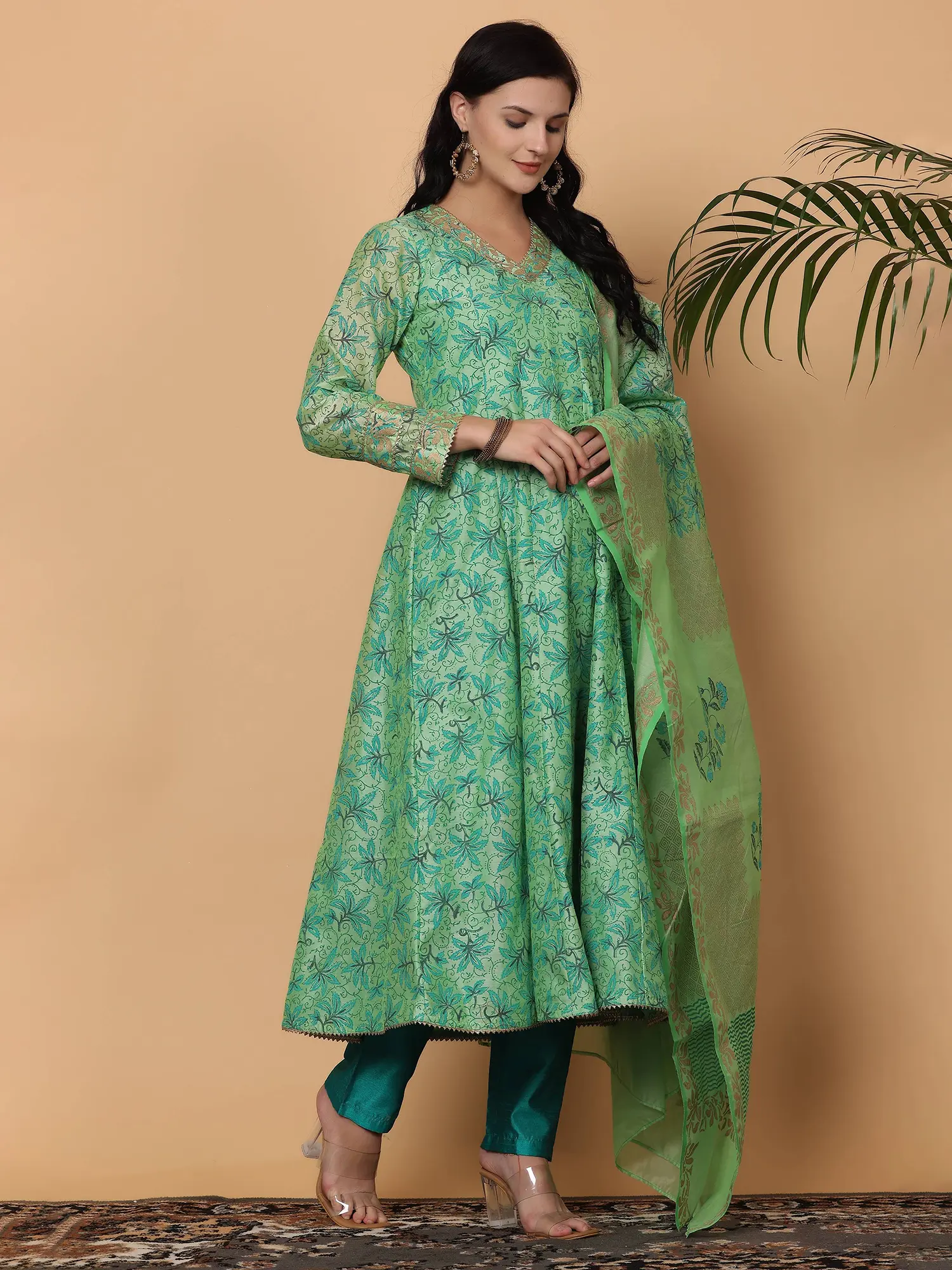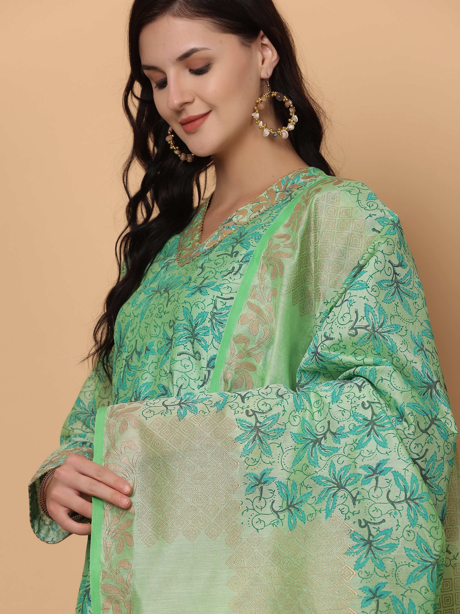This Chanderi silk kurta set is an ode to traditional craftsmanship, reinterpreted for the contemporary woman. The combination of the flowing Chanderi fabric, the detailed block prints, and the rich silk accents creates a garment that is both comfortable and undeniably chic. Perfect for festive gatherings, weddings, or any celebratory event, this set promises to make you the center of attention. The soothing green palette evokes a sense of freshness and vibrancy, making it a delightful addition to any ethnic wear collection. Pair it with statement jewelry and elegant heels to complete a look that is sophisticated, graceful, and utterly captivating.