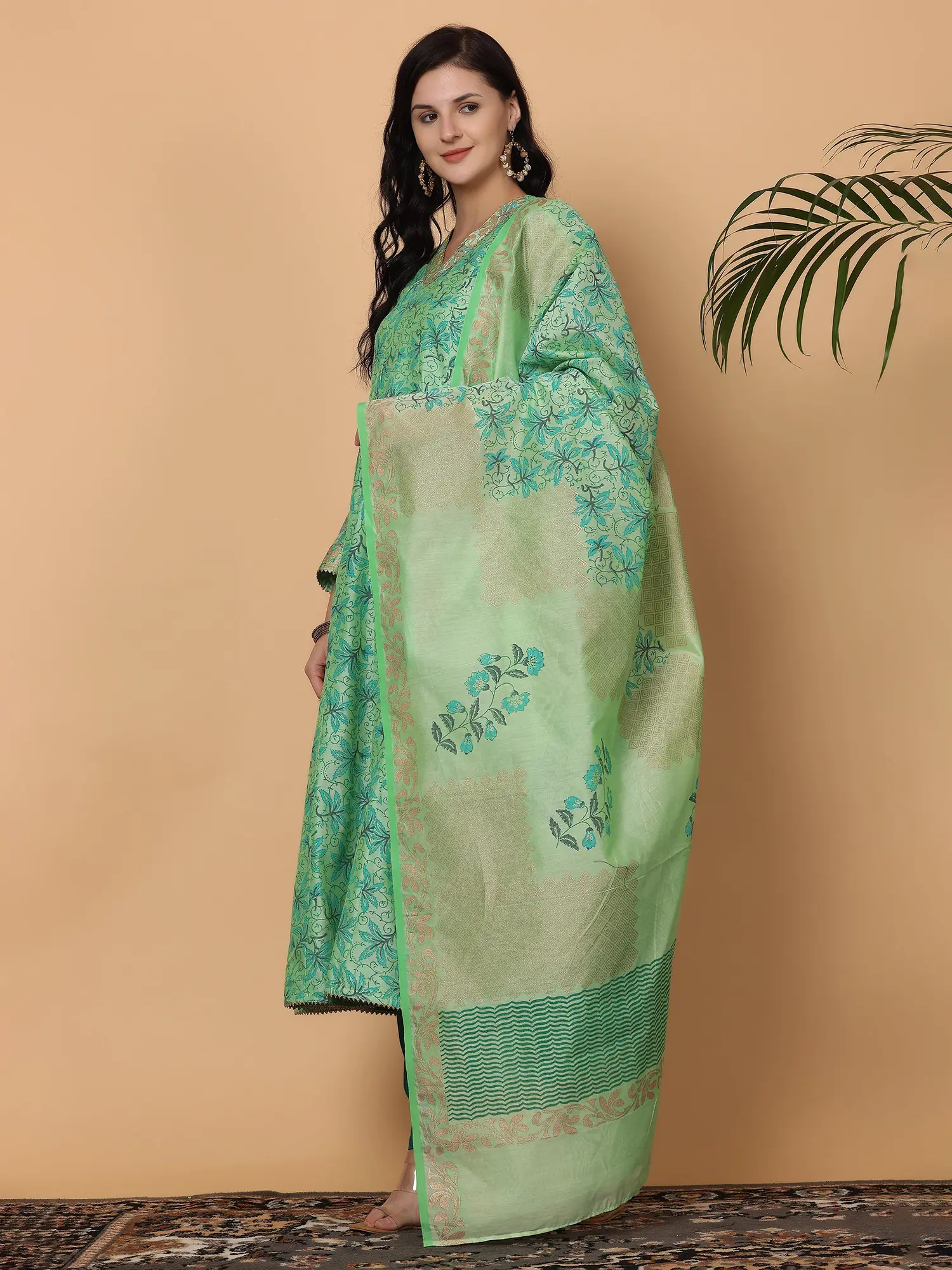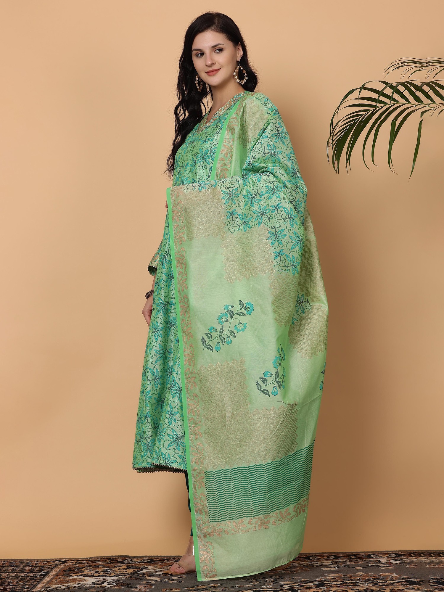 To perfectly complement the kurta, this set includes a pair of lustrous silk pants in a deep, rich green hue. The smooth texture of the silk offers a luxurious feel against the skin and a flattering silhouette. The ensemble is completed with a matching Chanderi dupatta, a true masterpiece in itself. The dupatta showcases a beautiful blend of woven patterns and delicate floral block prints, echoing the design of the kurta. Its generous size allows for versatile styling, whether draped elegantly over the shoulders or fashioned into a more elaborate drape. The border of the dupatta features intricate woven detailing, adding a final touch of opulence.