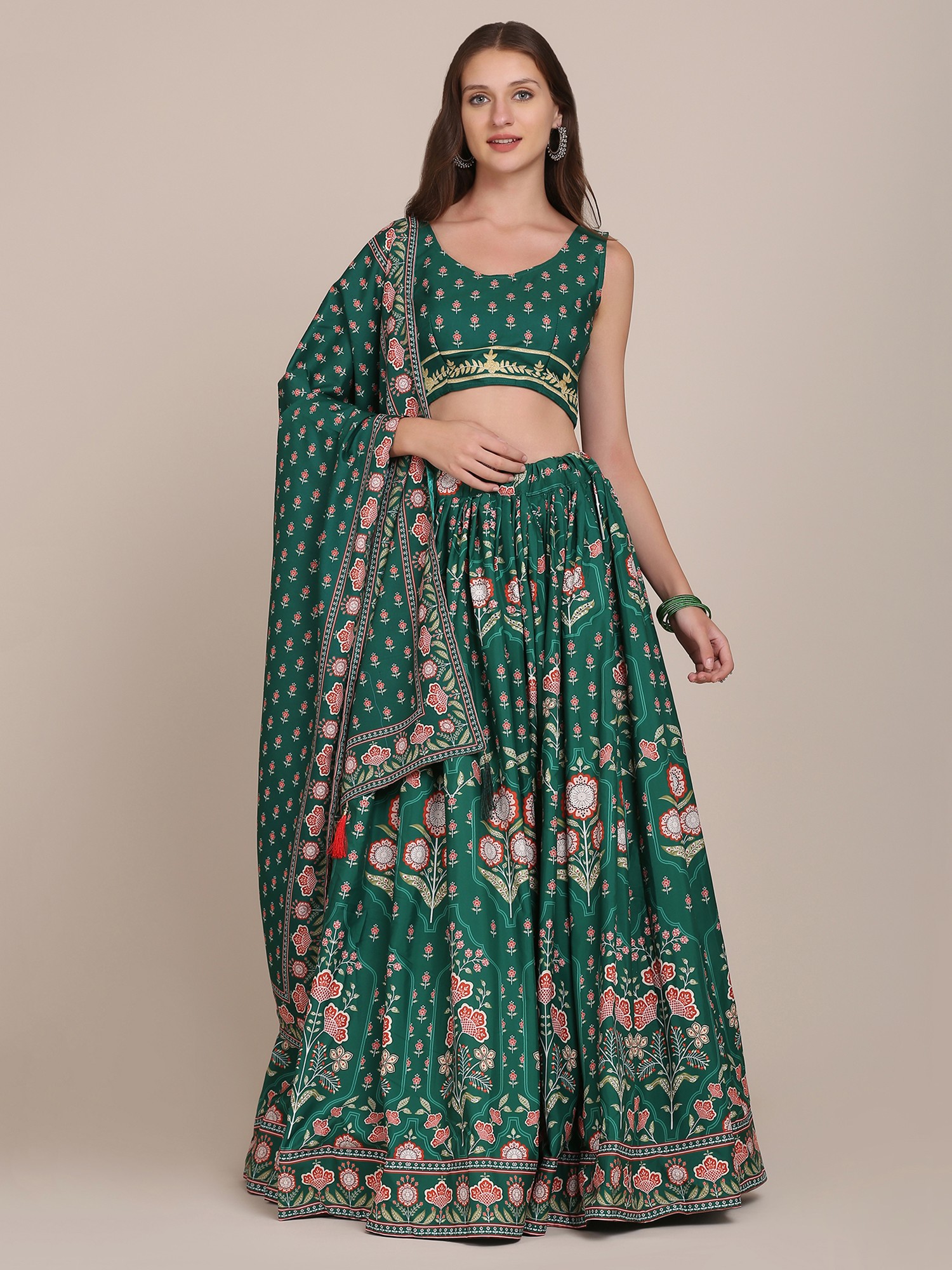 Cream Cotton Multicolor Satin Digital Print Navratri Lehenga Choli With Side Chain - Dori And Green Muslin Dupatta
