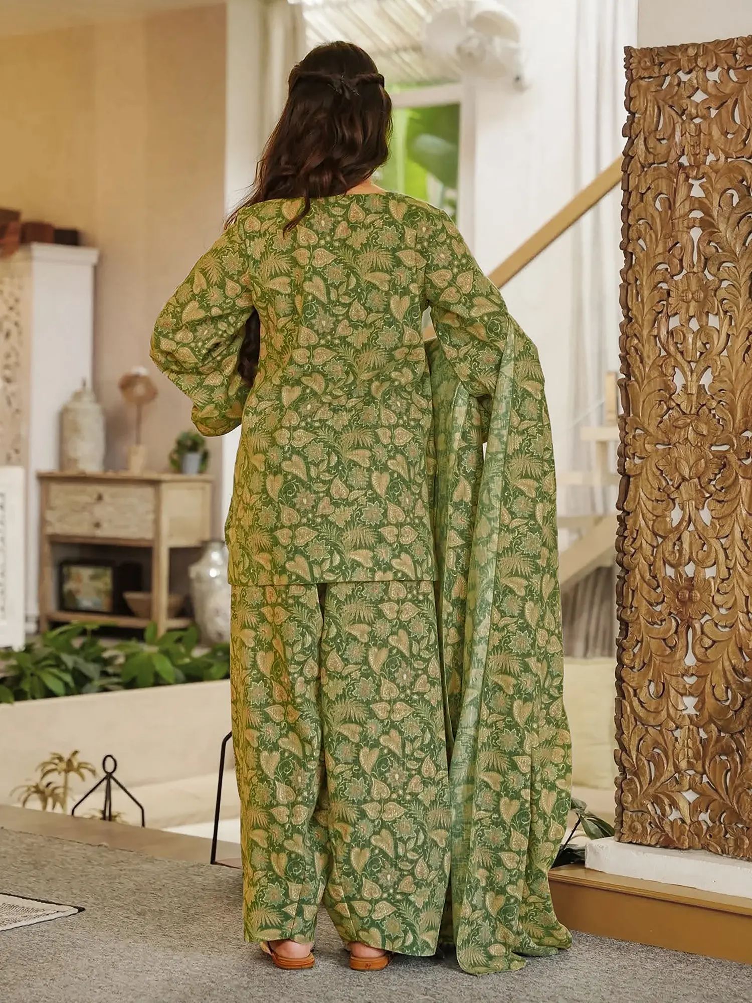 Adorn yourself in a captivating print, where intricate motifs dance across a rich green backdrop. This carefully curated pattern lends a unique personality to the design, showcasing a harmonious blend of tradition and contemporary aesthetic. The accompanying dupatta is designed to perfectly complement the suit, adding an ethereal layer of grace.