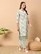 Greenish-Grey Lace Work All Over Floral Print V-Neck Cotton Kurti With Bottom For Festive Occasion