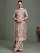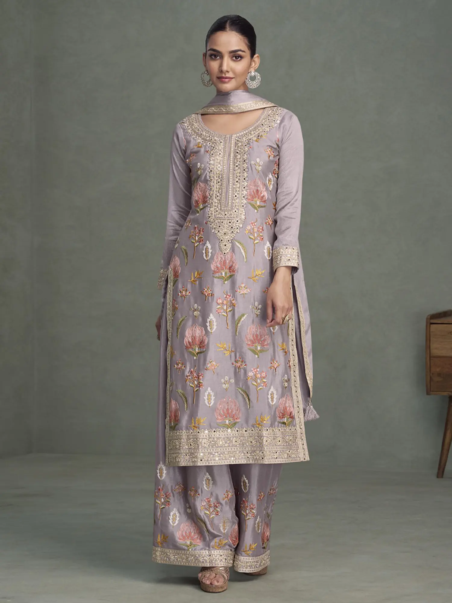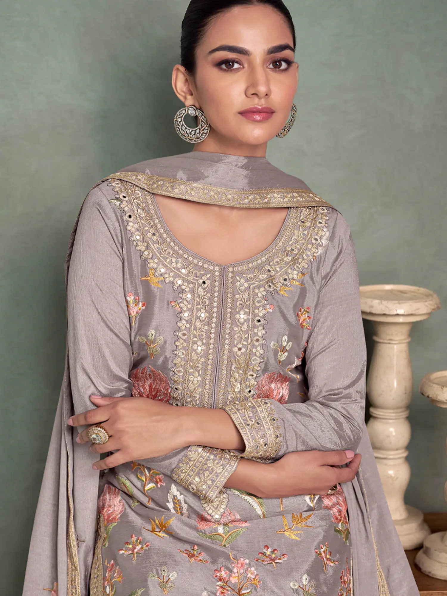Crafted from premium chinon, this suit promises not only a magnificent appearance but also exceptional comfort. The fabric's lightweight nature and smooth texture make it ideal for extended wear during long celebratory events. The thoughtful design ensures ease of movement, allowing you to enjoy every moment without compromise. Adorned with this exquisite ensemble, you will radiate an undeniable charm and sophistication, becoming the center of admiration. This grey chinon suit is a testament to the beauty of traditional Indian wear, reimagined for the modern connoisseur.