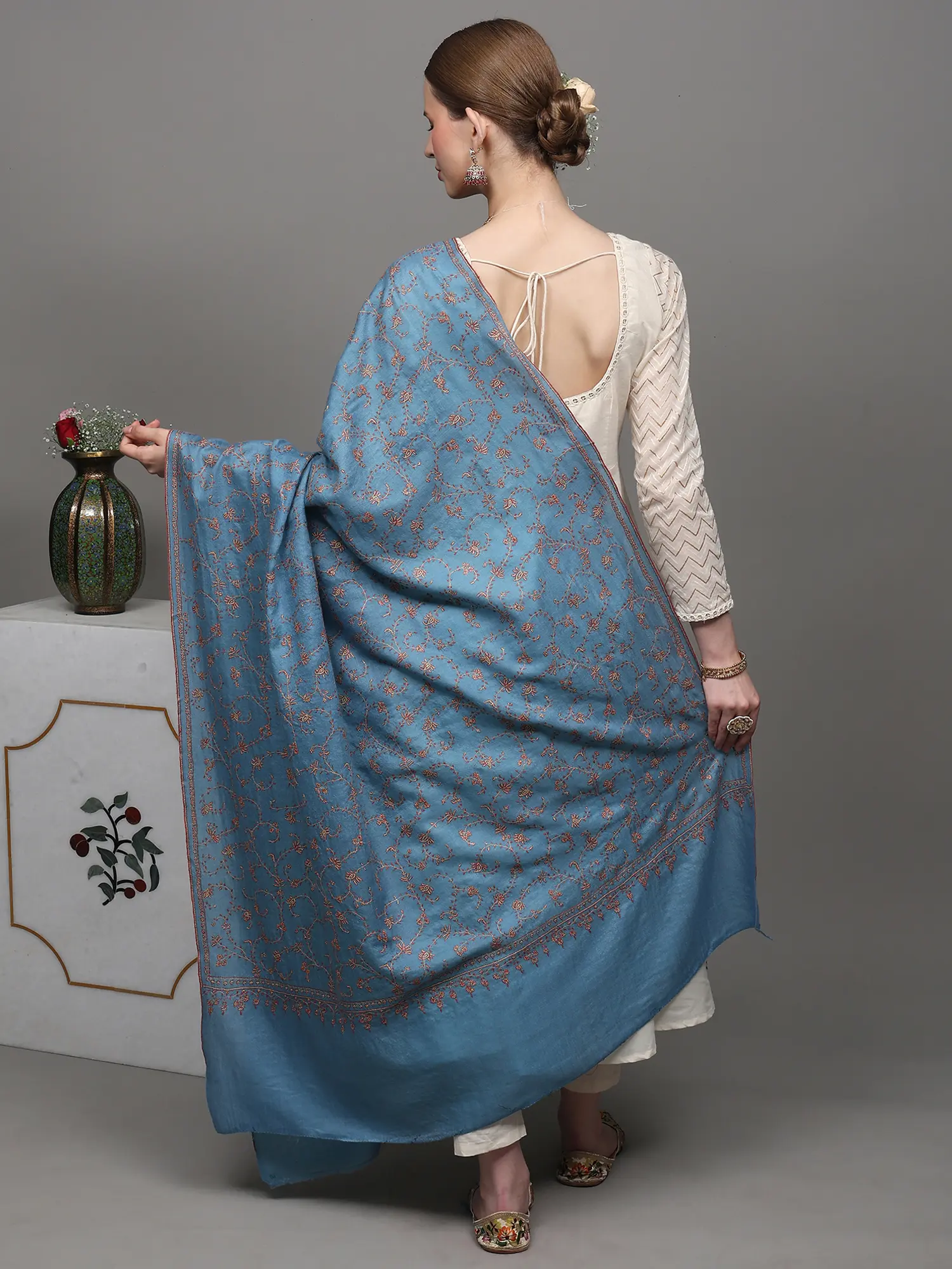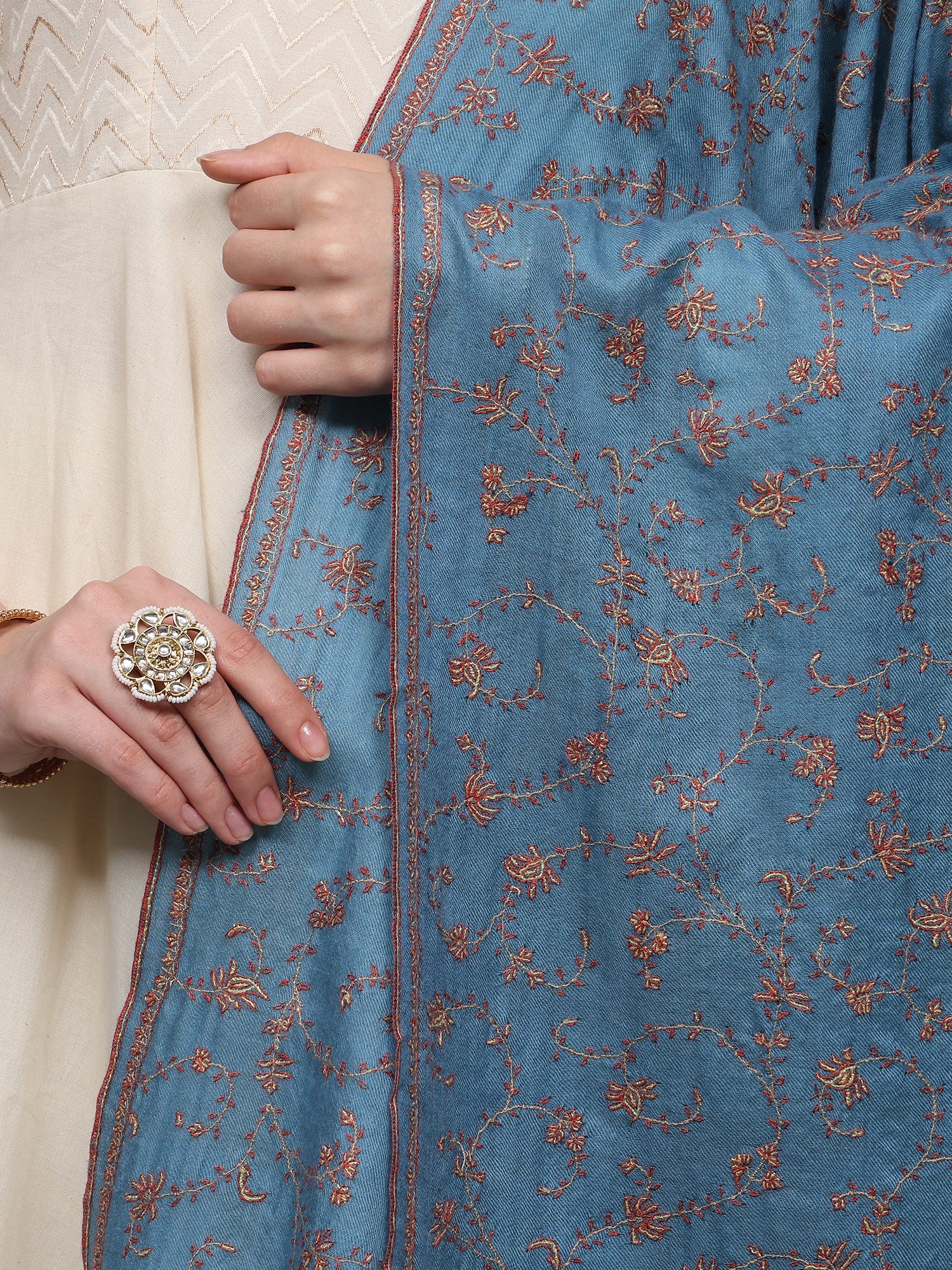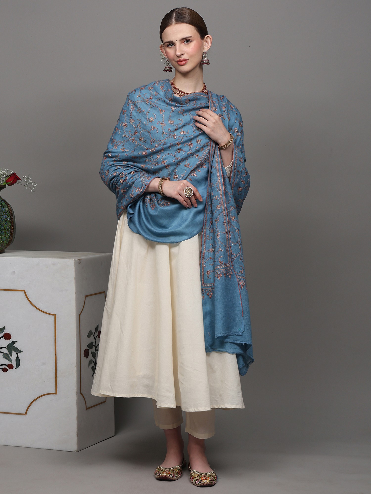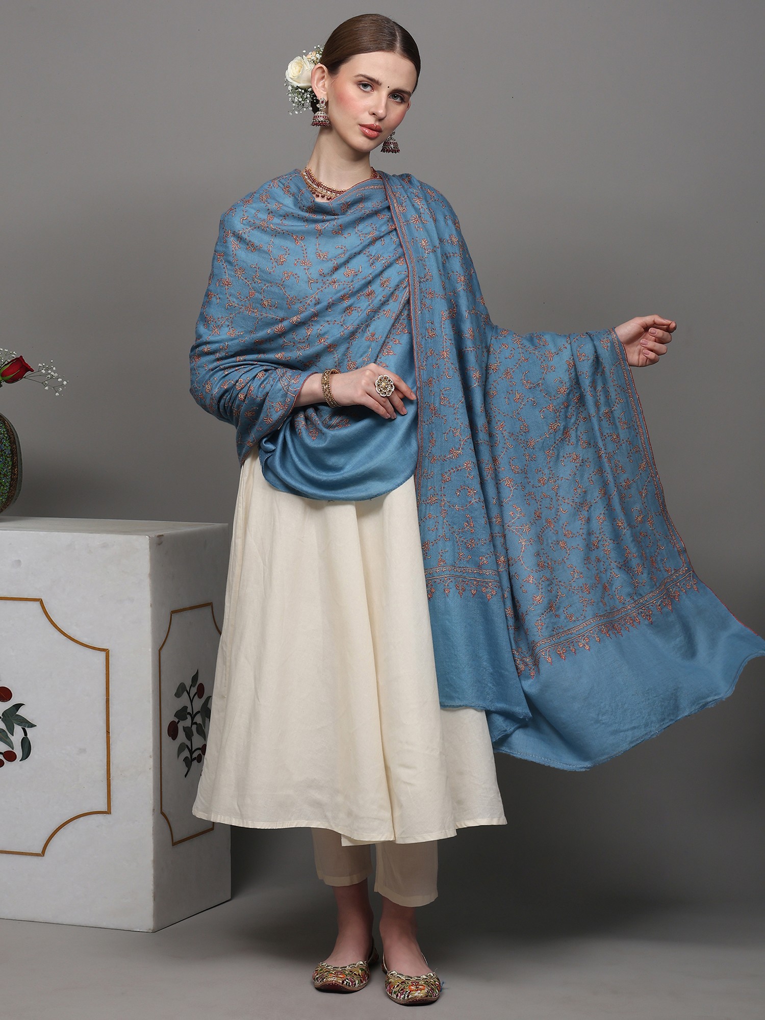 This artwork (Pashmina shawl), a canvas of pure elegance, unfurls in a mesmerising symphony of colours. Its ethereal greyish-blue hue, reminiscent of twilight skies, cradles the wearer in a tranquil embrace. Each delicate thread whispers tales of craftsmanship and luxury. The canvas, adorned with all-over floral Kalamkari embroidery, blooms like a garden in full glory. Intricate motifs dance with finesse, weaving stories of tradition and artistry. This masterpiece, spun from the finest cashmere, is a tribute to opulence and sophistication. Draped in its opulent embrace, you are transported to a realm where beauty and craftsmanship unite, leaving an indelible mark on the senses.