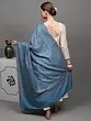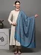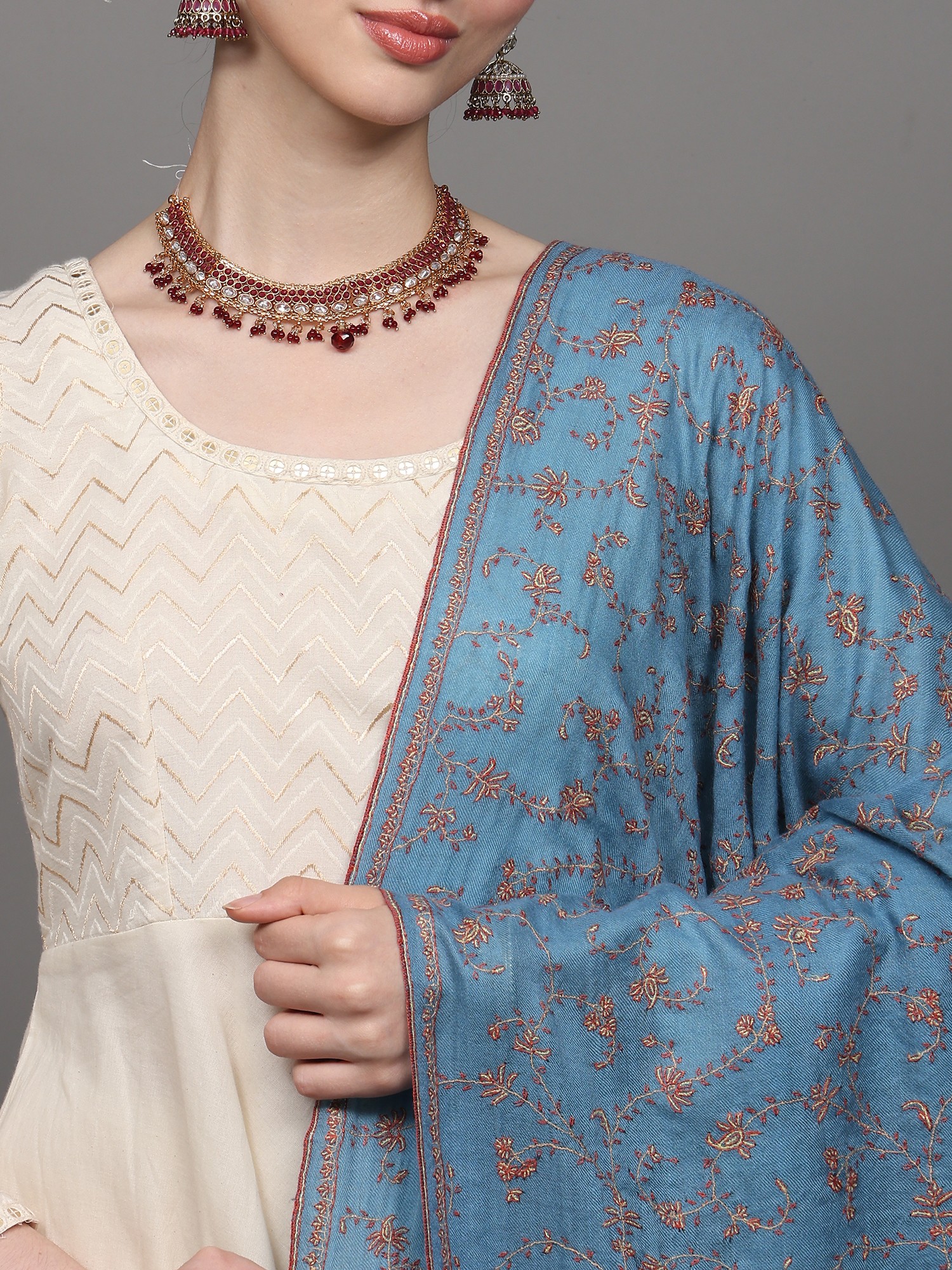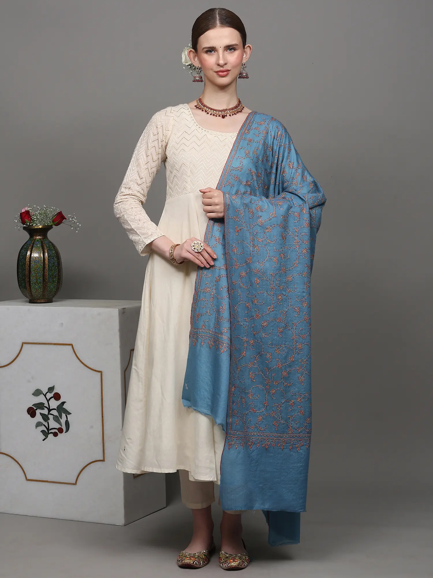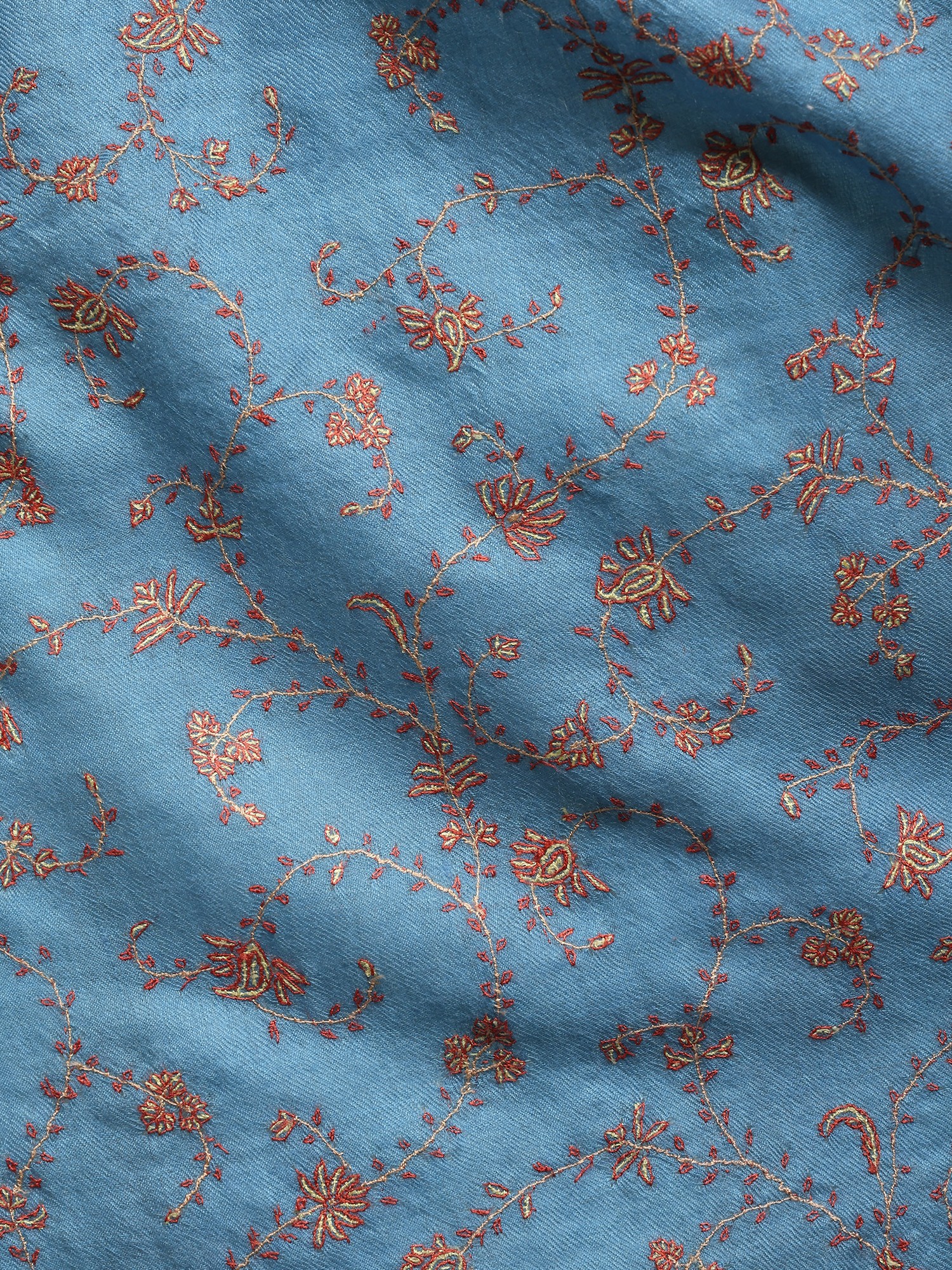 This artwork (Pashmina shawl), a canvas of pure elegance, unfurls in a mesmerising symphony of colours. Its ethereal greyish-blue hue, reminiscent of twilight skies, cradles the wearer in a tranquil embrace. Each delicate thread whispers tales of craftsmanship and luxury. The canvas, adorned with all-over floral Kalamkari embroidery, blooms like a garden in full glory. Intricate motifs dance with finesse, weaving stories of tradition and artistry. This masterpiece, spun from the finest cashmere, is a tribute to opulence and sophistication. Draped in its opulent embrace, you are transported to a realm where beauty and craftsmanship unite, leaving an indelible mark on the senses.