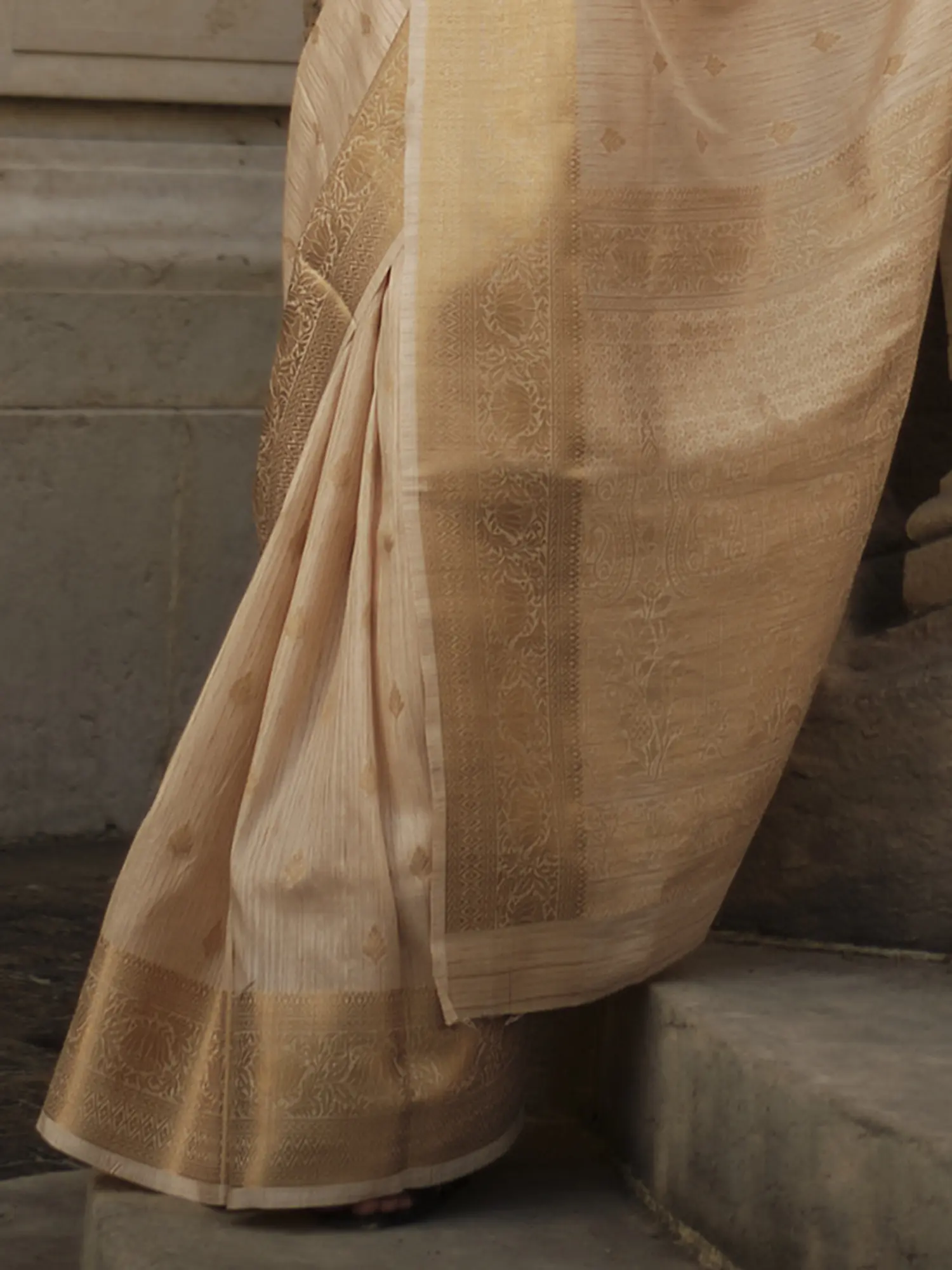 Neutral-Gray Tussar Silk Saree with Temple Border with Golden Thread woven Stripes on Anchal