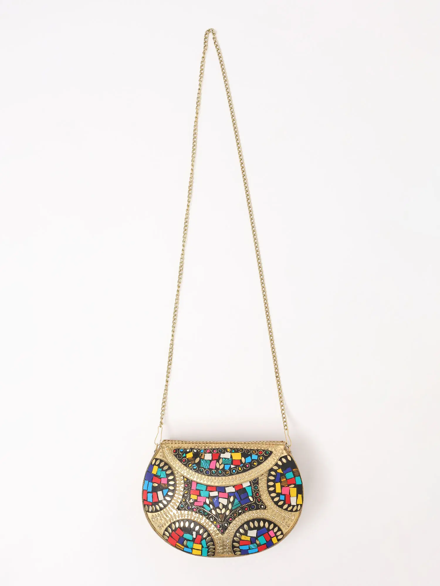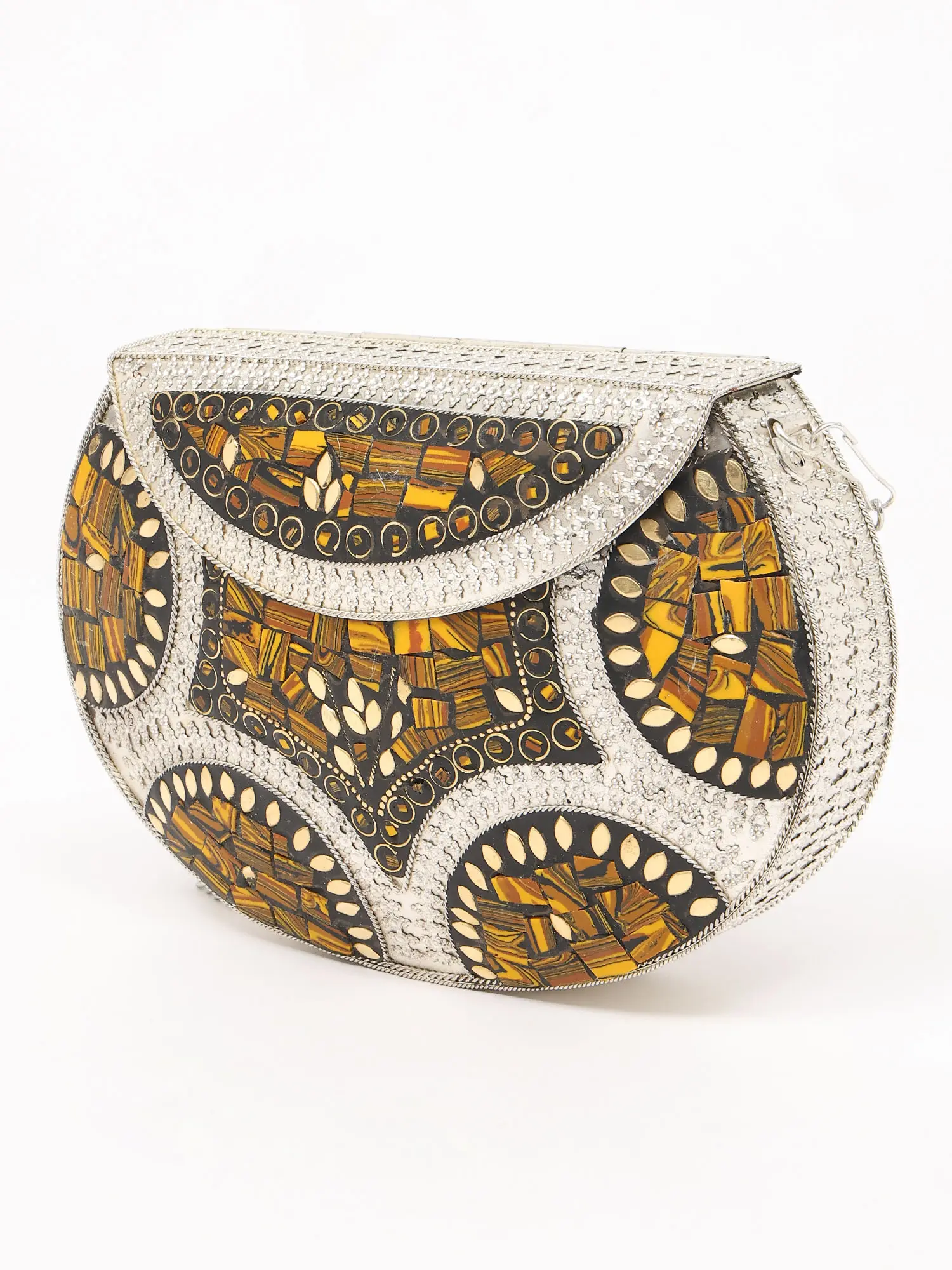 Handmade Metal Clutch Bag with Mosaic Stone work with Detachable Chain Strap