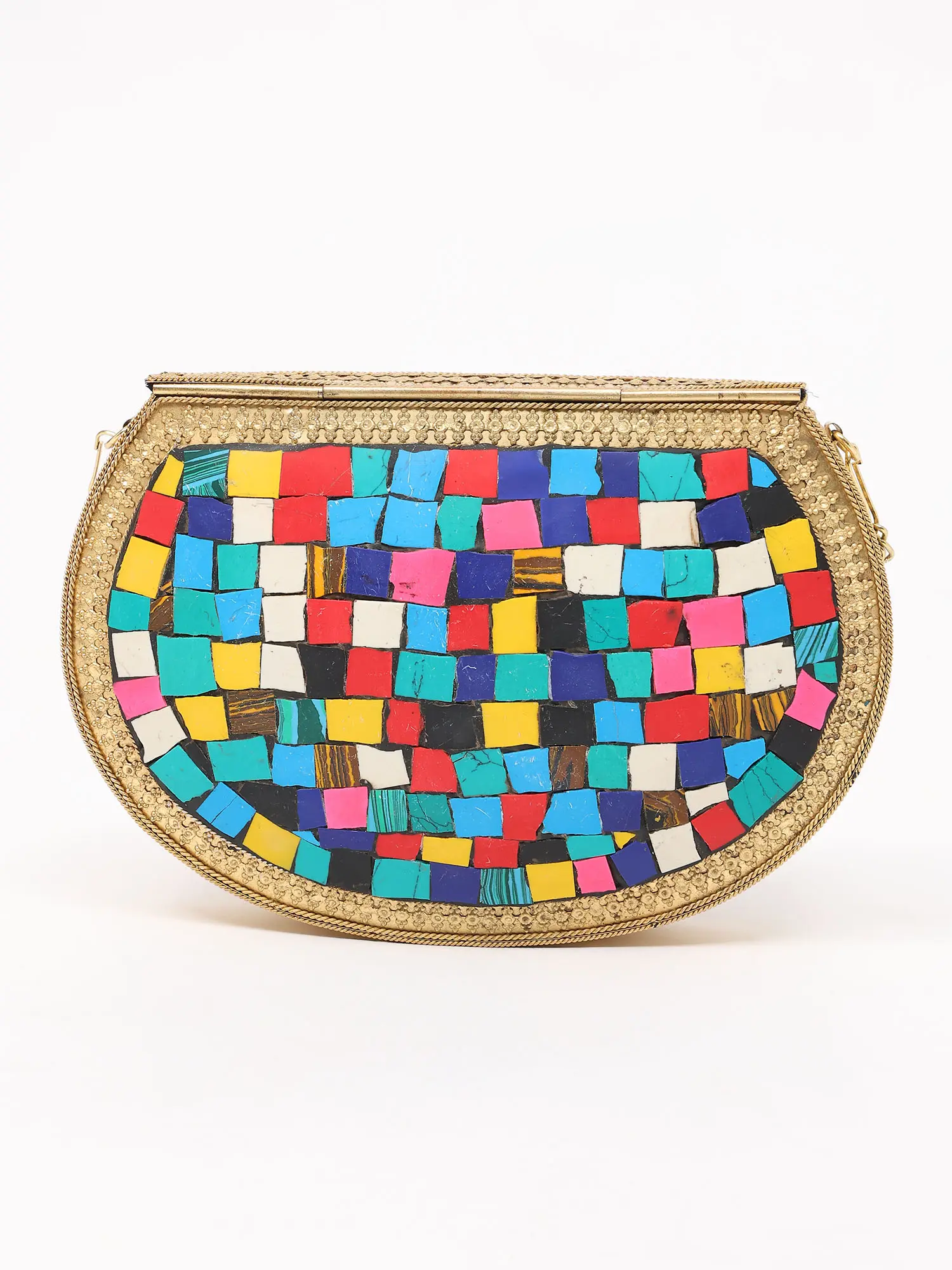 Multicolor Mosaic Stone Metal Clutch Bag with Chain Strap