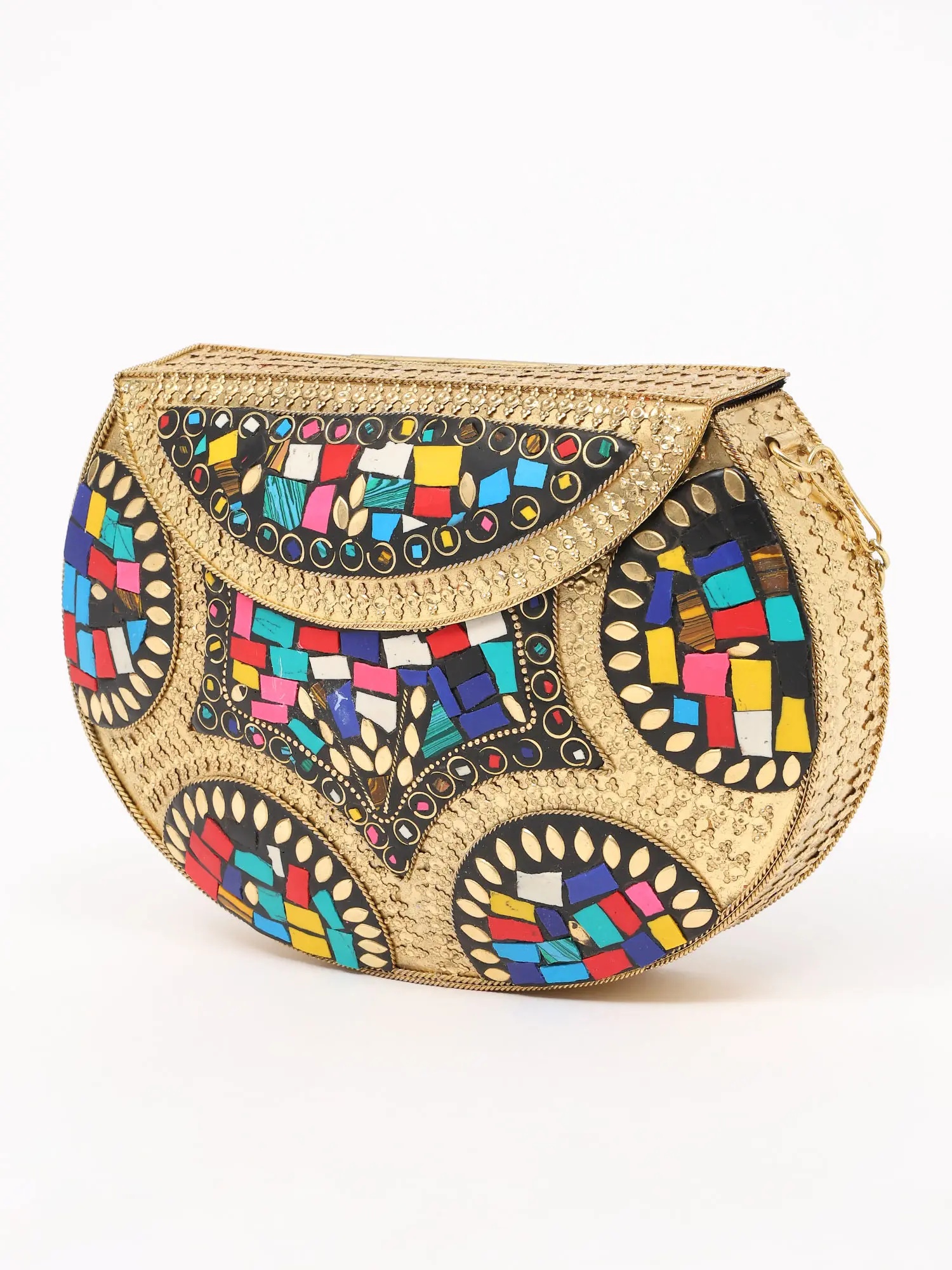 This isn't just a handbag; it's a work of art. Crafted by hand, this unique clutch boasts a captivating design that's sure to turn heads. The rich, golden metal base provides a stunning backdrop for the vibrant mosaic work, a kaleidoscope of colors and textures that creates an eye-catching pattern. Each piece of mosaic is carefully placed, showcasing the artisan's skill and dedication to detail. This clutch is more than an accessory; it's a conversation starter, a reflection of your individual style, and a testament to the beauty of handcrafted artistry. The semi-circular shape adds a touch of elegance and sophistication, making it the perfect finishing touch to any outfit.