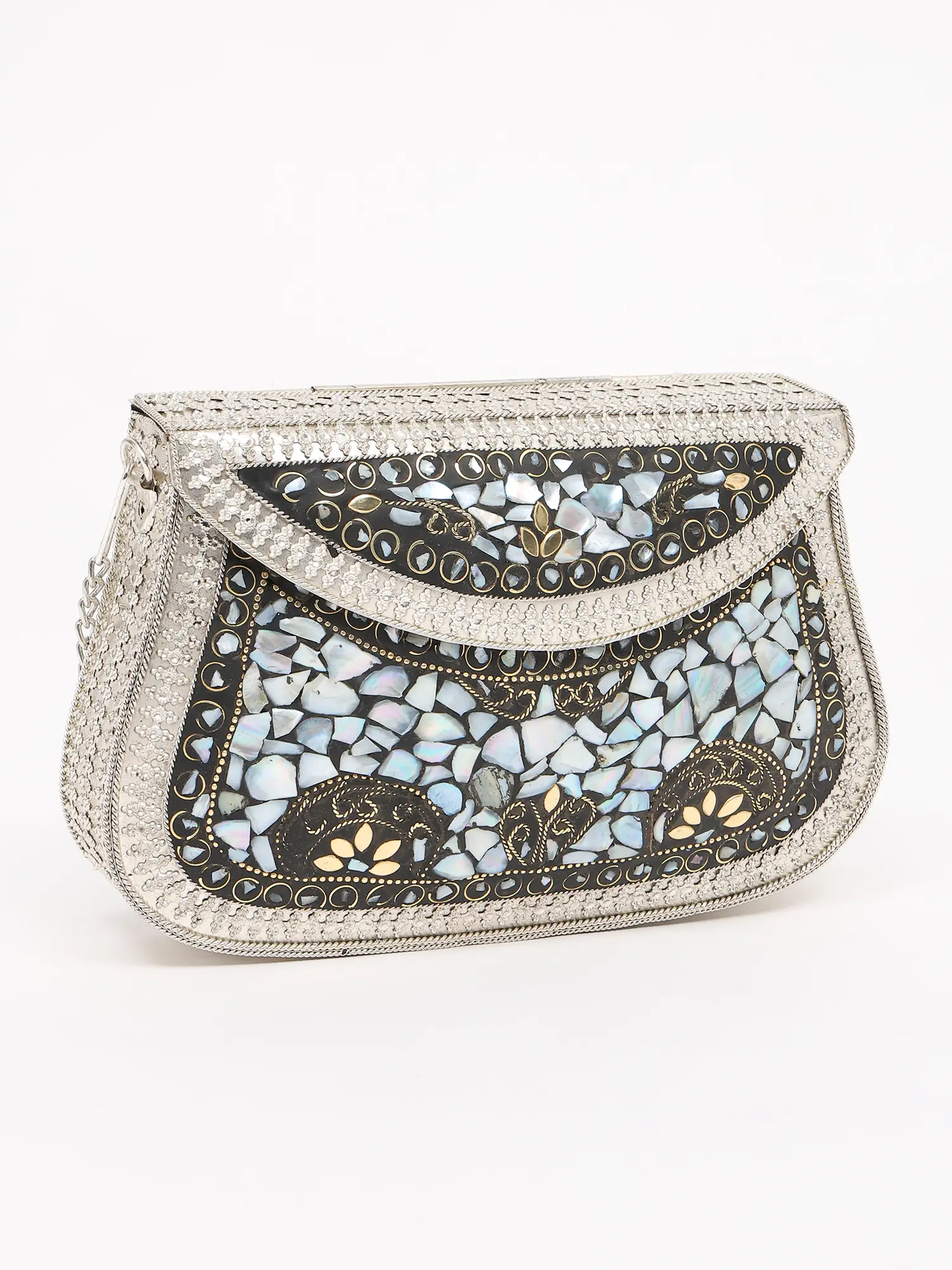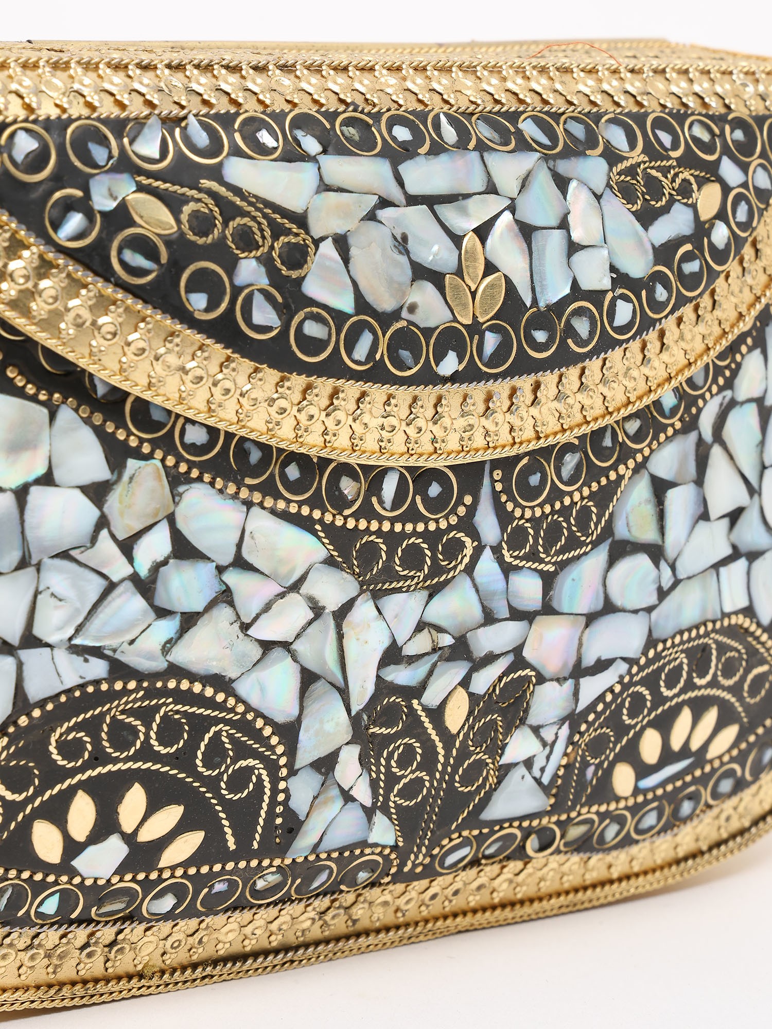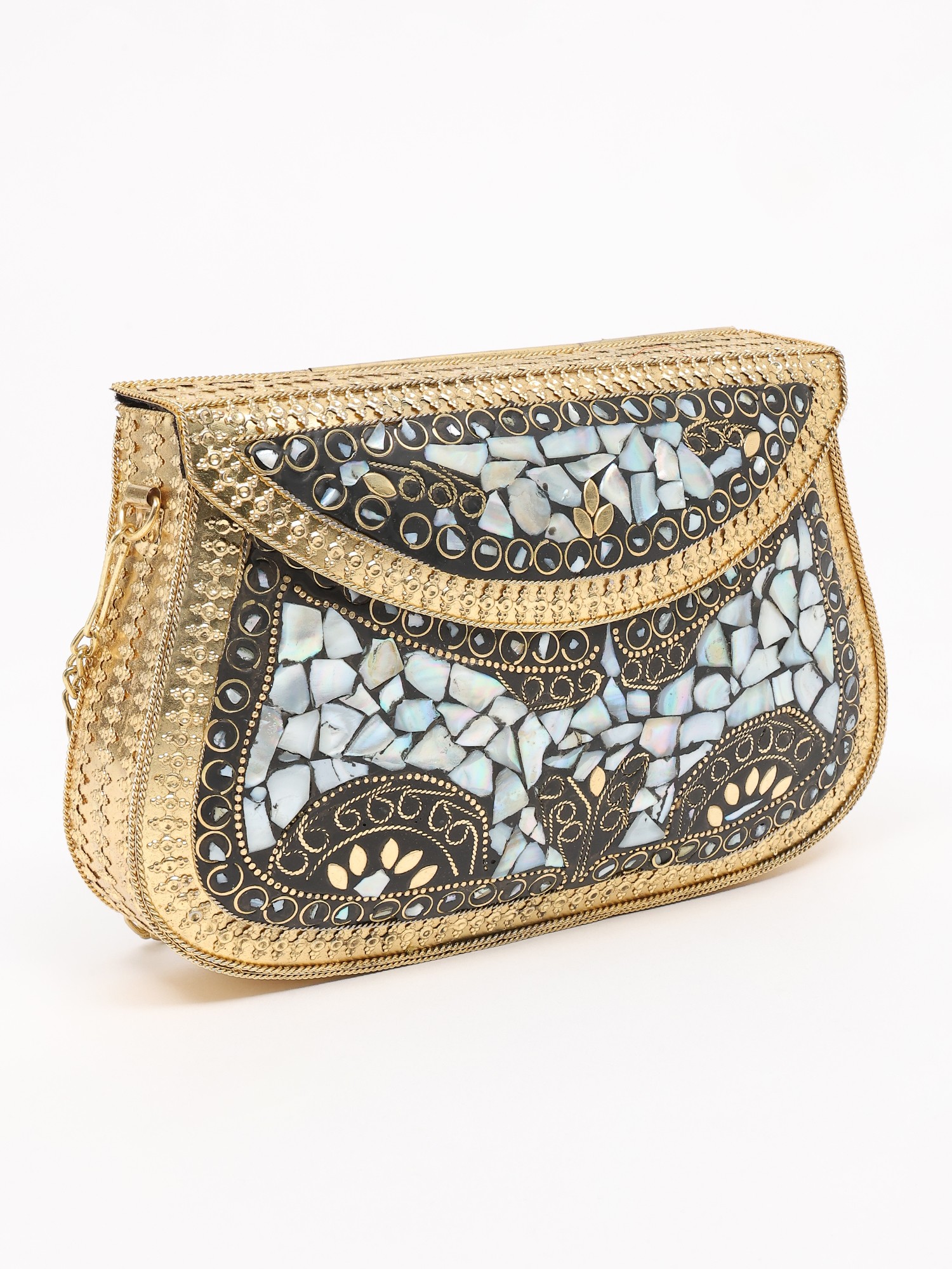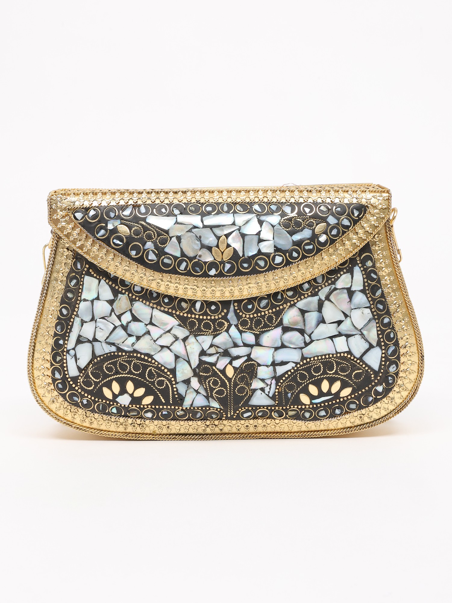 Multicolor Stone Studded Clutch Hand Bag with Detachable Chain Strap