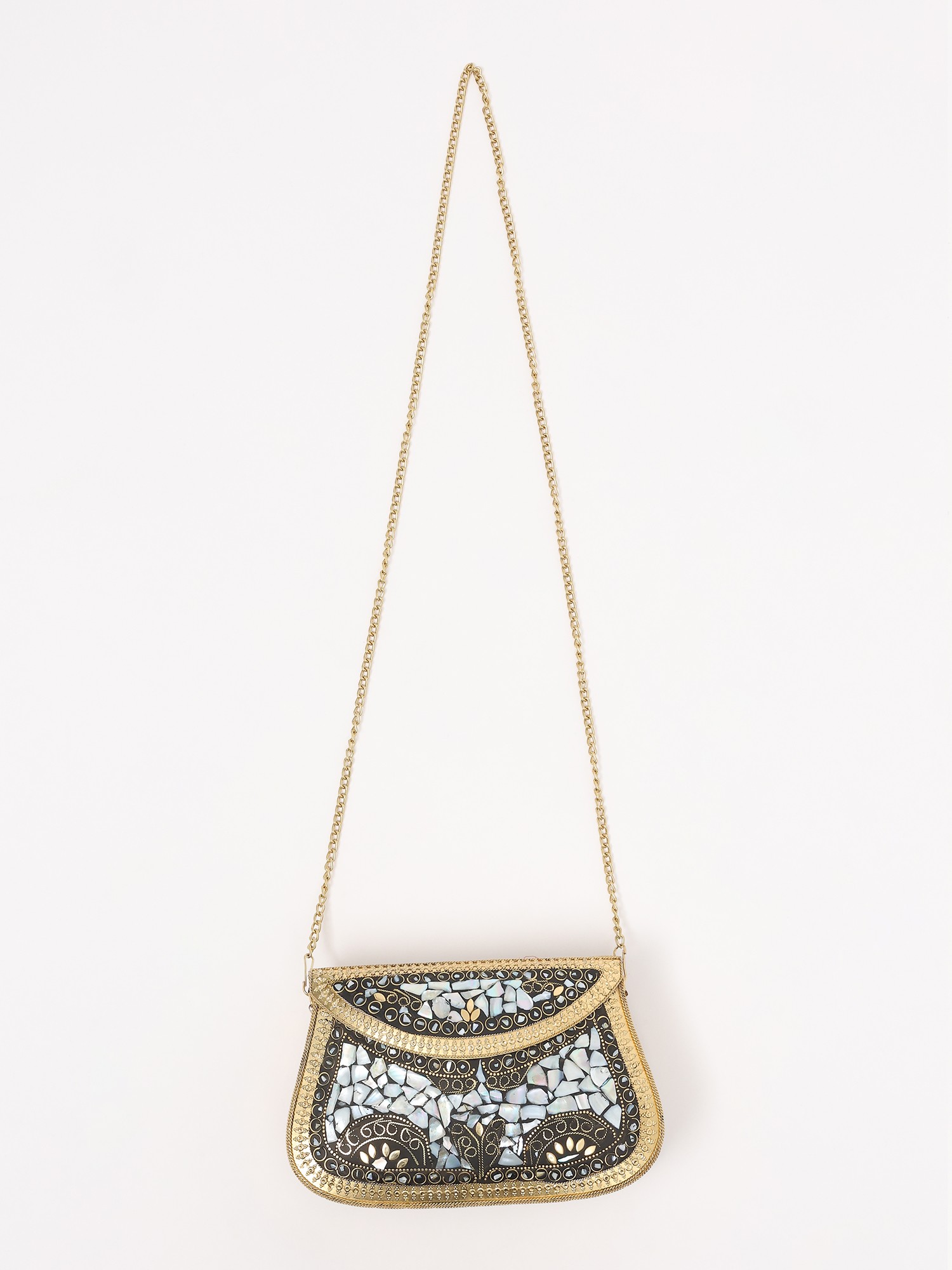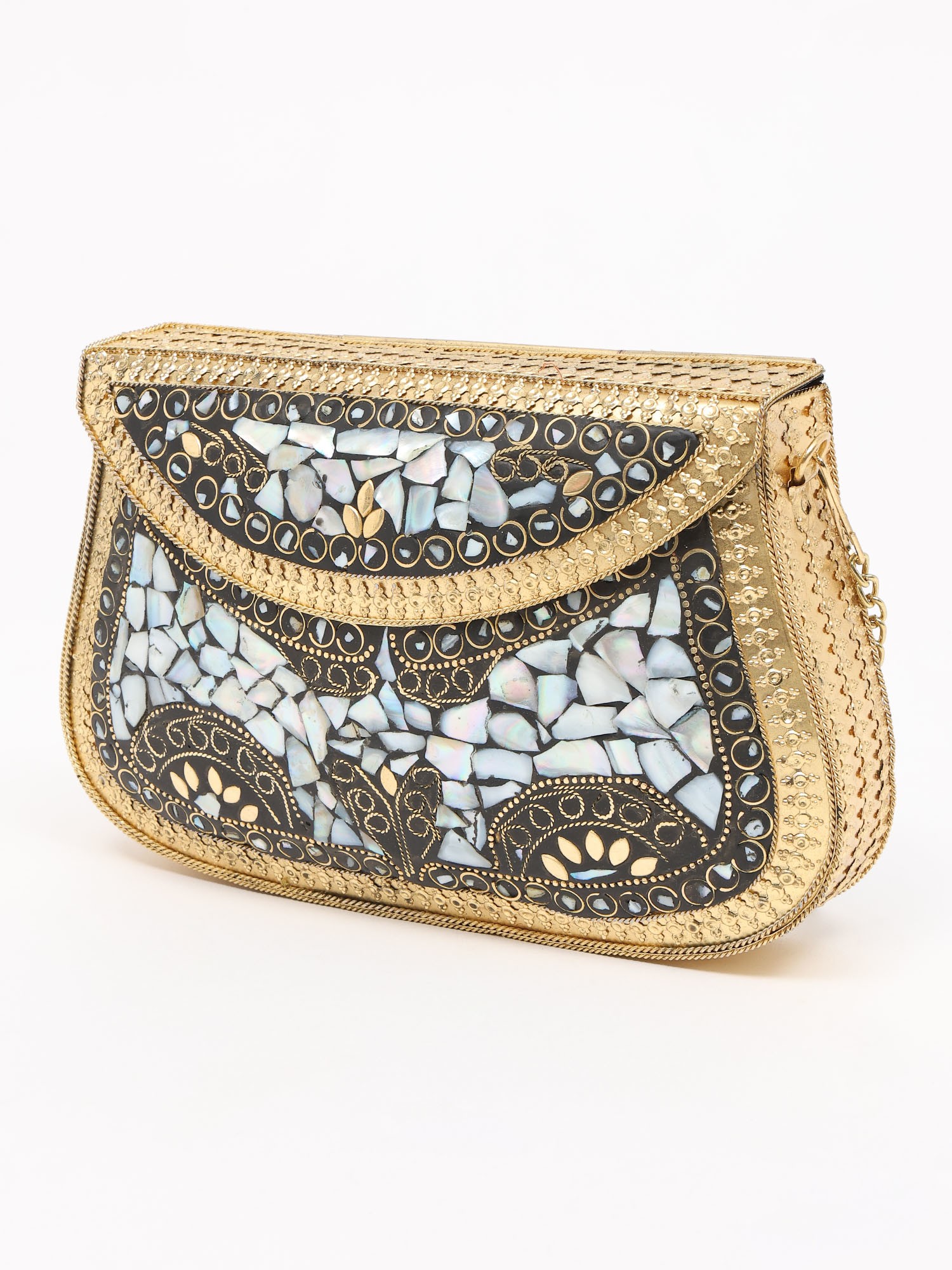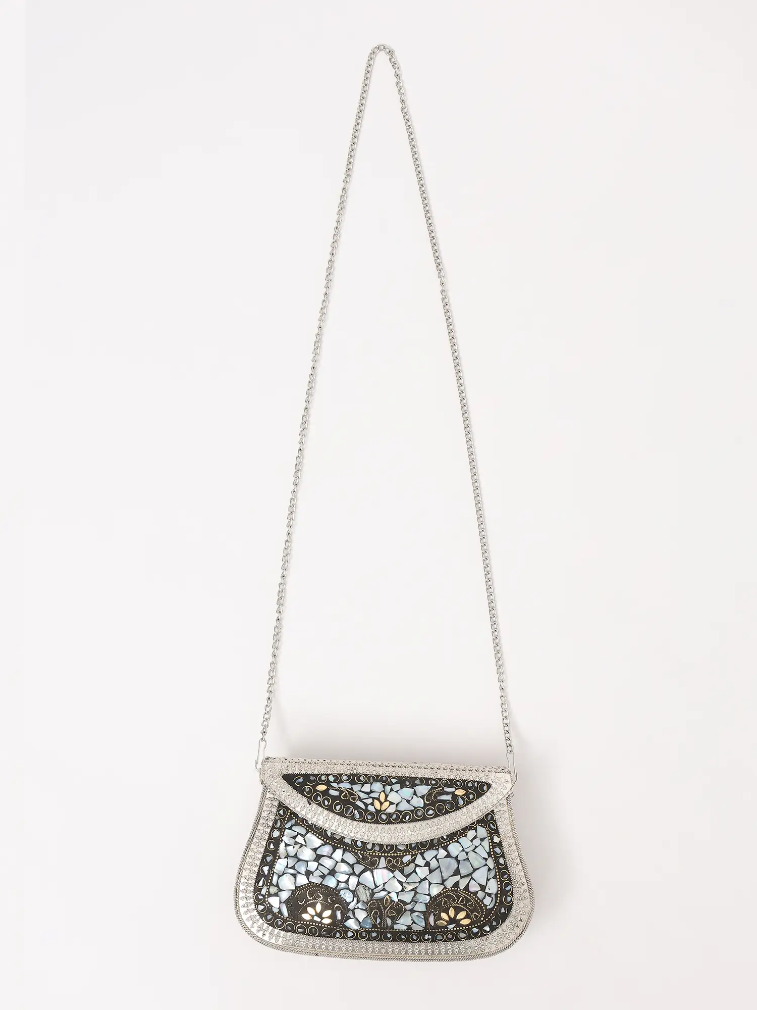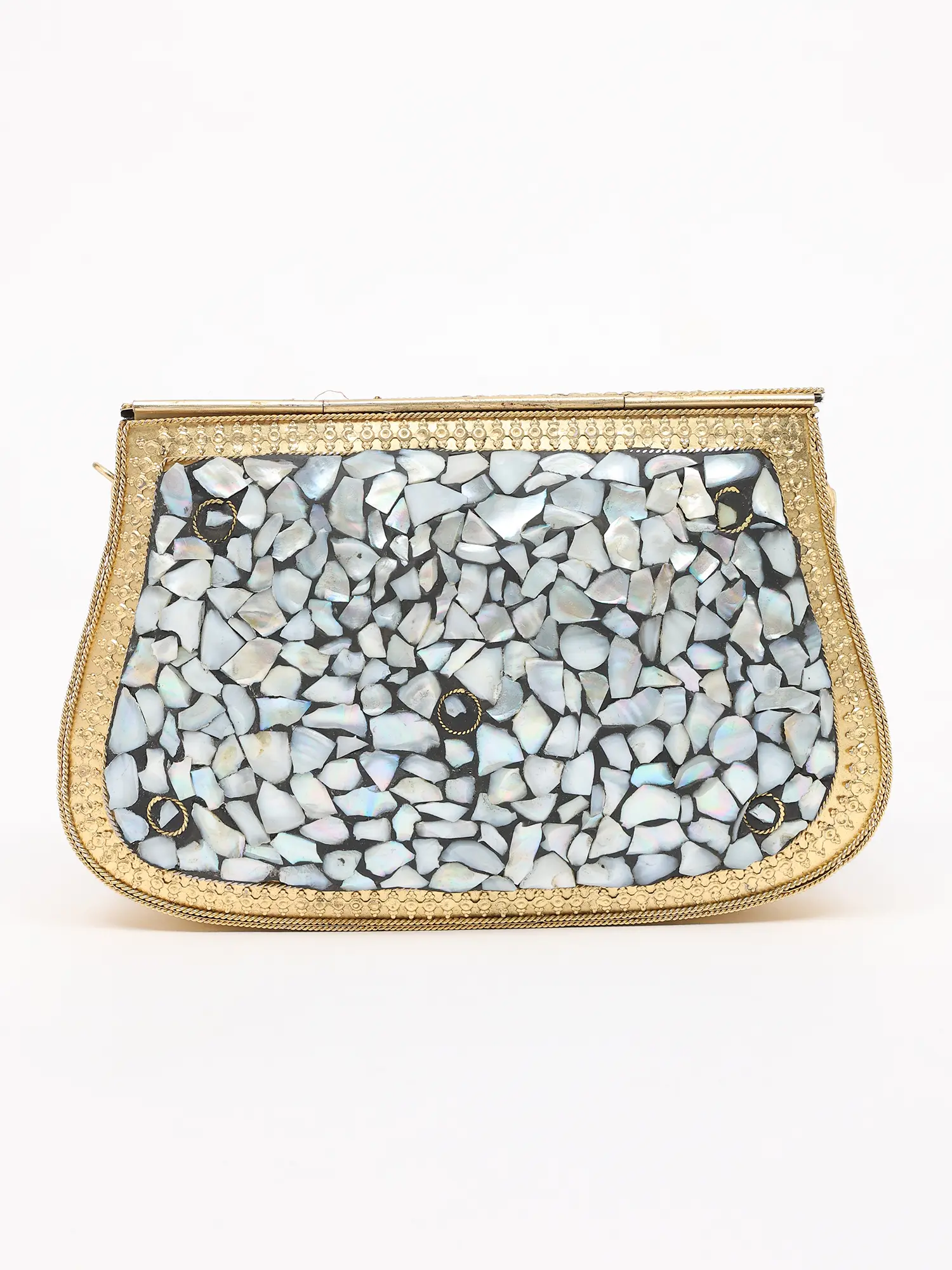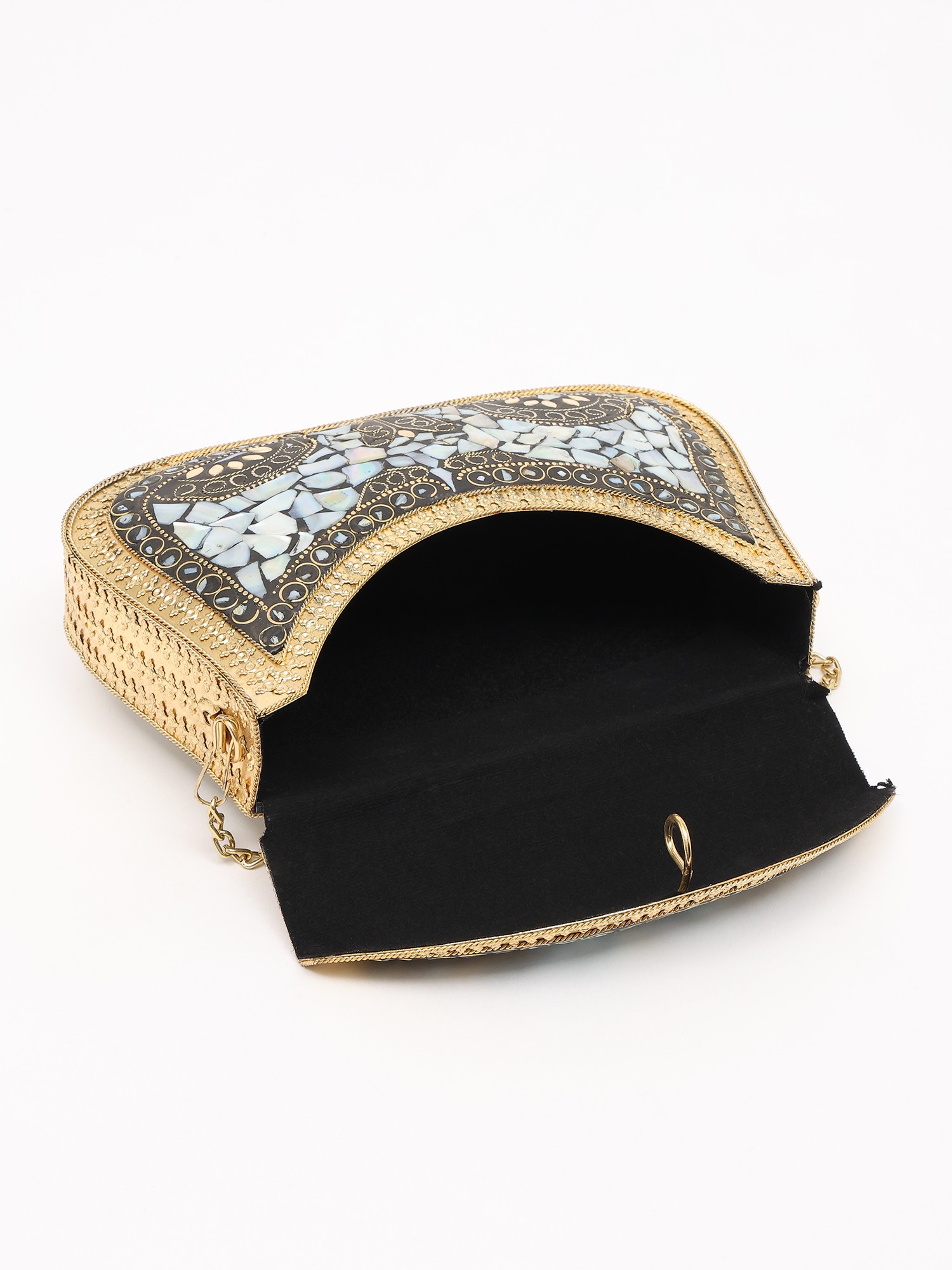 Multicolor Stone Studded Clutch Hand Bag with Detachable Chain Strap