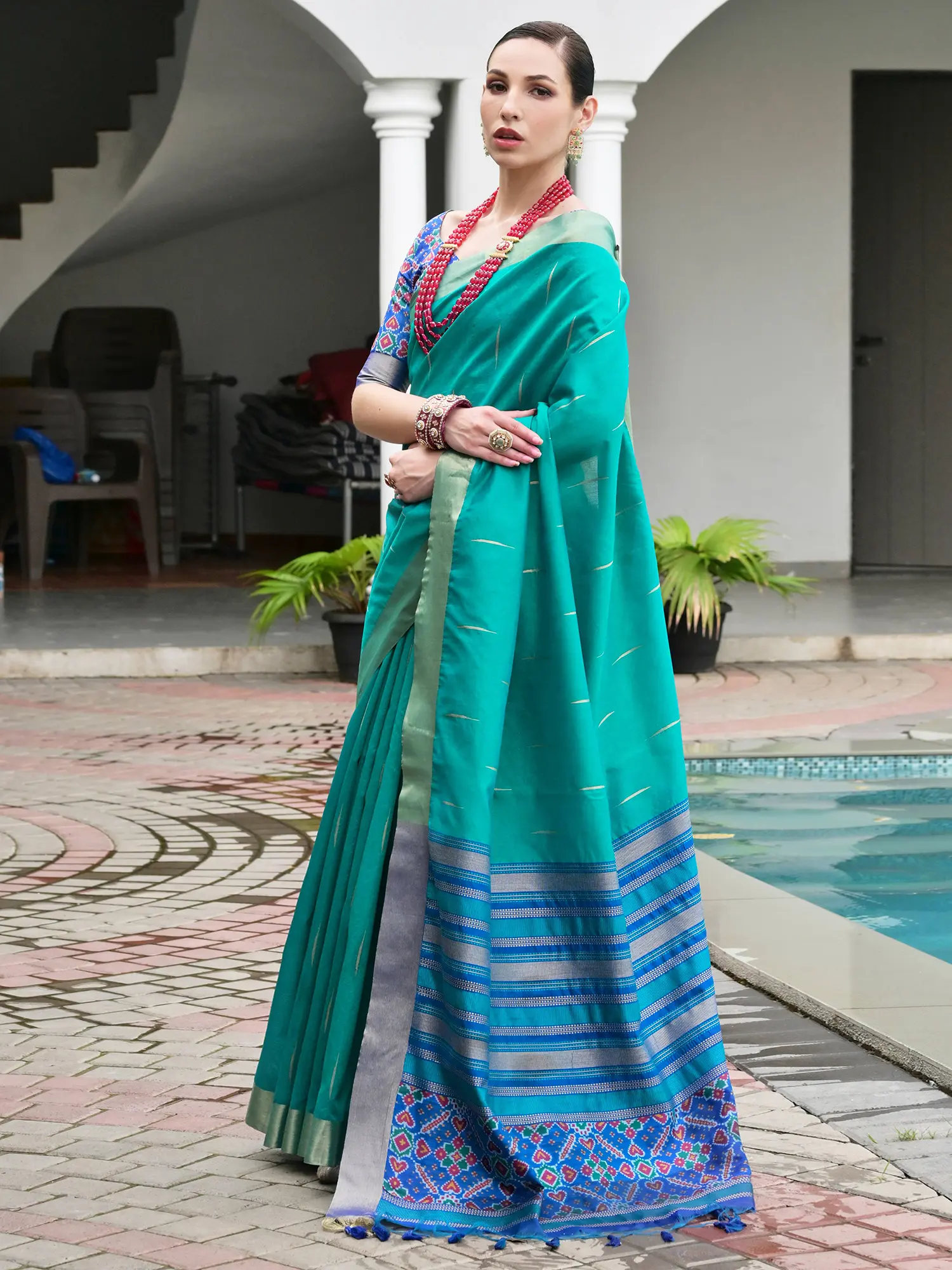 The lower part of the saree features a striking border that transitions into a vibrant display of woven patterns. Bands of warm oranges, soft pinks, and earthy tones create a dynamic stripe effect, leading the eye down to a beautifully patterned hem. Here, geometric motifs, possibly inspired by traditional Patola designs, are meticulously woven, showcasing a deep understanding of textile heritage. These intricate patterns are brought to life with pops of blues and greens, adding depth and character. The addition of delicate tassels at the hem further enhances the artisanal charm, adding a playful yet elegant touch. This saree is a testament to the enduring beauty of handwoven textiles, offering a unique blend of tradition and contemporary style.