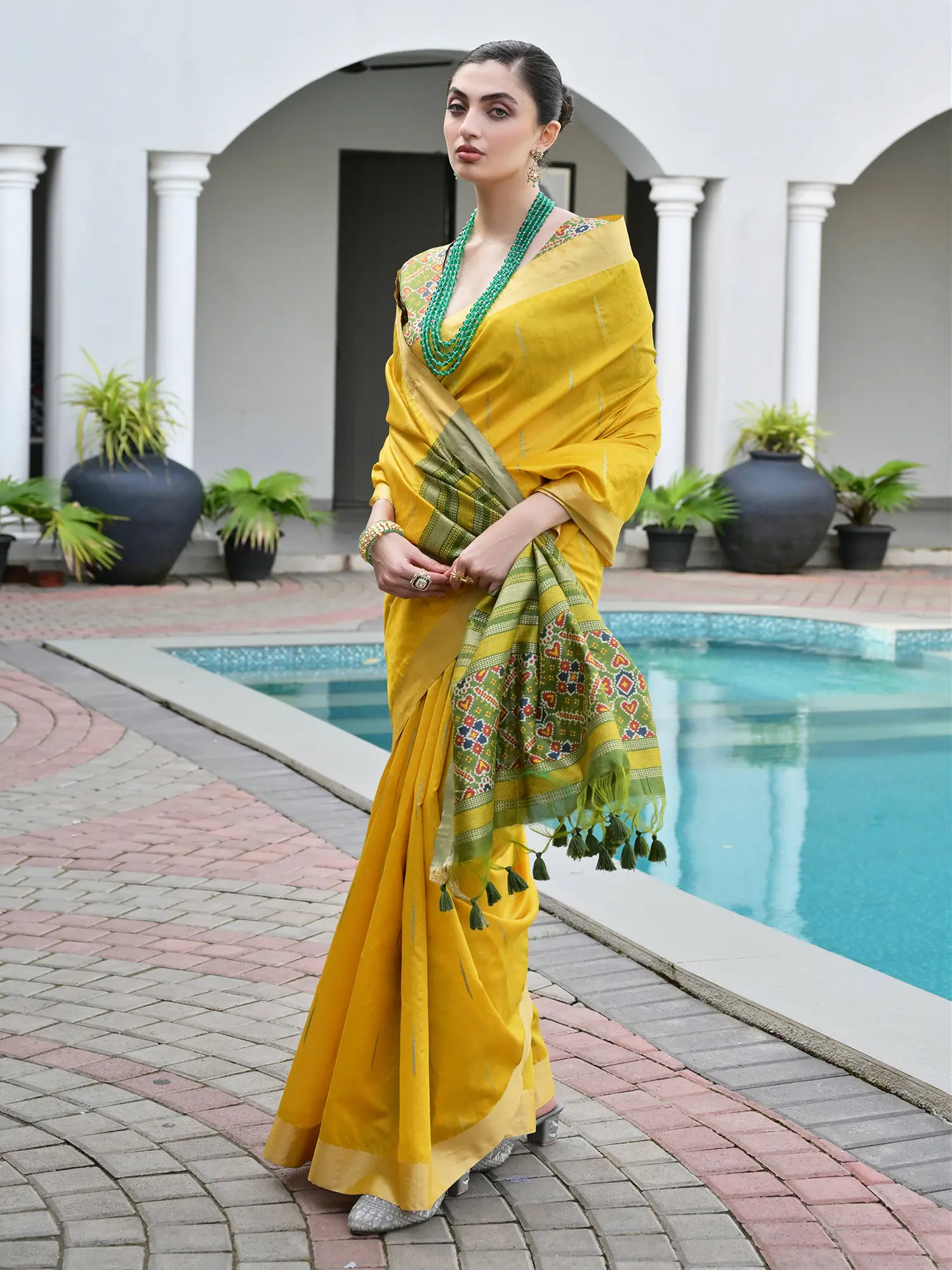 Blazing-Yellow Soft Silk Ikat Saree from Bangalore with Zari Border