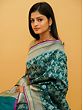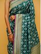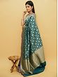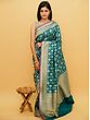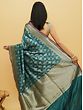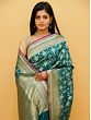 Jaal- the famed medieval Indian network of floral vines, used on the walls and ceilings of royal buildings to give them a heavenly appearance, is used in the decoration of this pure silk Banarasi saree whose enchanting blue tone reminds us of the olden days of the royals. The intricately handwoven Jaal pattern is made with the Sona-Rupa (gold and silver) method, which gives the field of the sari a magical visual effect. On the border, the patterns get thicker, instilling in the sari a deeper sense of affluence.